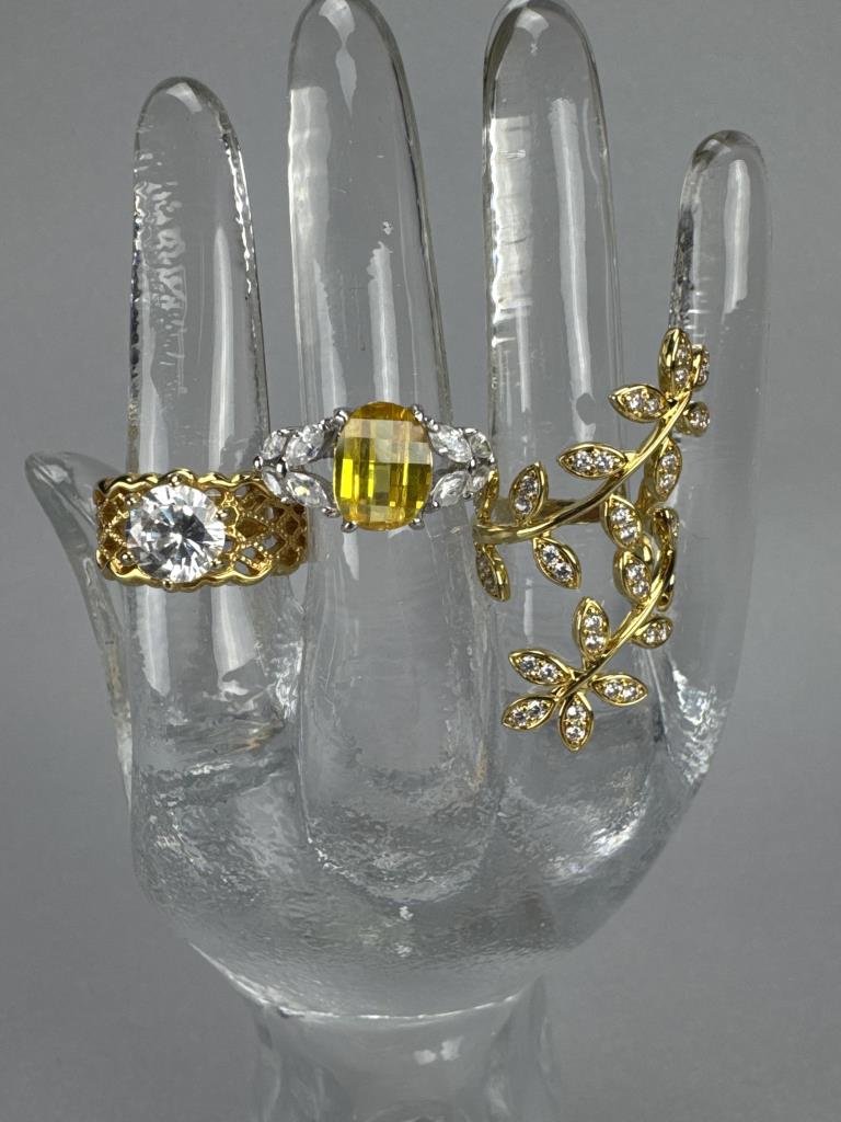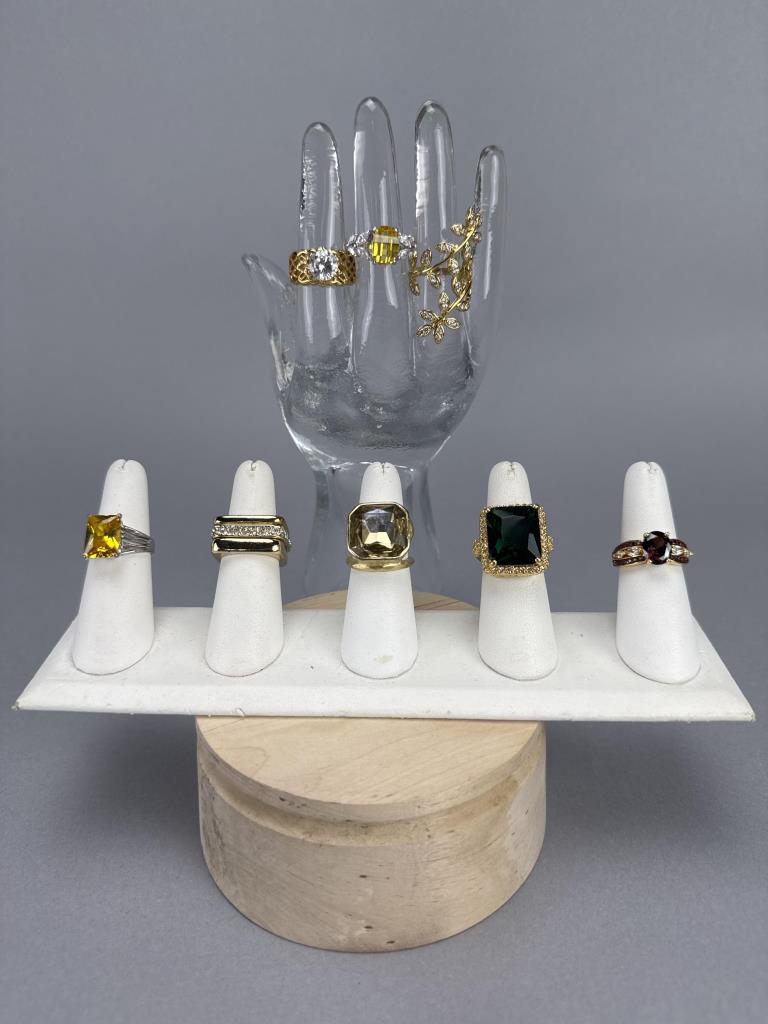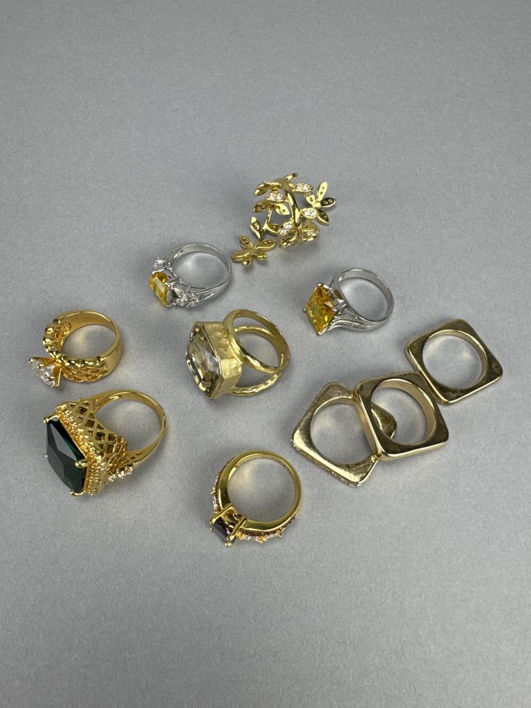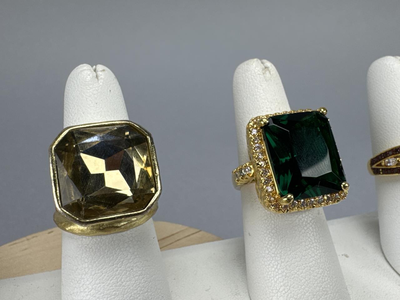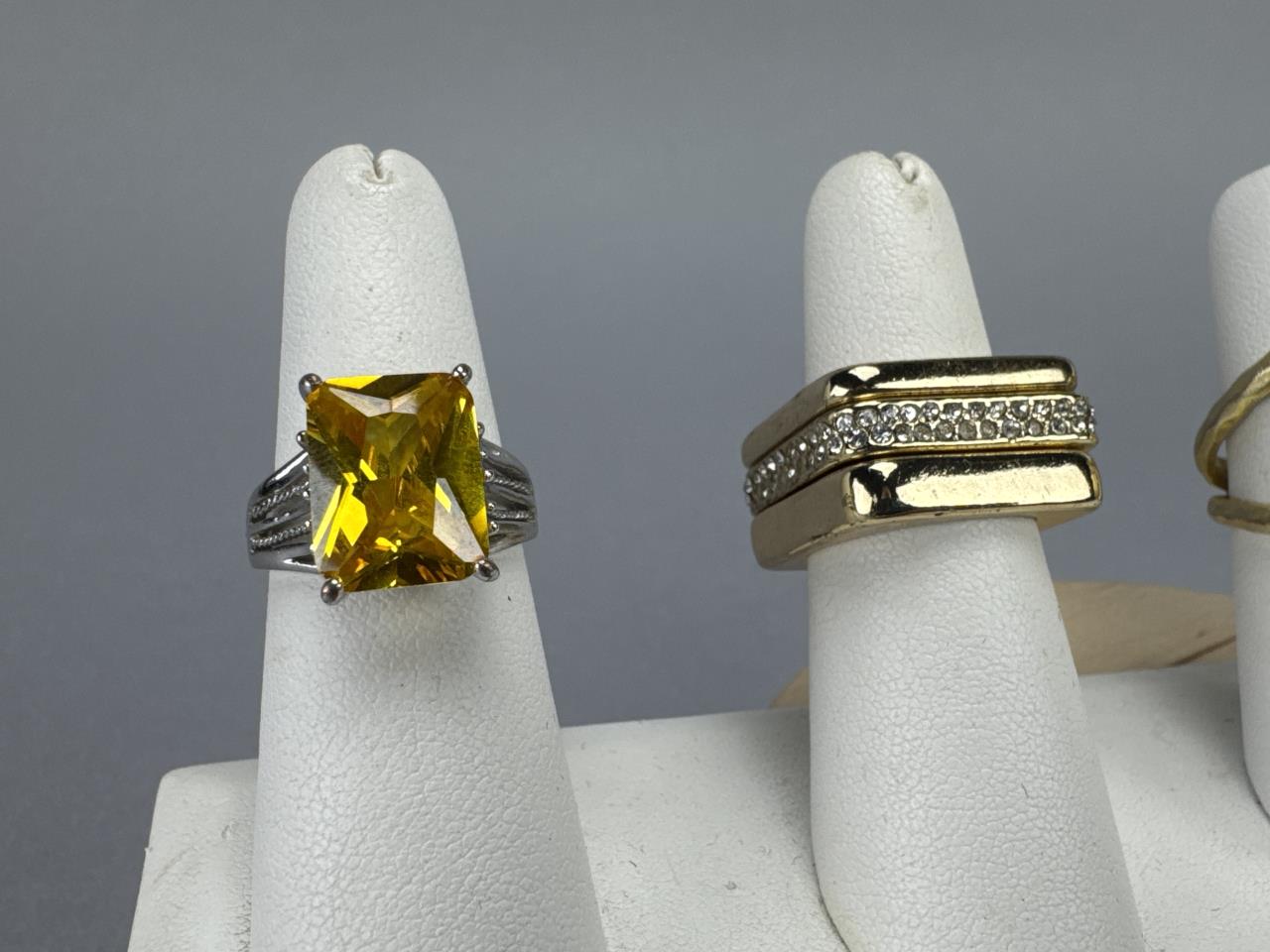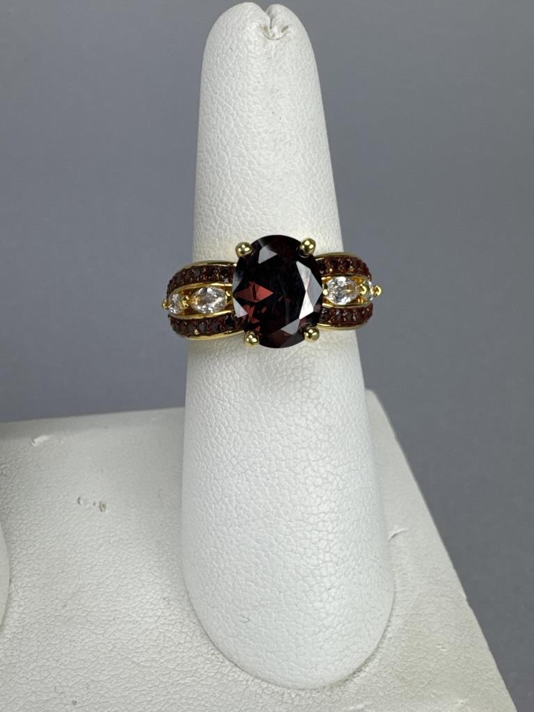 1 ring is size 6 and the rest are 7 or just under. Garnet colored ring is engraved Judith & Dennis on inside of shank.