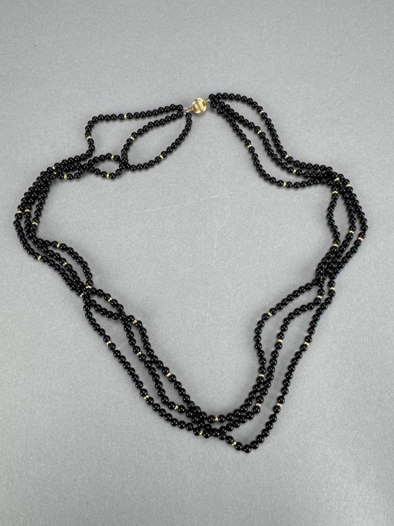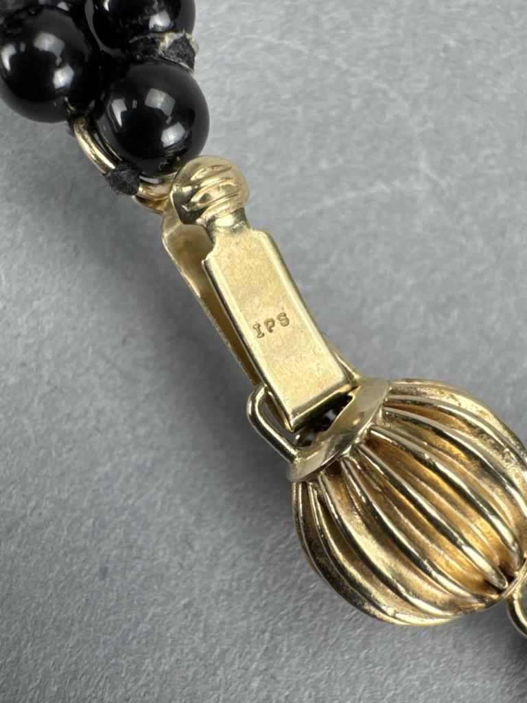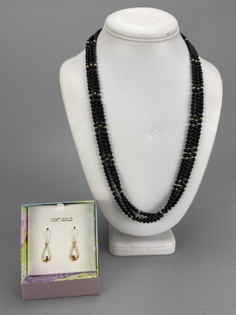 14K Clasp Black Glass Bead Necklace, 10K Earrings