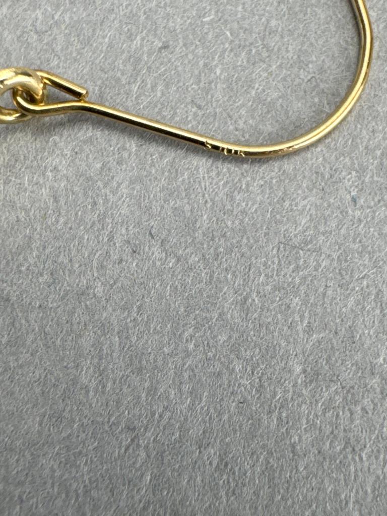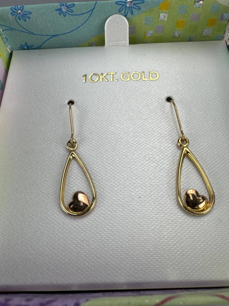 10K yellow gold oval hoop with rose gold heart dangle earrings, 0.3 grams.