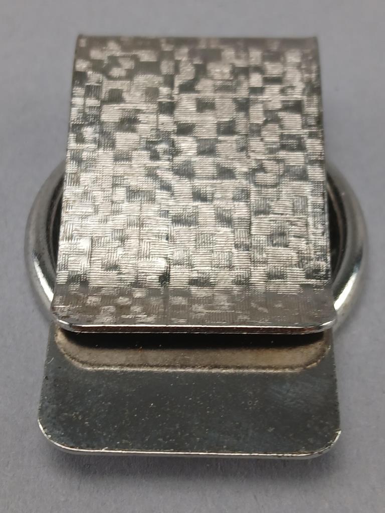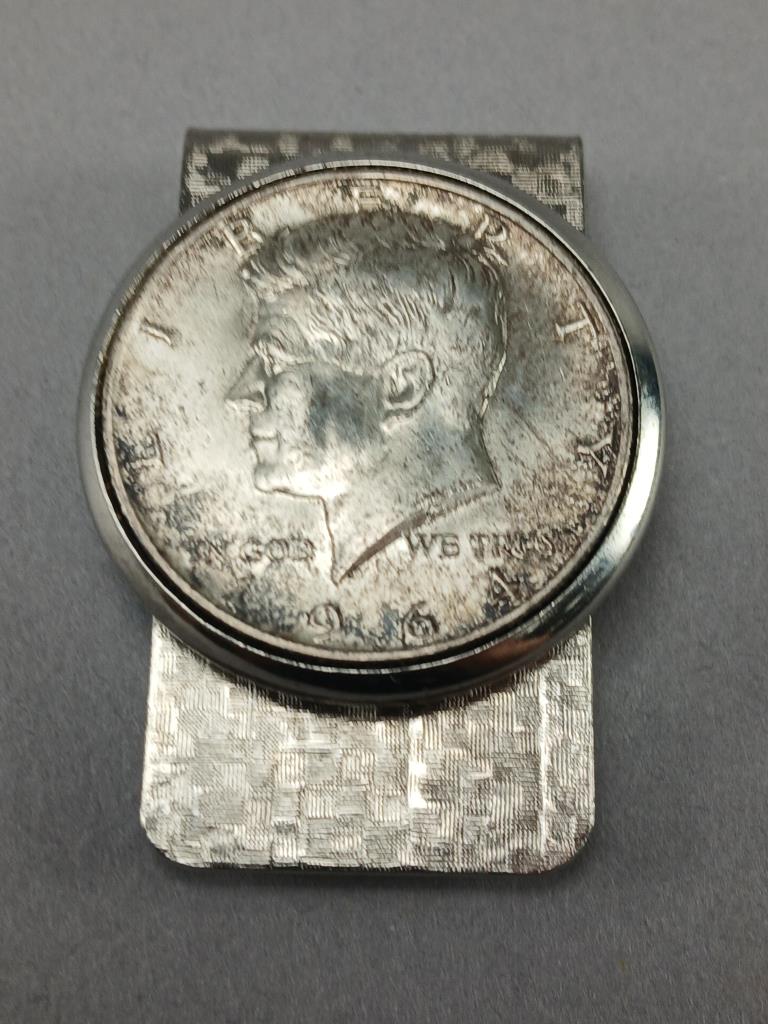 Silver dollar money clip with Kennedy half dollar.