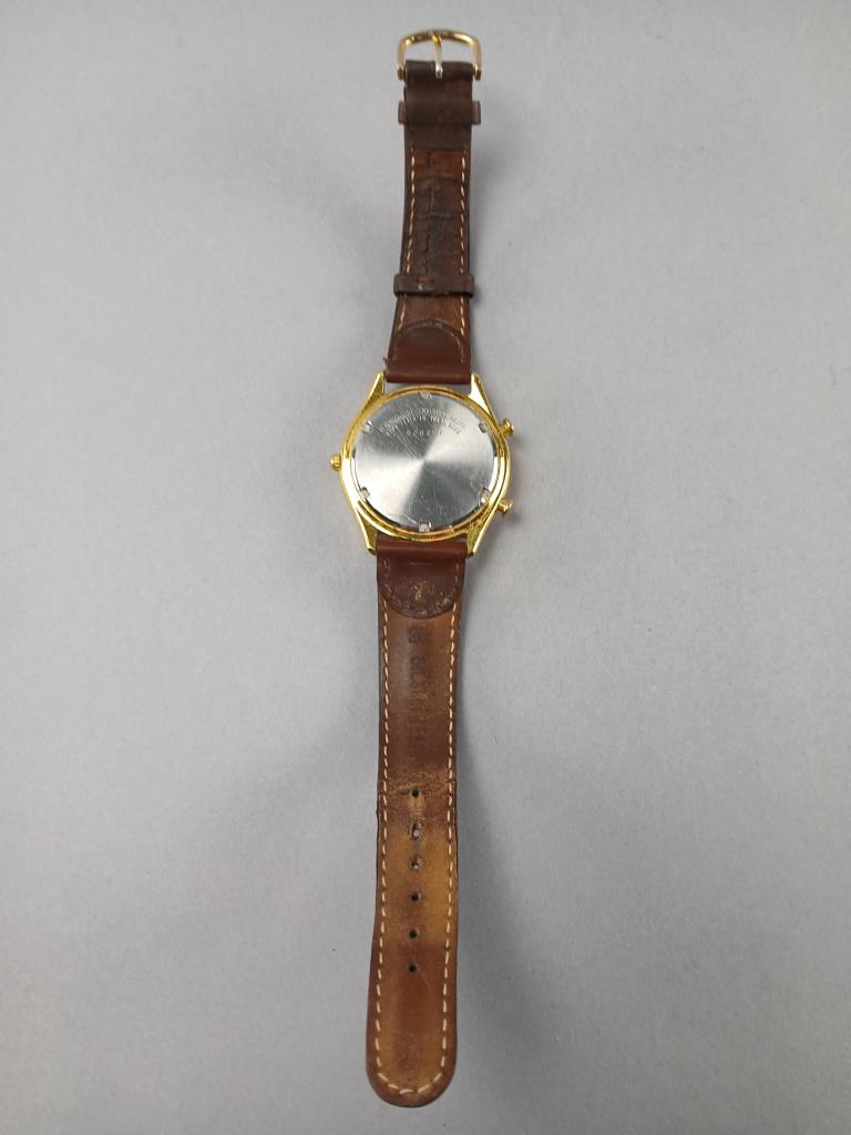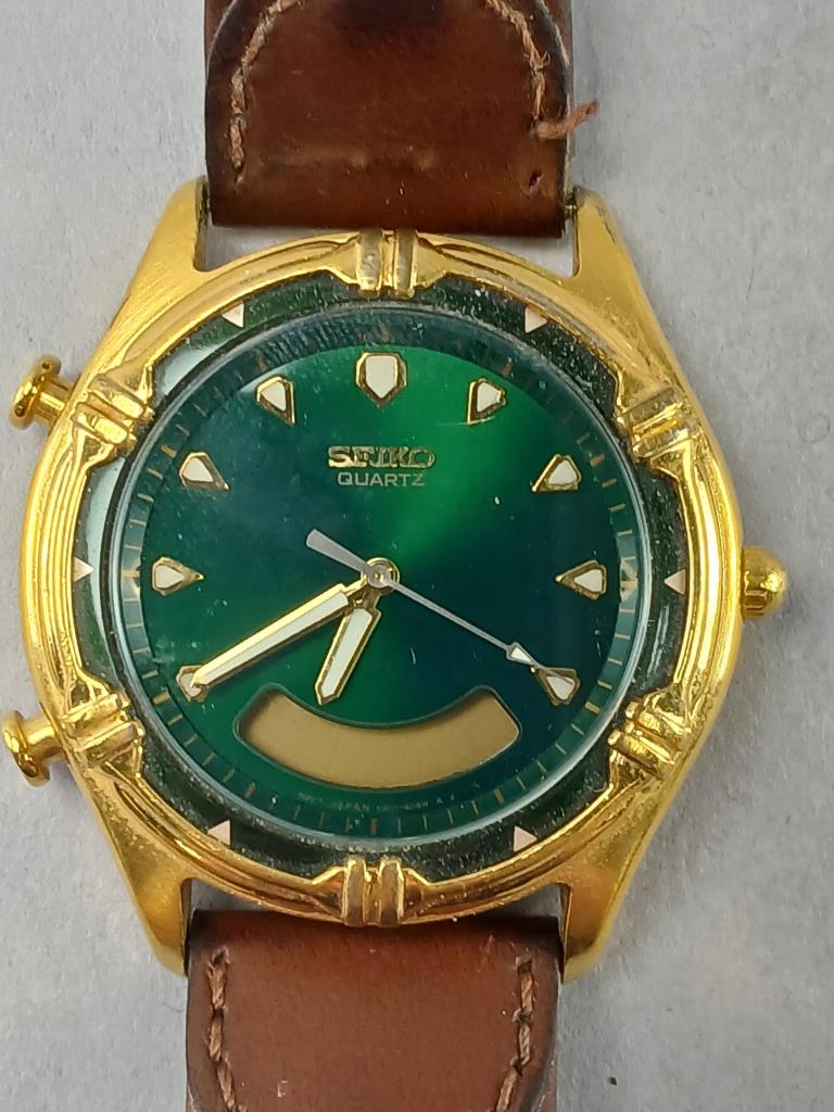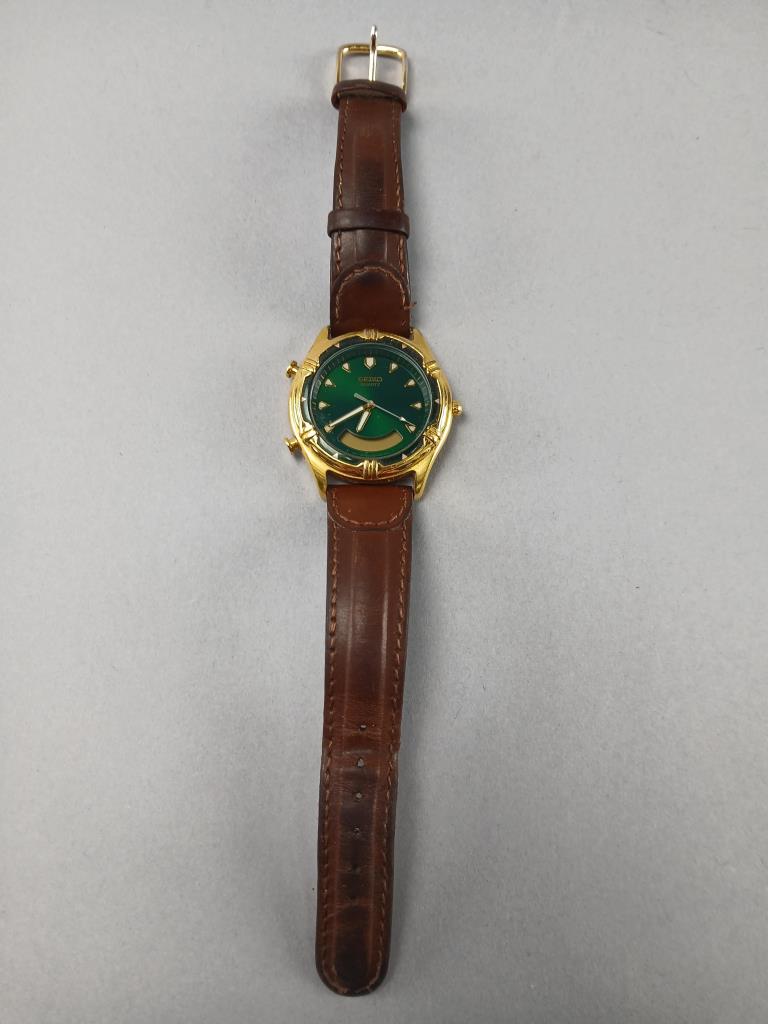 Seiko analog watch featuring green dial with leather strap. Alarm and chronological functions. Marked H801-6098. Not tested.