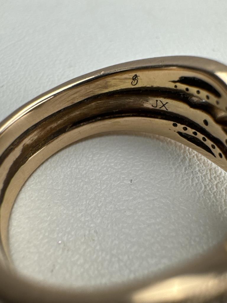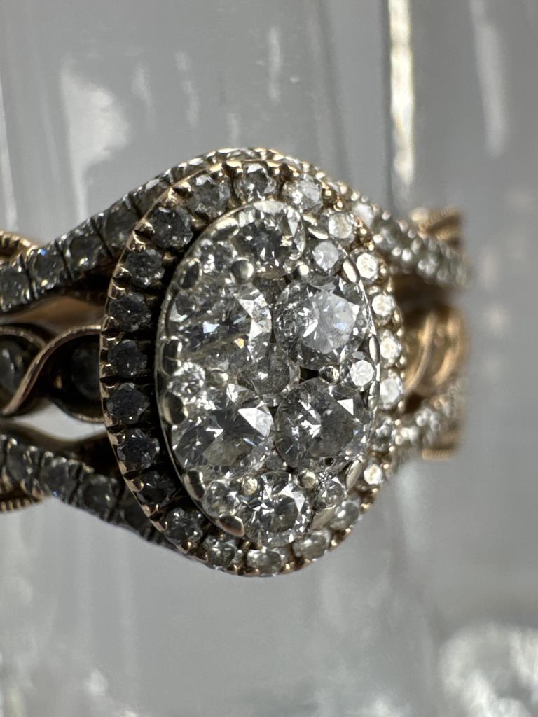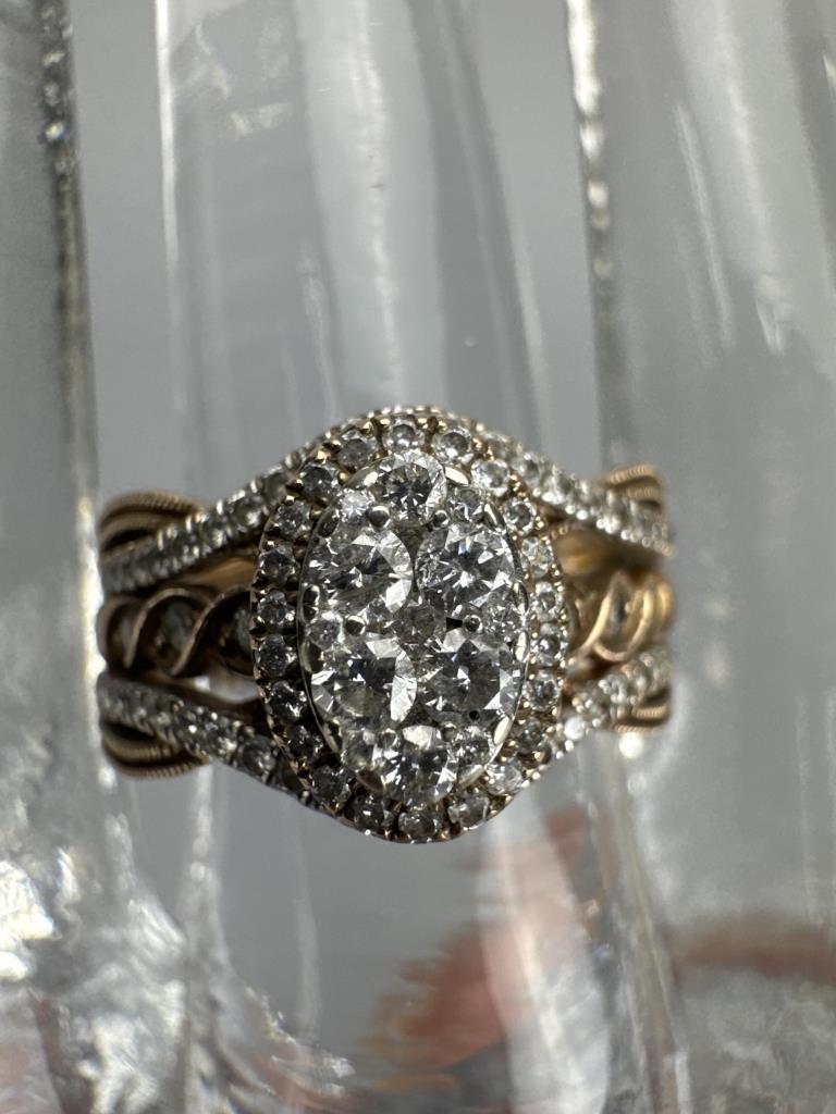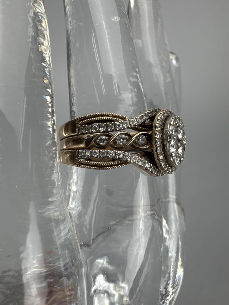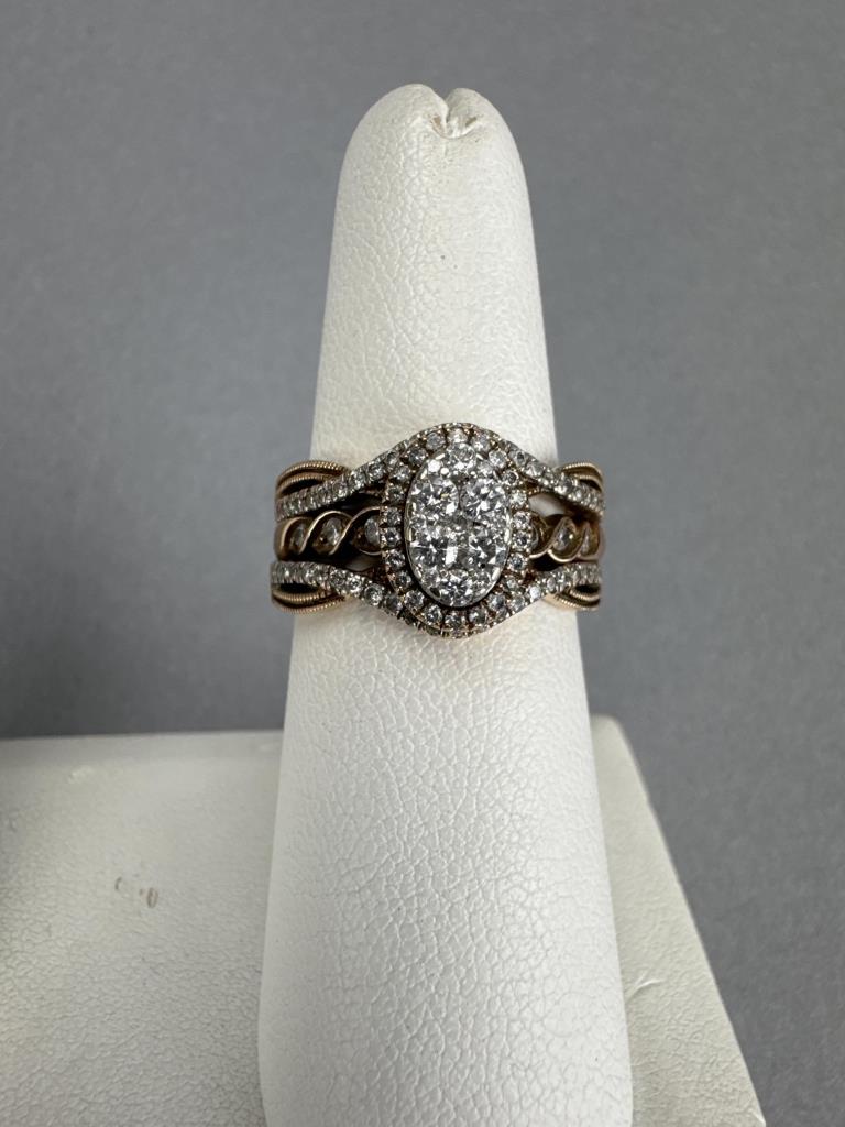 Center ring is 10K and outside bands are 14K. Approximately 92 round diamonds, 78 diamonds are approx. 0.0075 carats each, 4 diamonds are approx. 0.04-0.05 carats each and 10 diamonds are 0.03-0.04 carats each. Estimated 1.00-1.25 carats total weight in diamonds. Ring is size 7 and weighs approx. 7.7 grams total.