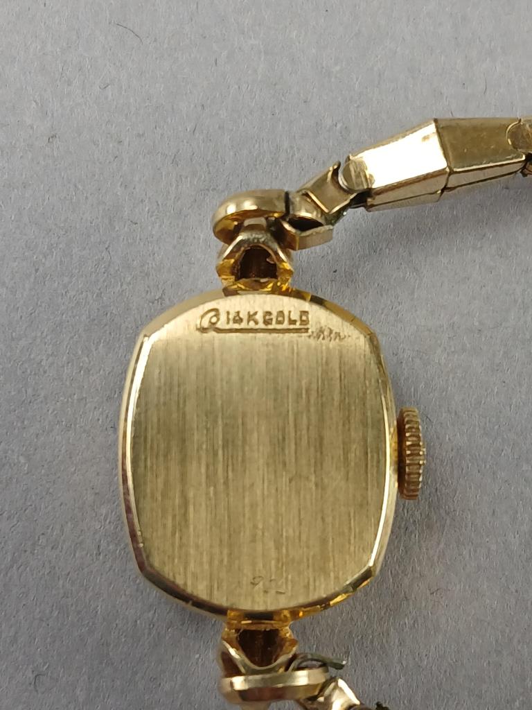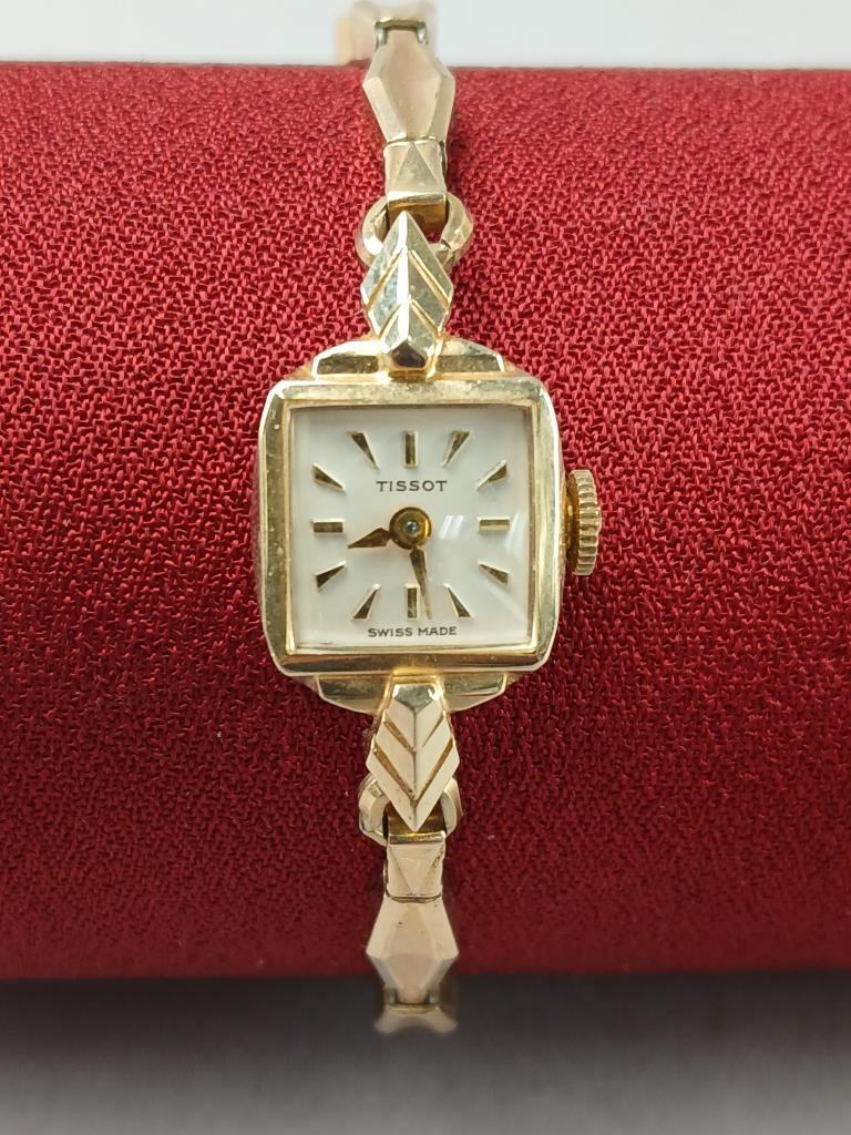 14K Gold women’s watch by Tissot. Small size, has stretch band. Measures 7″and not tested.