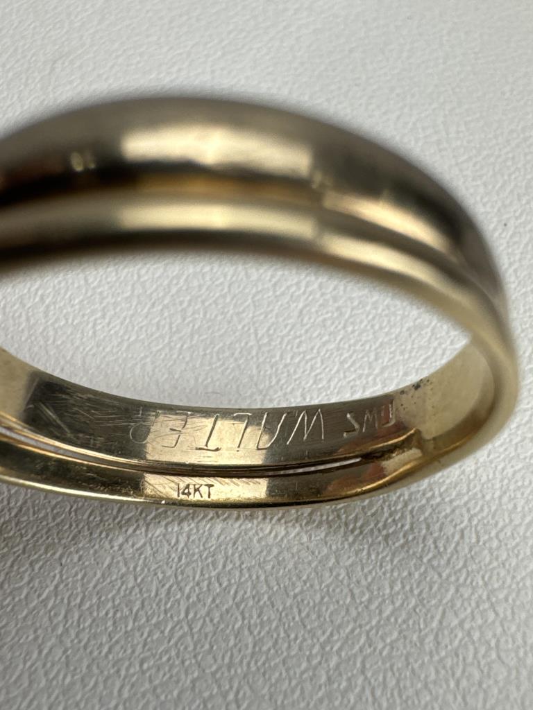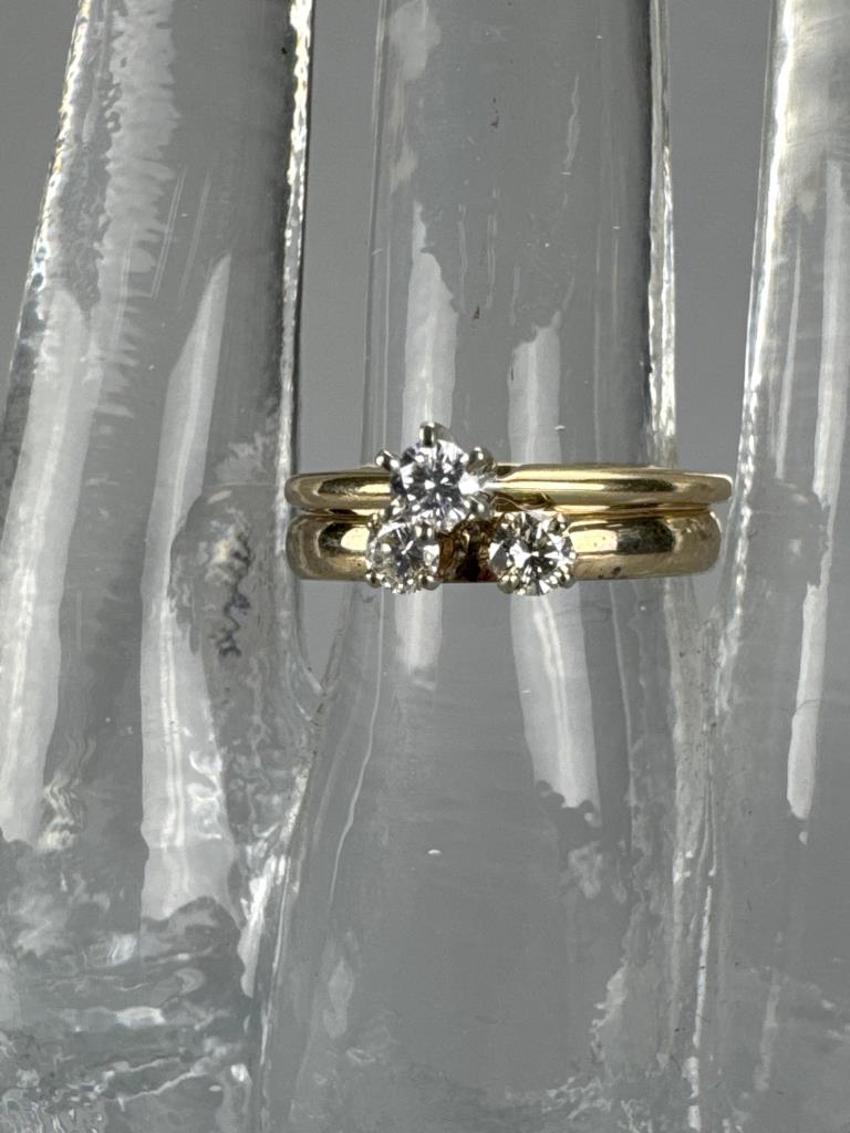 One ring is marked 14K, three diamonds approx. 0.11 carat each, size 7 1/2, and weighs 3.4 grams