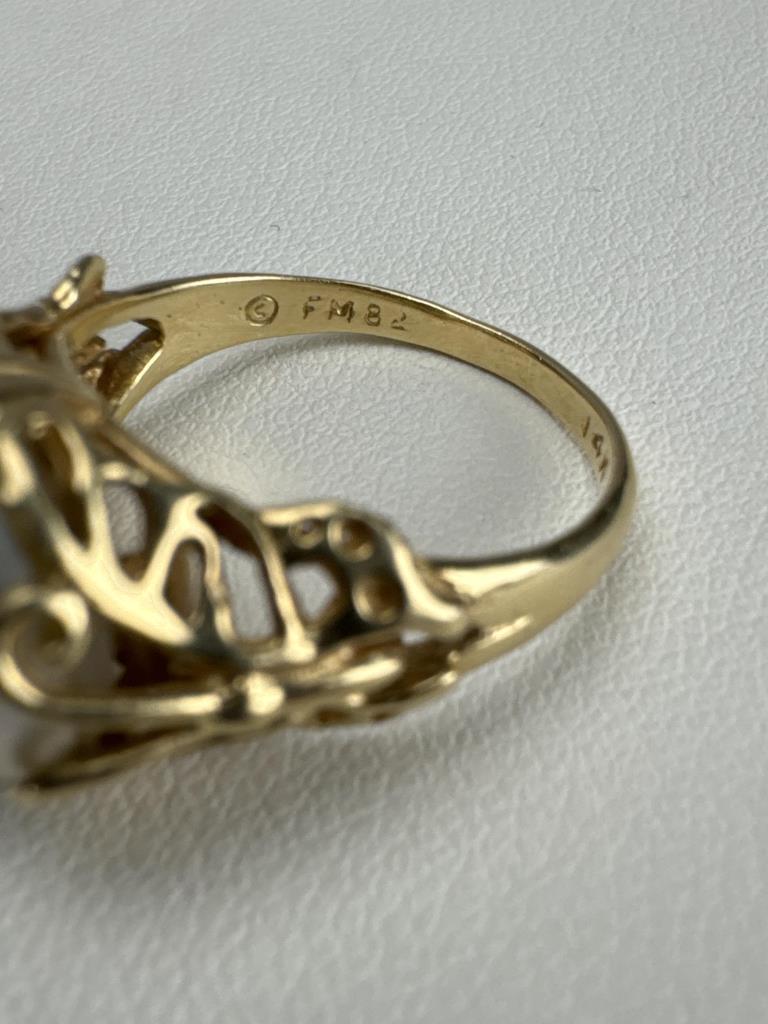 Band is marked Copyright symbol FM 82 14K H M, size 6, and weighs approx. 4.6 grams.