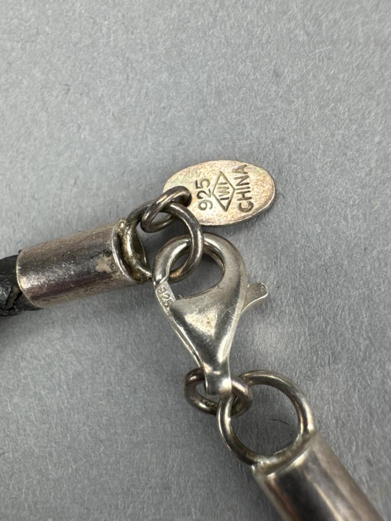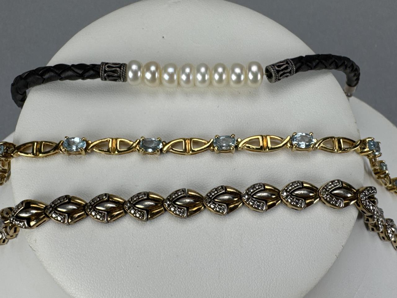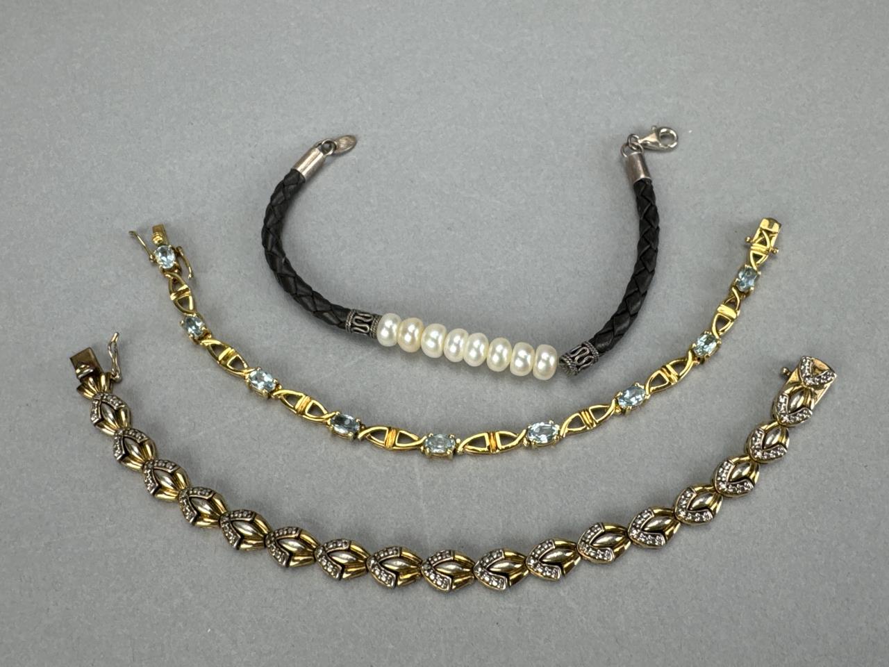 7 inch gold over silver 5 diamond chip bracelet marked 925 CHINA-weighs 20.2 grams. 7 1/4 inch gold over silver Blue Topaz bracelet marked 925 JJT (Jay Jewelry Thailand) and weighs 10.5 grams. 7 inch sterling silver cultured freshwater pearl leather bracelet marked 925 IWI (International Watchman Inc.) in diamond shape CHINA and weighs 7.2 grams.