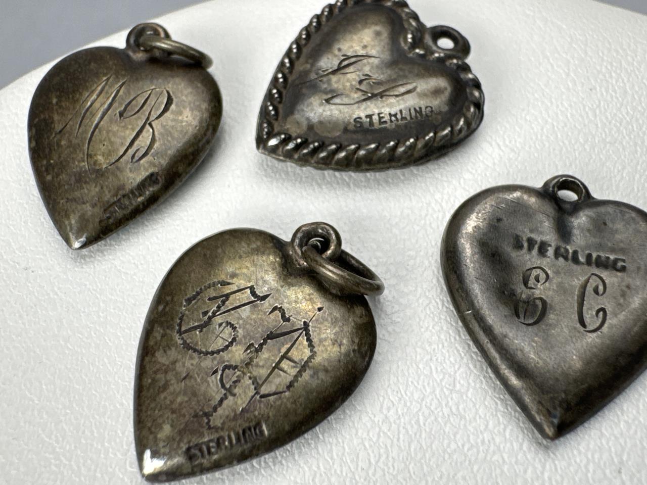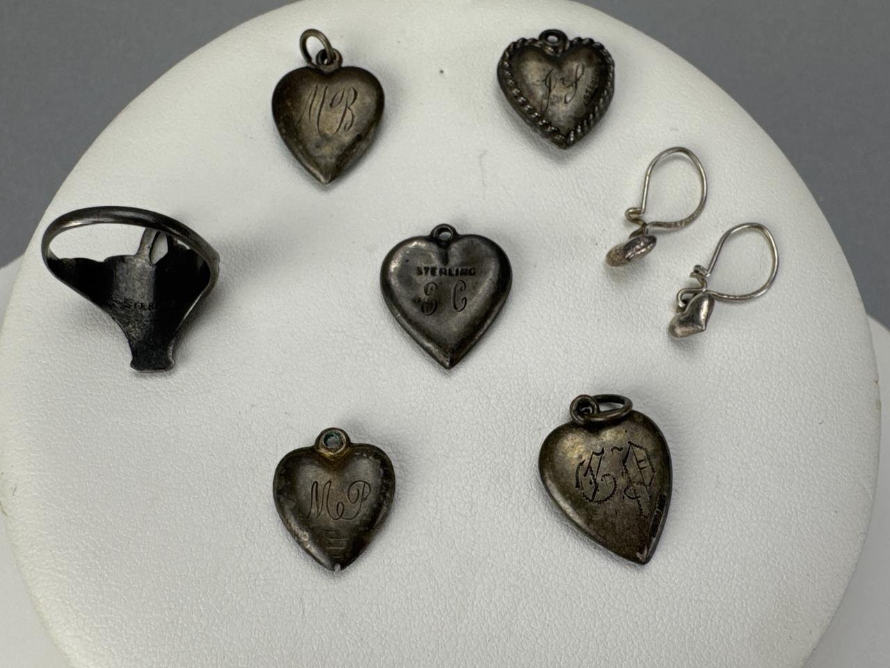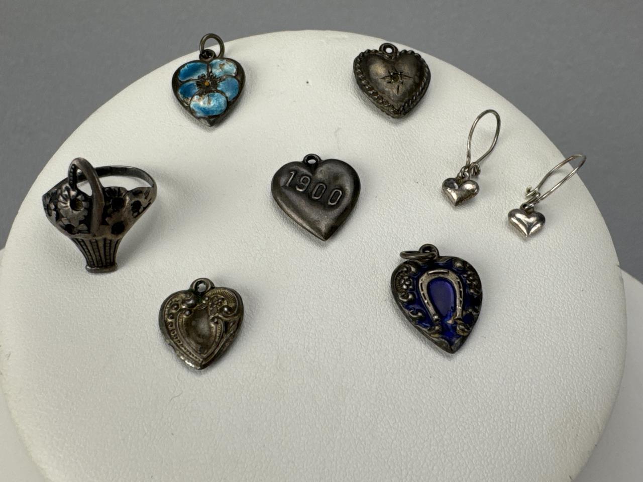Seven antique sterling pieces including five Victorian-early 20th century heart charms (engraved examples, a dated 1900 heart, and two enamel-decorated hearts), pair of 1920s heart earrings stamped ‘EST. 1880’ and one basket of flowers ring – size 5 – retaining one original paste stone. 7.3 grams total weight.