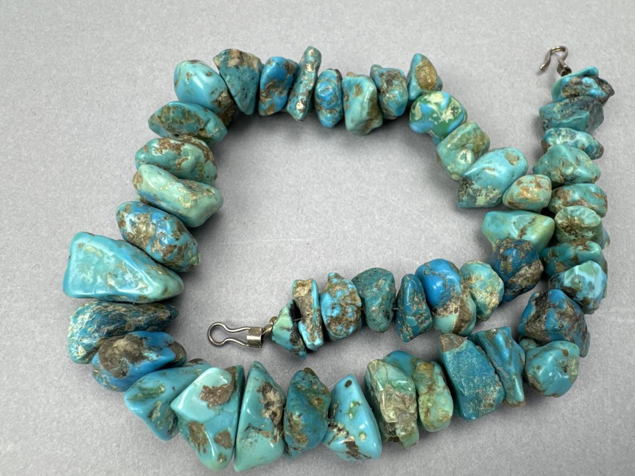 15 inch turquoise nugget choker necklace, clasps tests silver, and weighs approx. 92.8 grams.