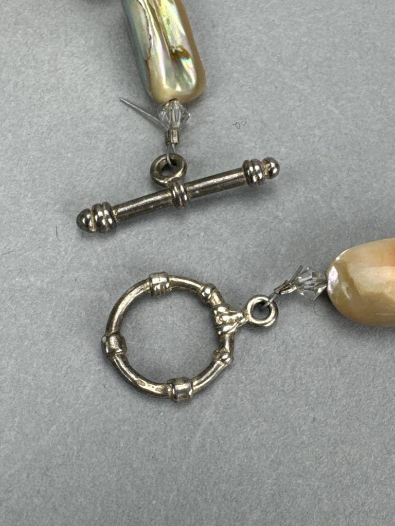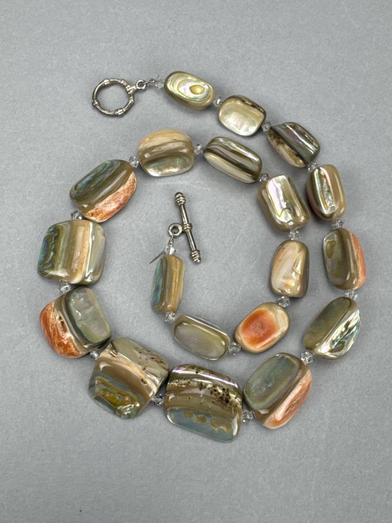 19 inch shell & Abalone composite necklace, toggle clasp tests silver, and weighs approx. 75.1 grams.