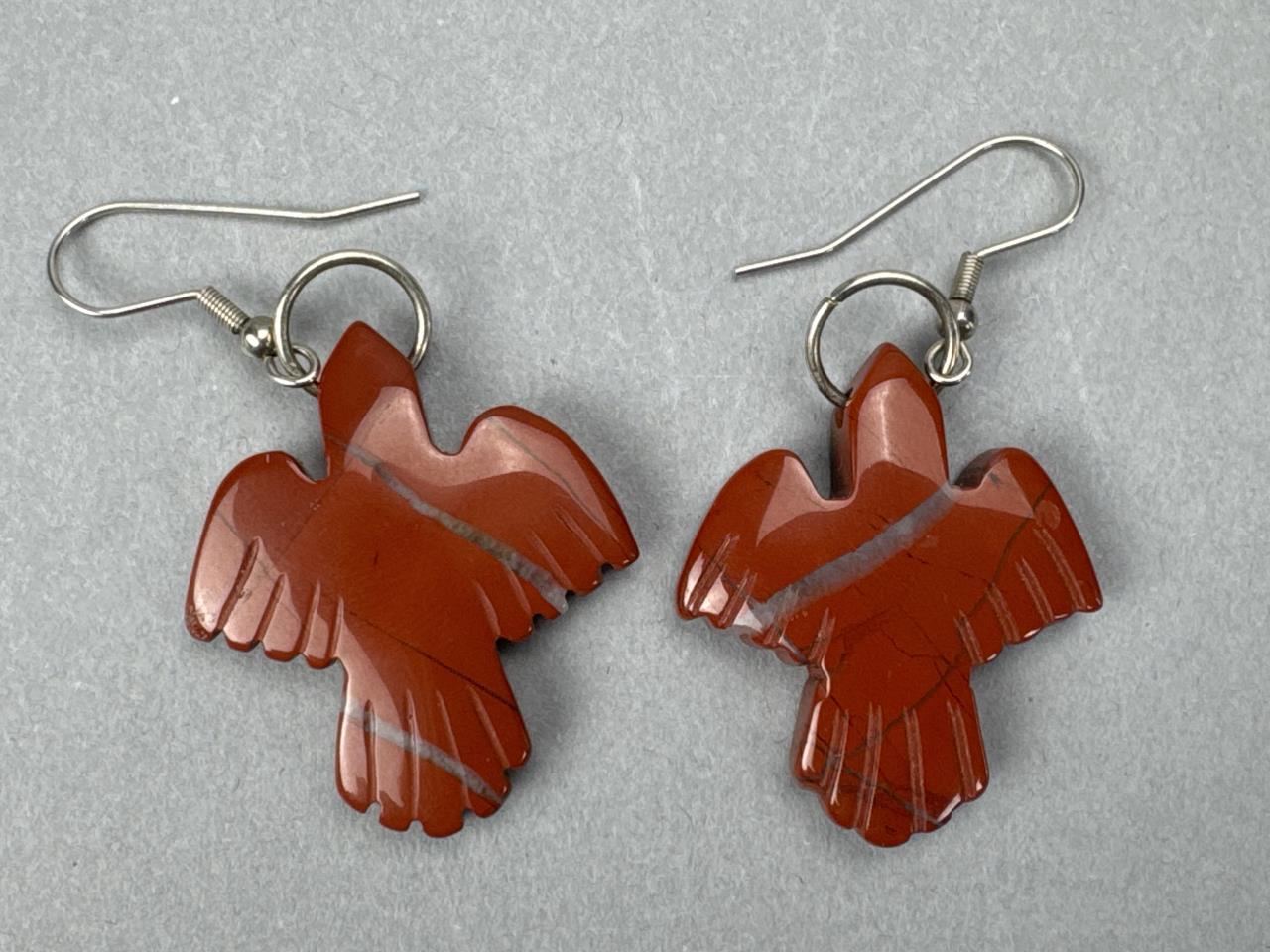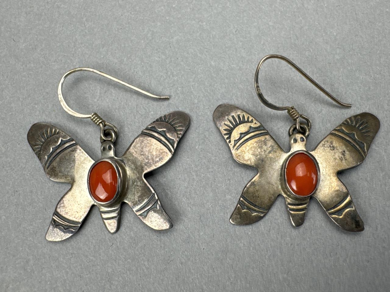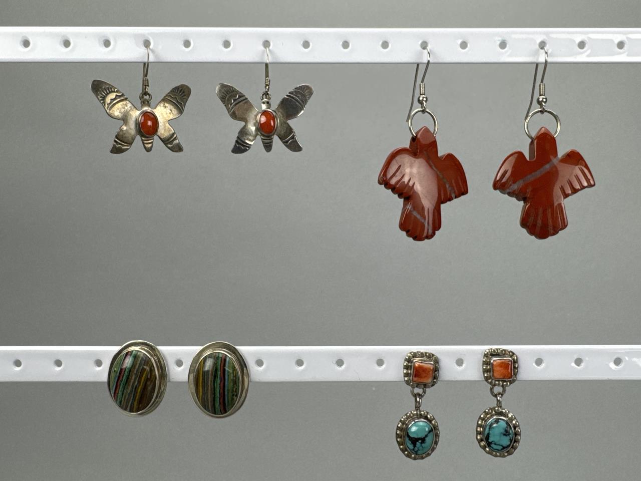 Rainbow calsilica or Fordite man made stones, marked STERLING E.P. and weighs approx. 8.8 grams total w/backs. Turquoise and coral earrings marked STERLING T. BENALLY and weighs 6.3 grams total w/o backs. Carved Jasper thunderbird (sacred bird) dangle earrings, weighs approx. 14.7 grams total. Marked Sterling butterfly cabochon coral earrings, weighs approx. 4.1 grams total.