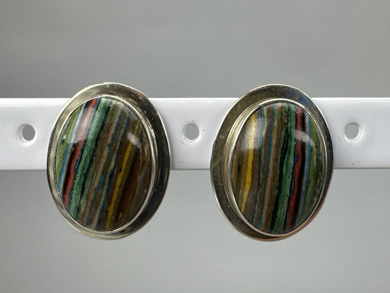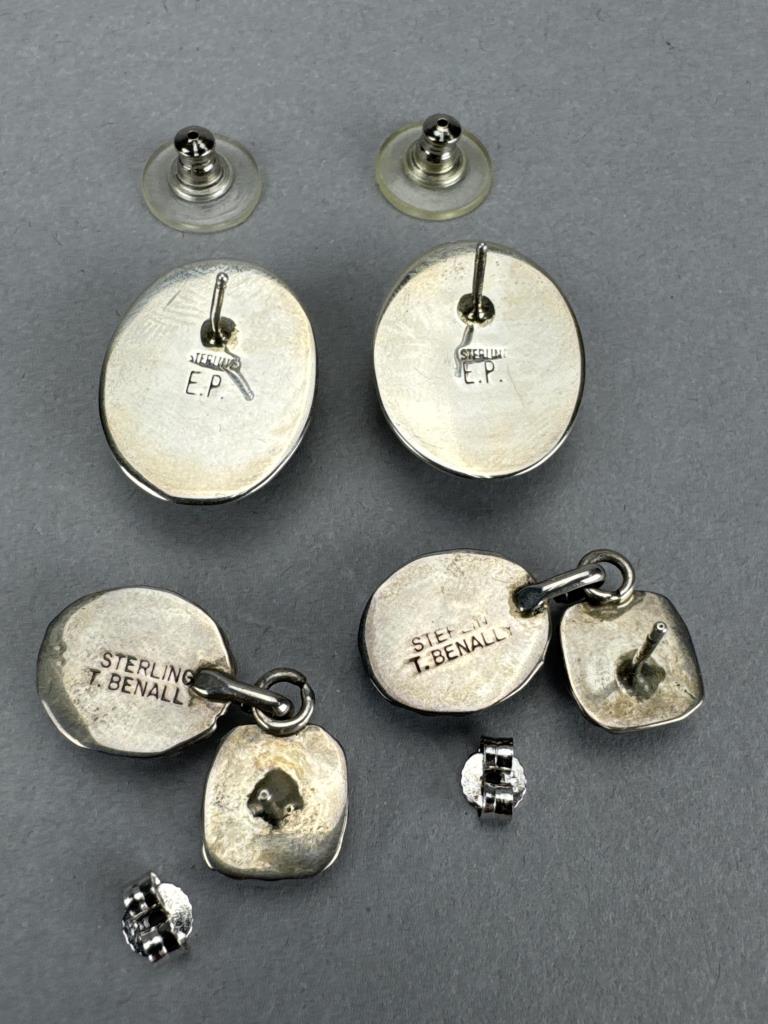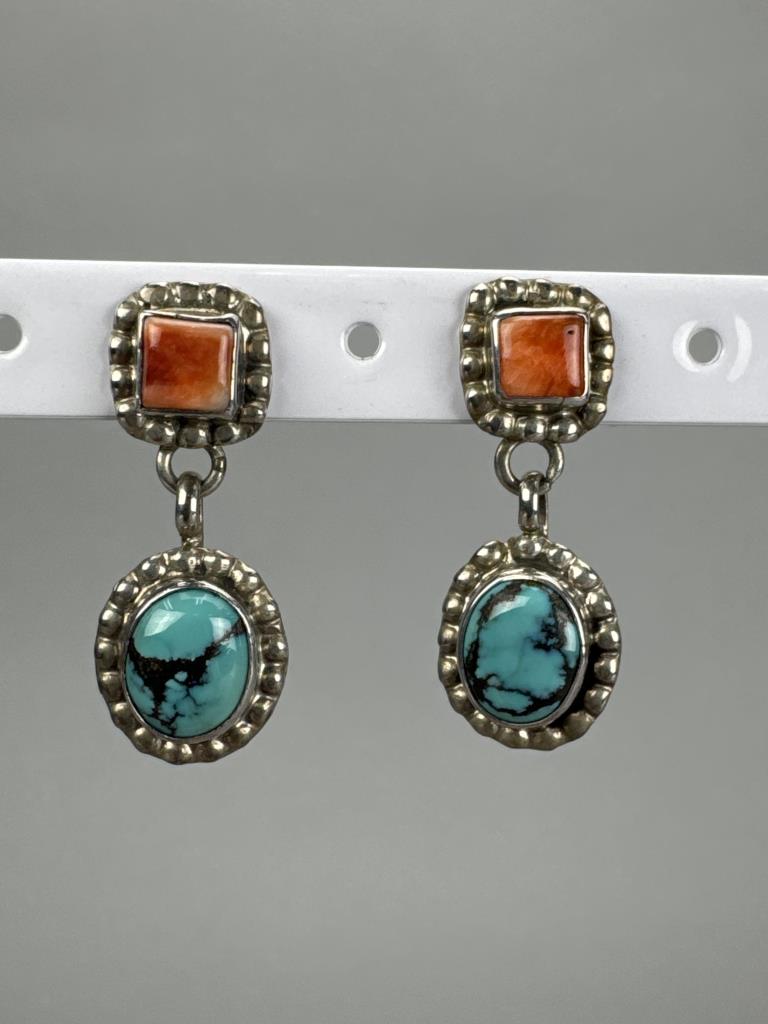 Rainbow calsilica or Fordite man made stones, marked STERLING E.P. and weighs approx. 8.8 grams total w/backs. Turquoise and coral earrings marked STERLING T. BENALLY and weighs 6.3 grams total w/o backs. Carved Jasper thunderbird (sacred bird) dangle earrings, weighs approx. 14.7 grams total. Marked Sterling butterfly cabochon coral earrings, weighs approx. 4.1 grams total.