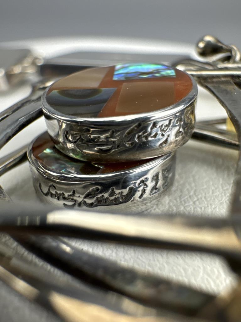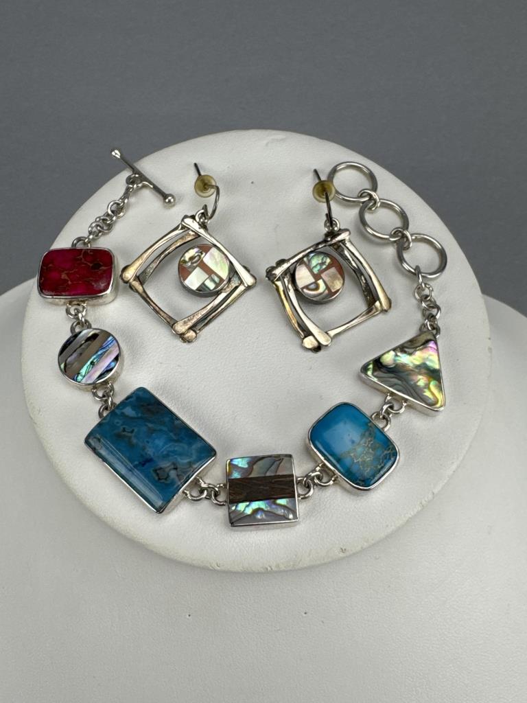 6 1/2 inch + 1 inch sterling silver Sandy Baker signed, mother of pearl, abalone, turquoise, and other stones, toggle clasp bracelet, weighs 24.4 grams. Sandy Baker signed earrings with mother of pearl and abalone inlay, 6.0 grams total weight.