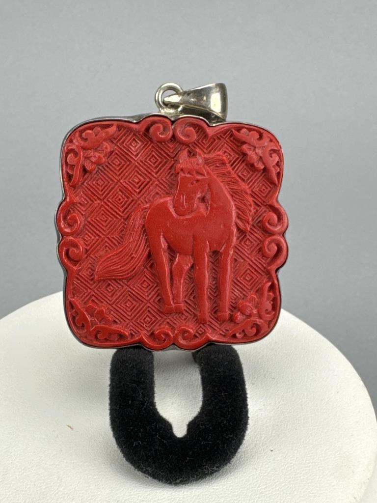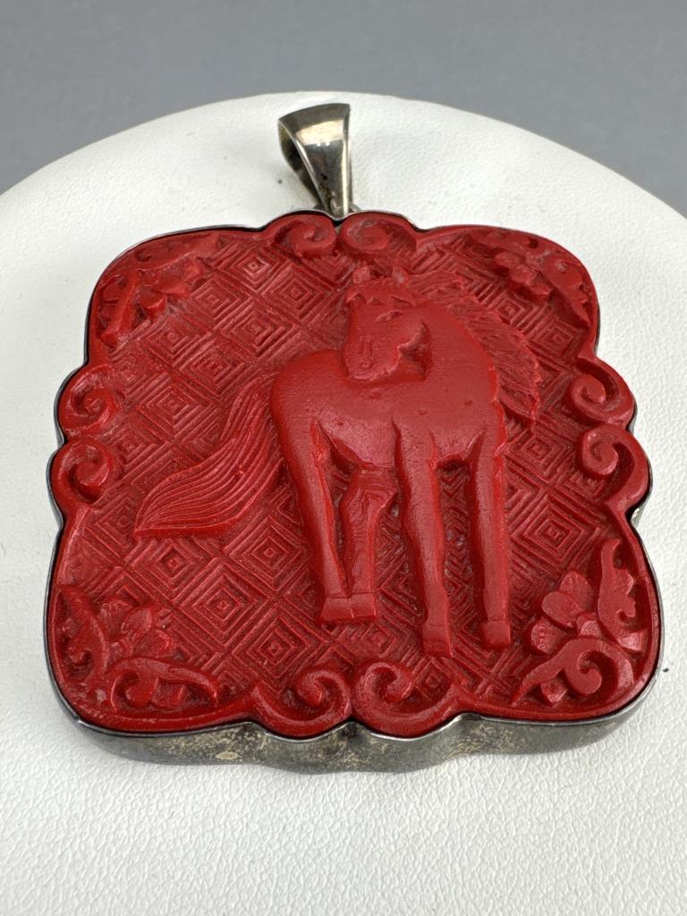 Chinese zodiac ‘Horse’ carved in cinnabar. 2 x 2 inch w/o bail and weighs 20.8 grams.