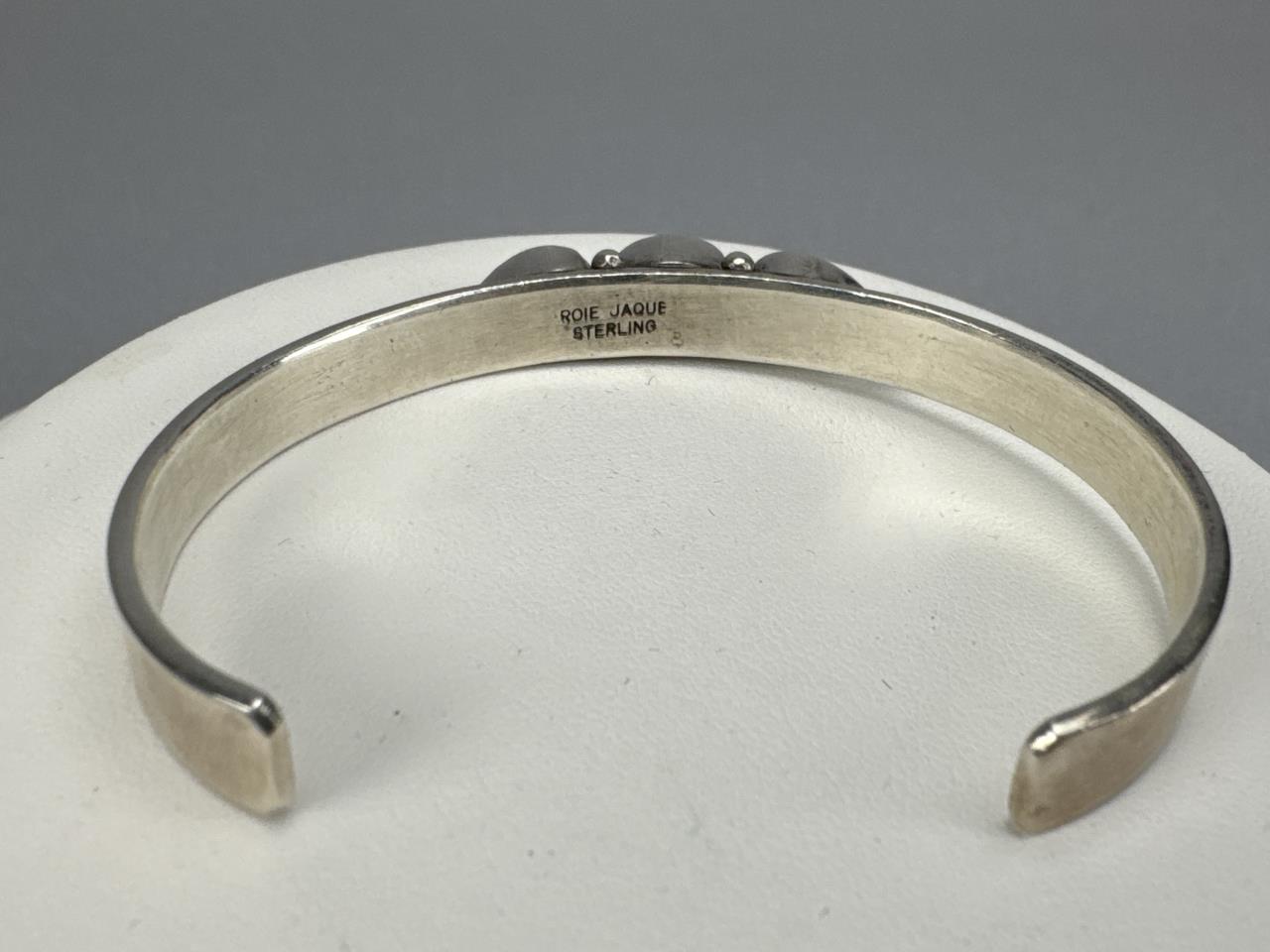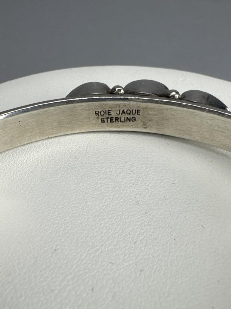 5 1/4 inch inside and weighs 19.6 grams. Marked ROIE JAQUE STERLING