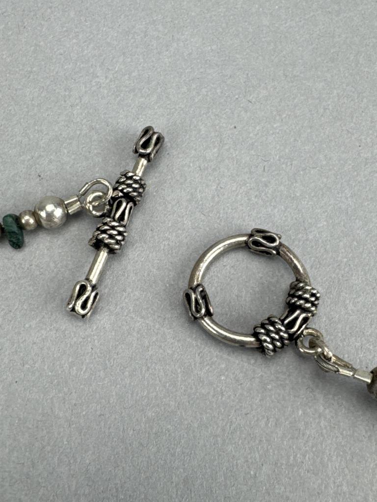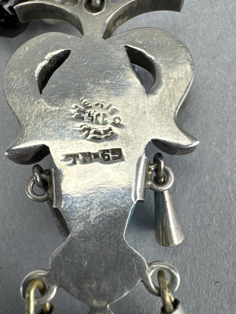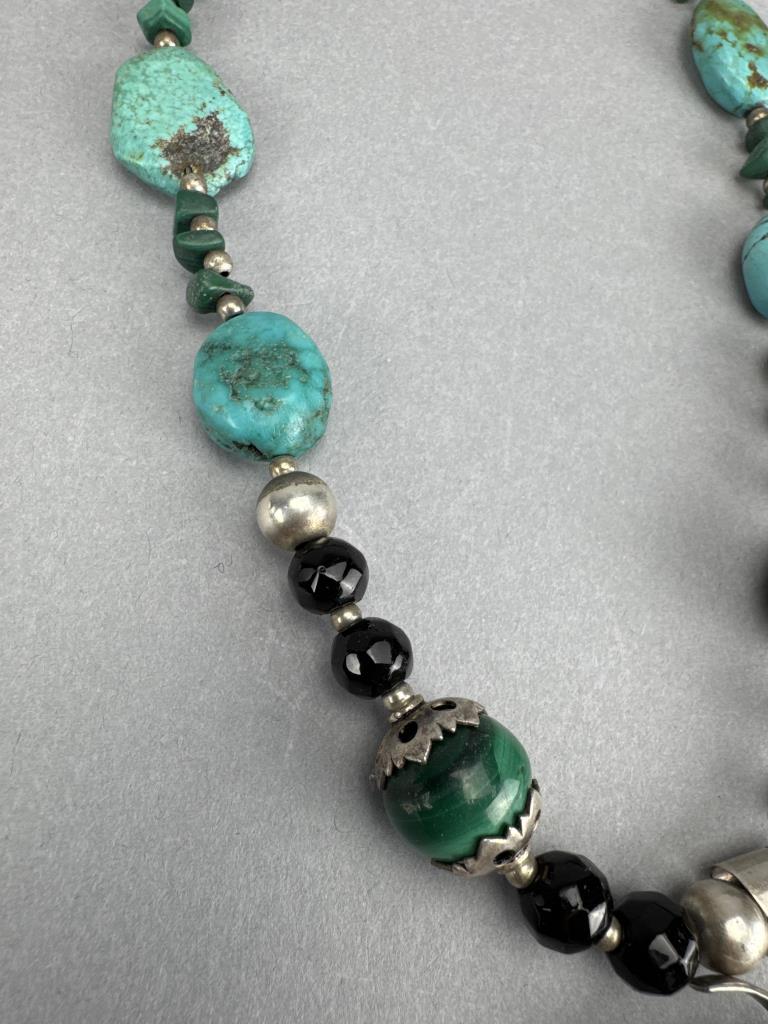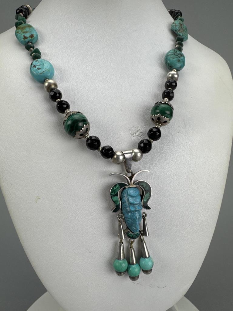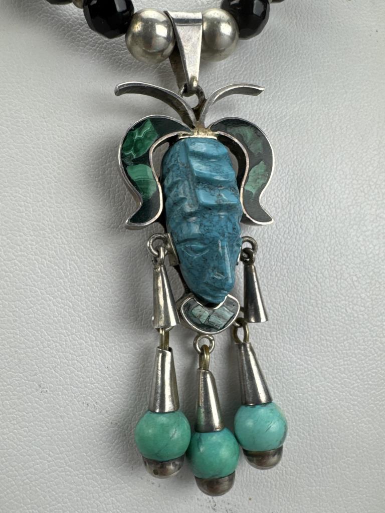 18 inch sterling silver necklace with carved turquoise Latin American mask and malachite inlay, on a strand of turquoise, malachite, onyx, and silver beads. Marked Mexico 925 TM-65. Weighs approx. 62.1 grams.