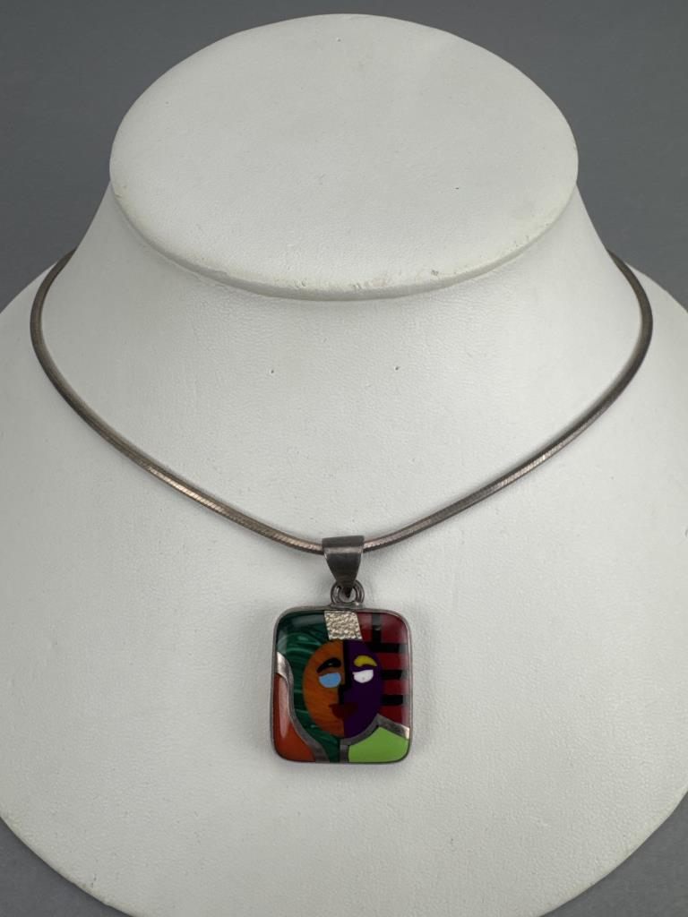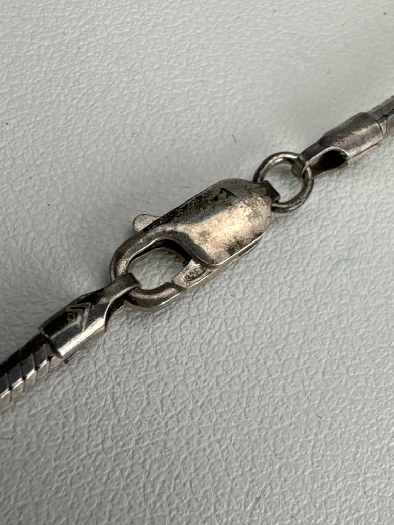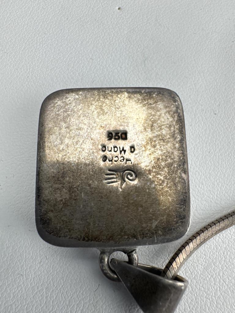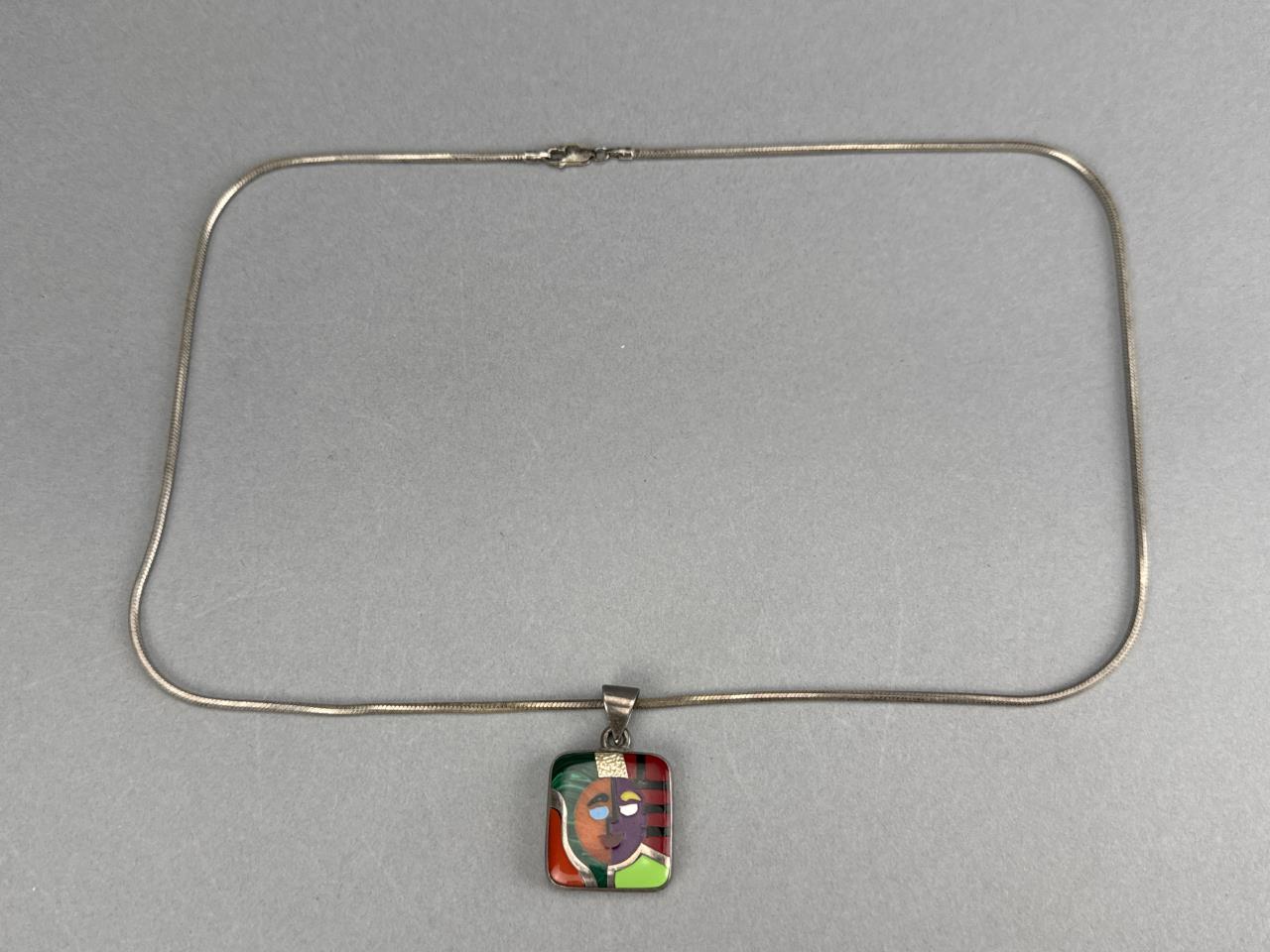 24 inch sterling silver snake necklace marked 925 GERMANY and weighs approx. 17.9 grams. Resin inlay face charm marked with swirl into a hand Hecho a Mano 950 and weighs approx. 10.5 grams.