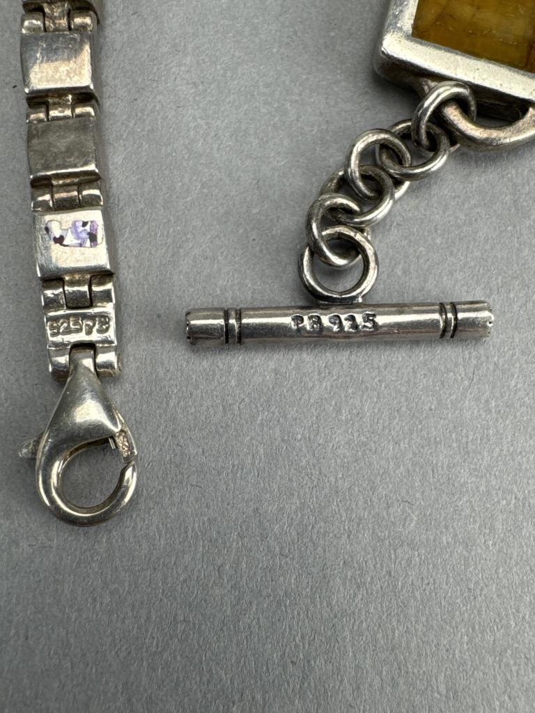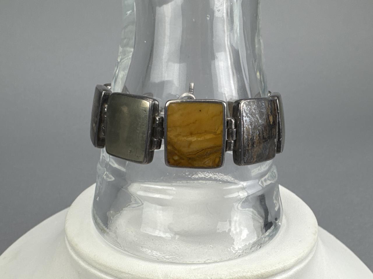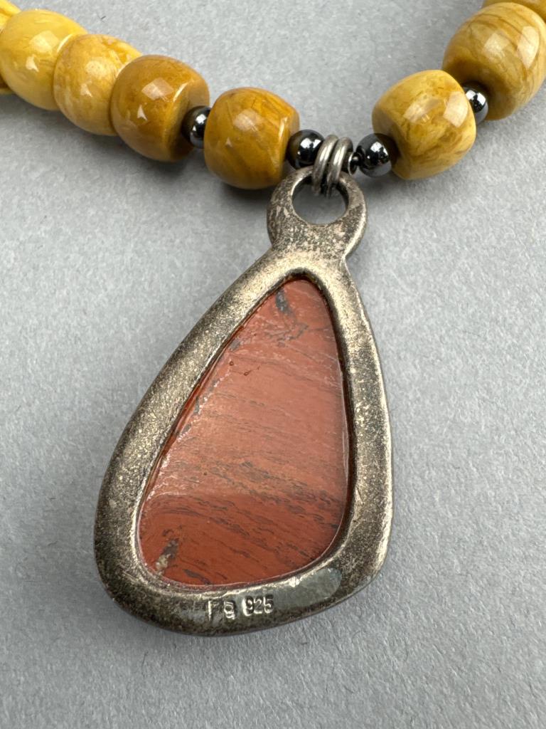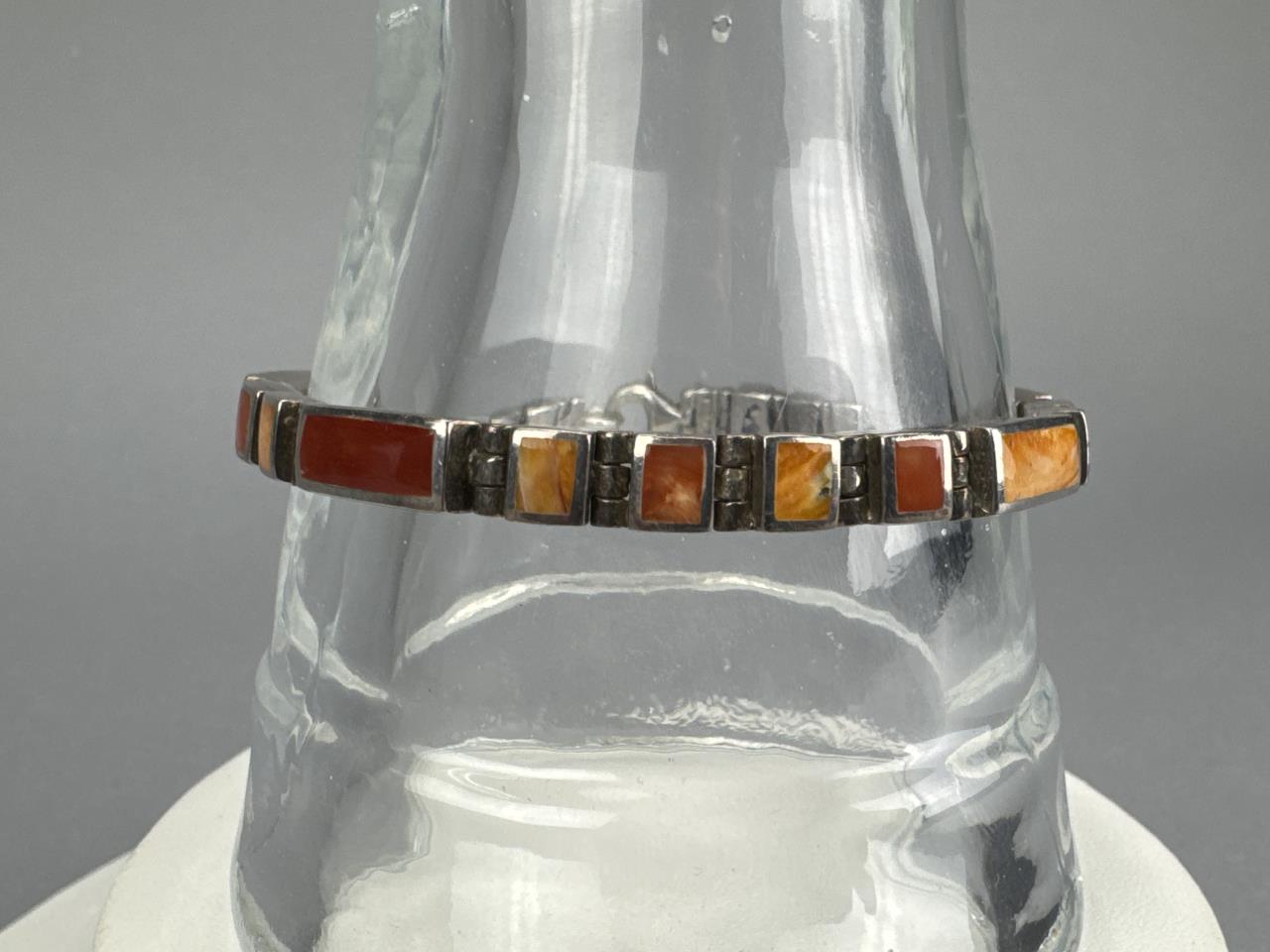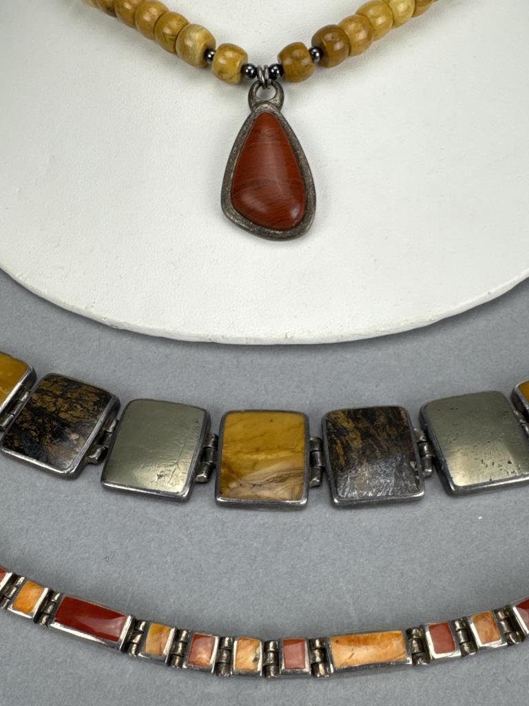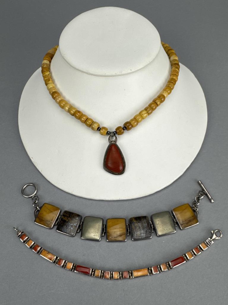 7 1/4 inch inlay (spiny oyster) bracelet weighs approx. 22.1 grams, 7 1/2 inch toggle clasp (jasper, petrified wood, metal alloy) inlay bracelet weighs approx. 43.6 grams, 16 + 2 inch yellow jasper and red jasper necklace weighs approx. 55.6 grams.