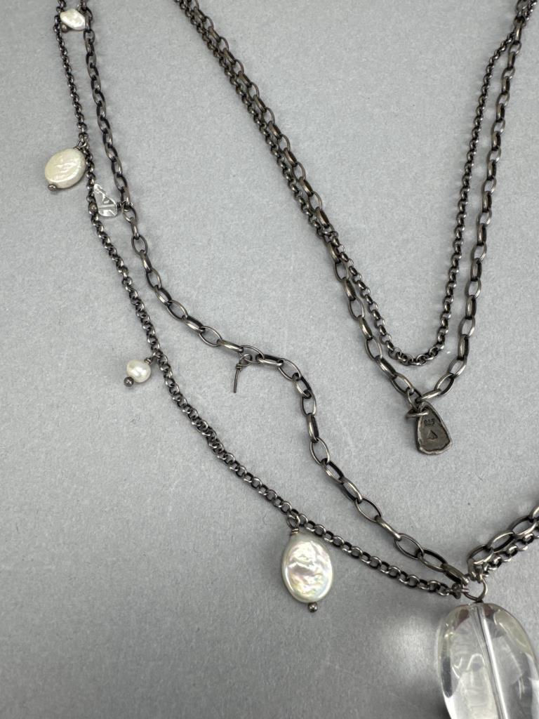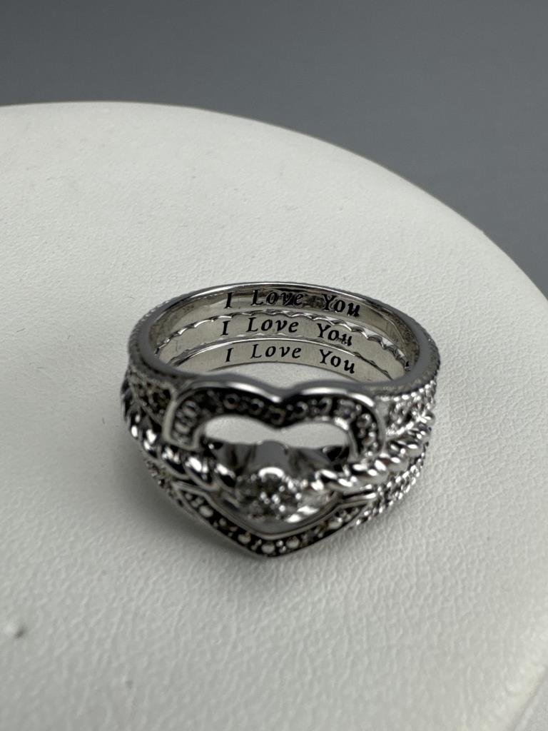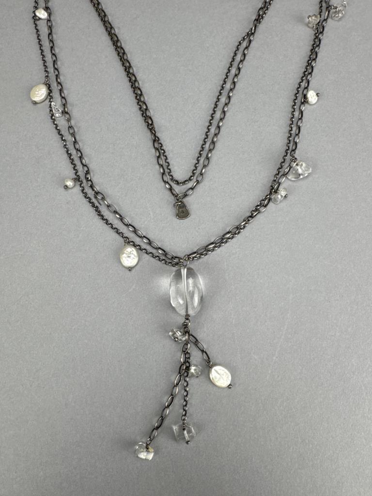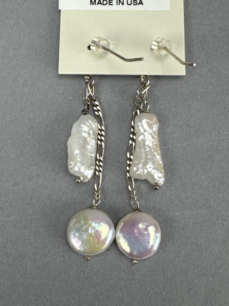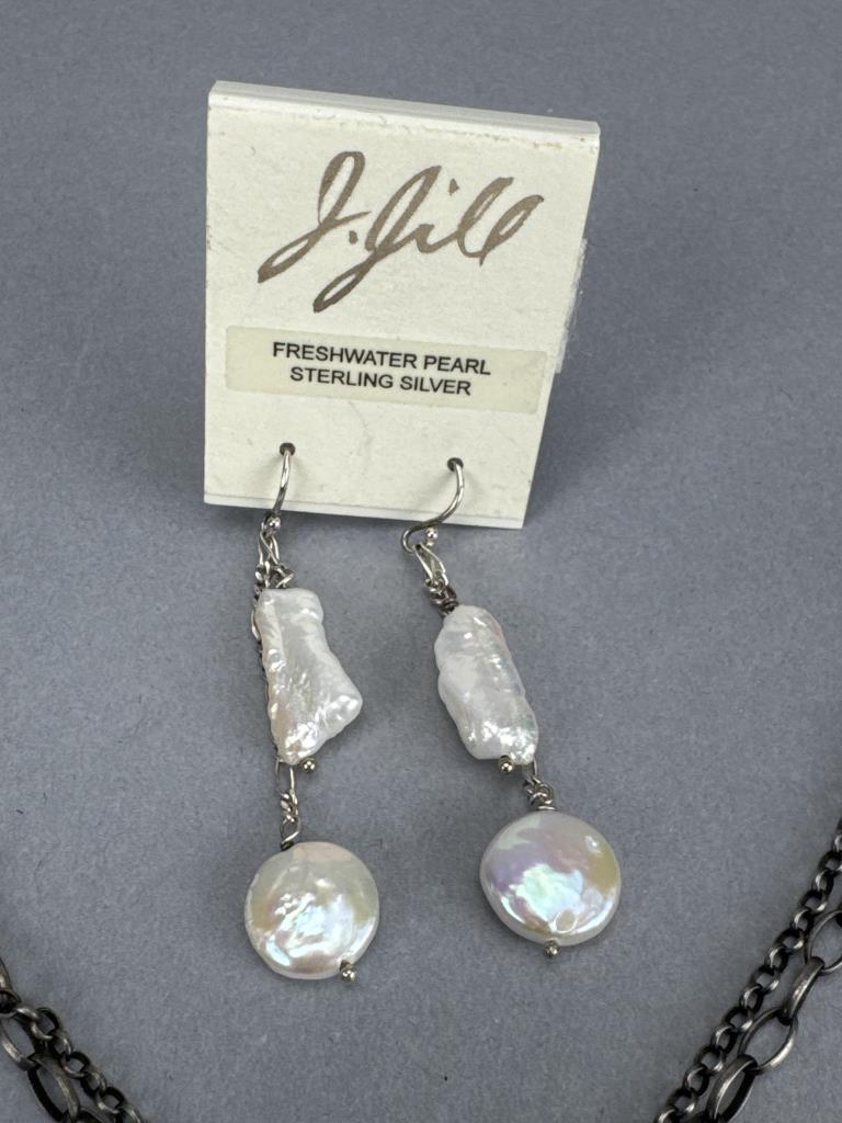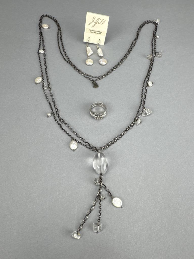 Silpada freshwater pearl and quartz necklace is 34 inches, weighs 34.3 grams, and is missing a piece of quartz. J. Jill french hook freshwater pearl dangle earrings weigh 4.4 grams total. BGE (Bradford Exchange Gold) 925 marked ‘I Love You’ 11 diamond chip trio ring set is size 7 and weighs 5.7 grams total.