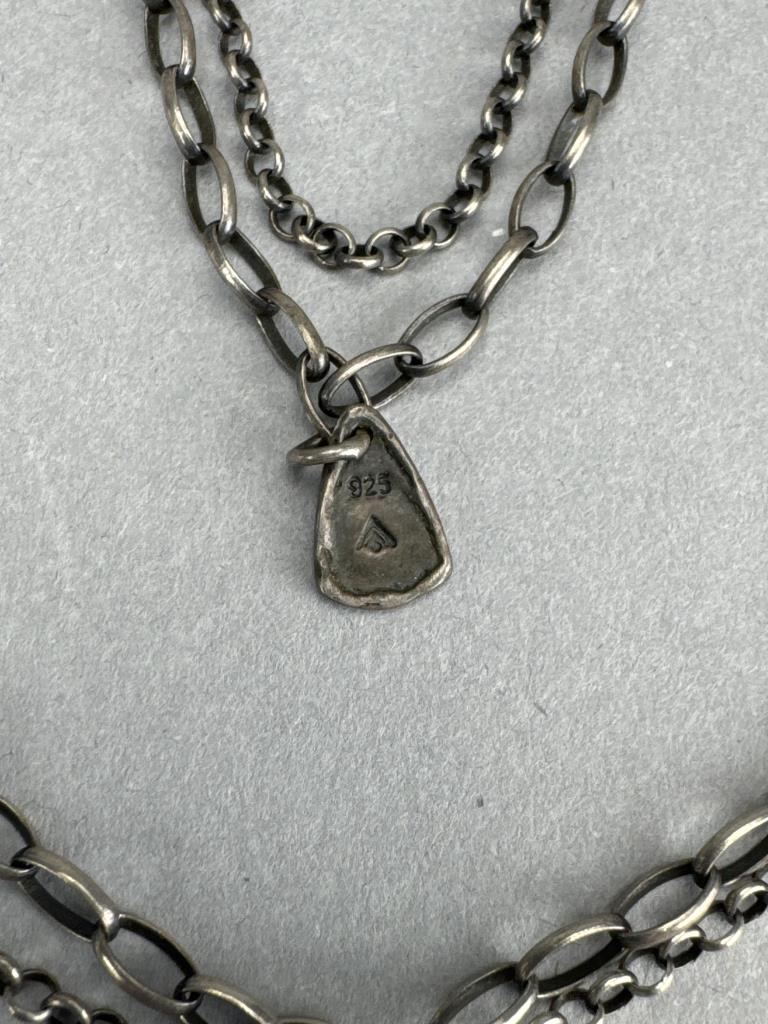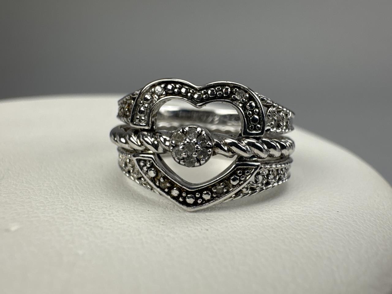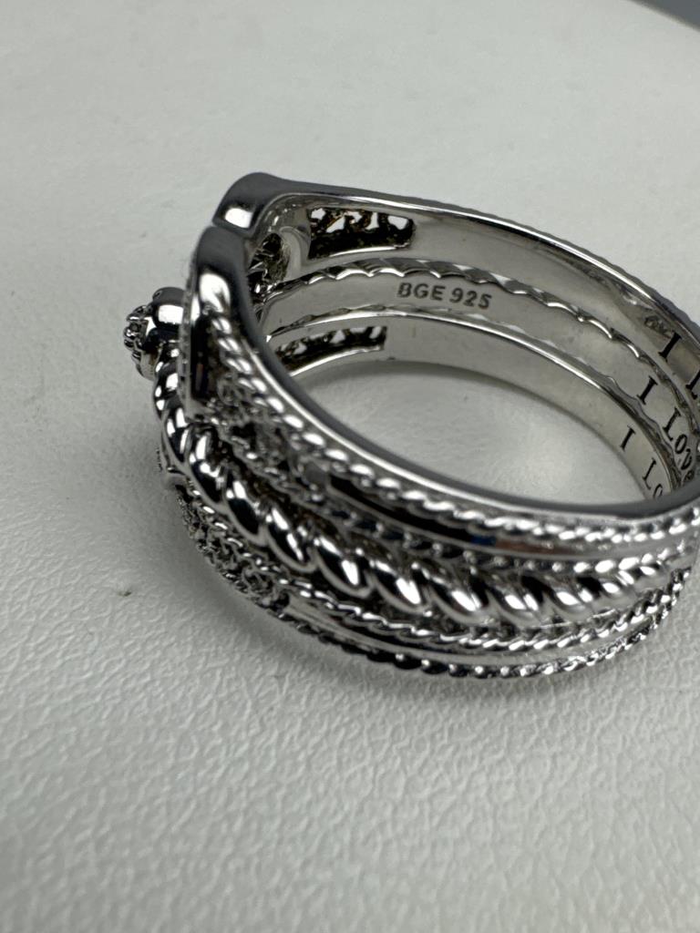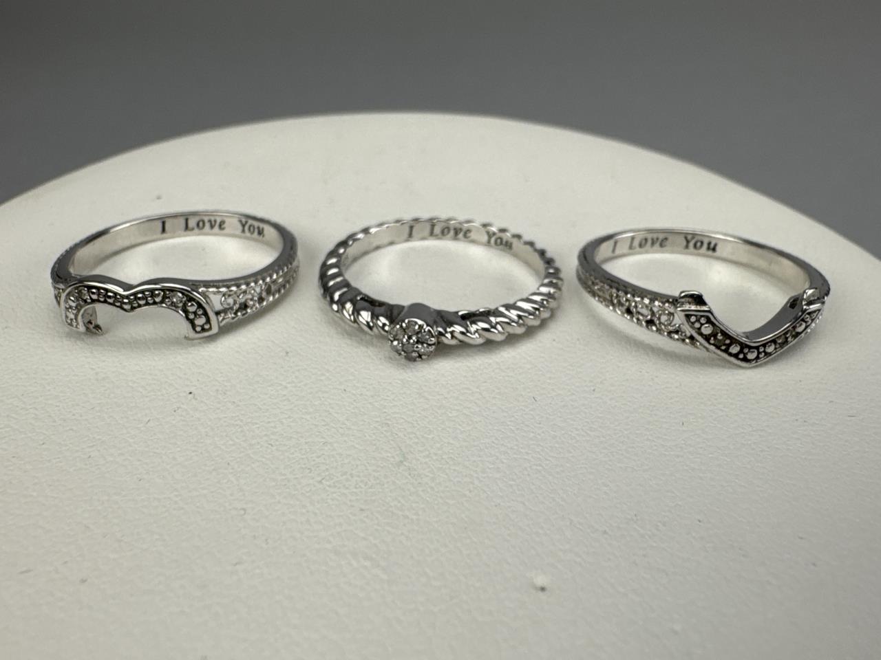 Silpada freshwater pearl and quartz necklace is 34 inches, weighs 34.3 grams, and is missing a piece of quartz. J. Jill french hook freshwater pearl dangle earrings weigh 4.4 grams total. BGE (Bradford Exchange Gold) 925 marked ‘I Love You’ 11 diamond chip trio ring set is size 7 and weighs 5.7 grams total.