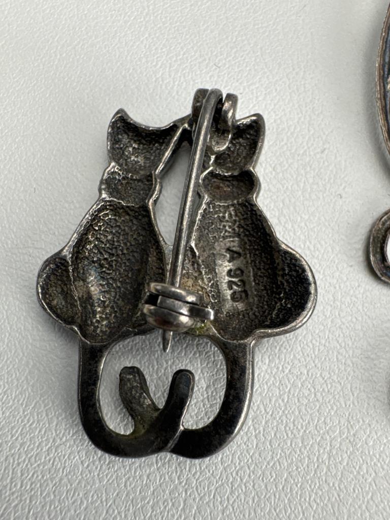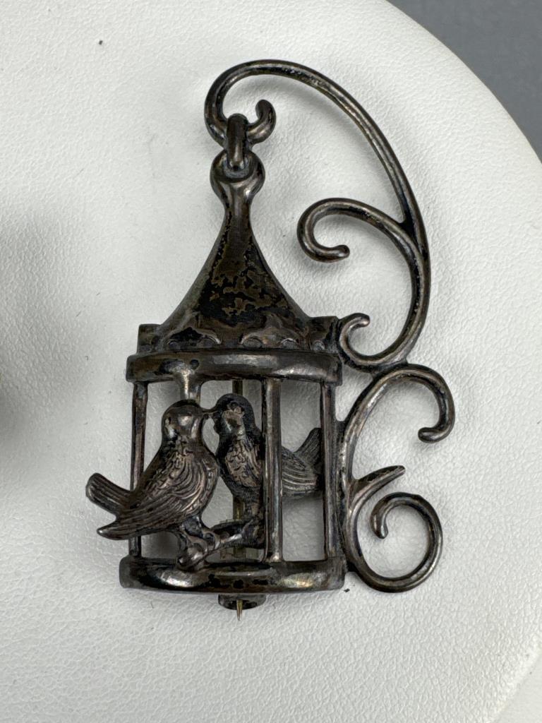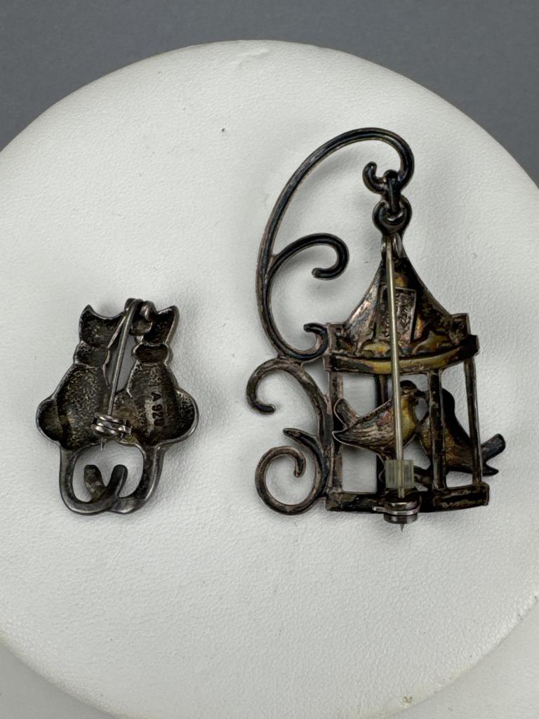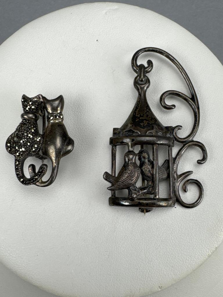 Birdcage pin is marked STERLING Lang, measures 2 inches long and weighs approx. 6.1 grams. Marcasite cat pin is marked A 925, just over an inch long and weighs approx. 5.4 grams.