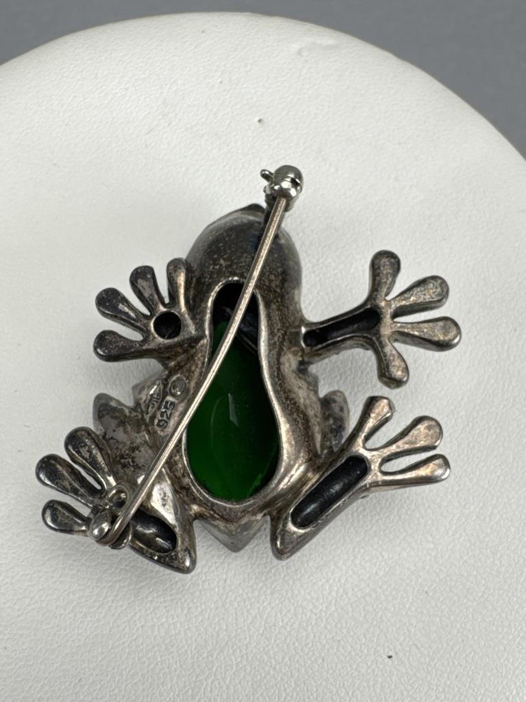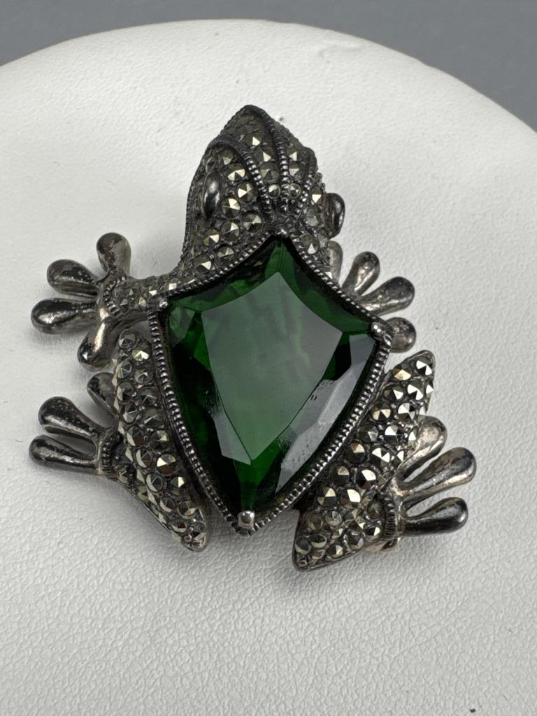 Frog is marked with J J in diamond cartouche (Juarez workshop) 925, green glass, marcasite stones, measures 1 1/2 inch, and weighs approx. 26.7 grams.
