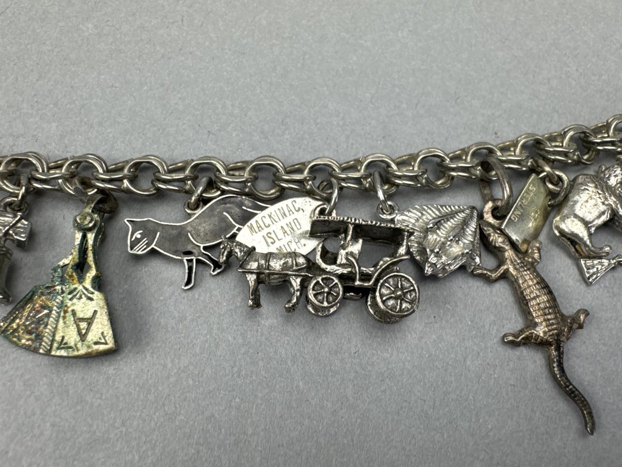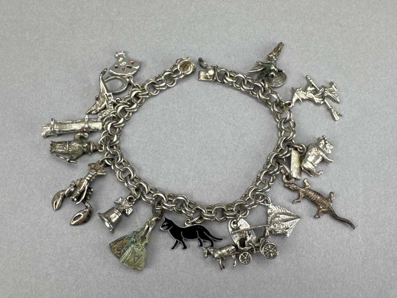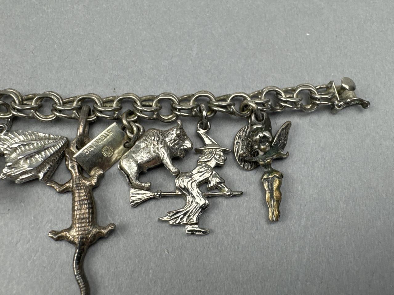 7 1/4 inch bracelet marked Elco STERLING with 14 charms including: Tinkerbell, witch on broom, Grand Tetons buffalo, alligator, conch shell, horse & carriage, black cat, Liberty Bell, lobster, Smokey the Bear, Golden Gate bridge, Florida dolphin, horseshoe gambling hand. Weighs approx. 40.8 grams.