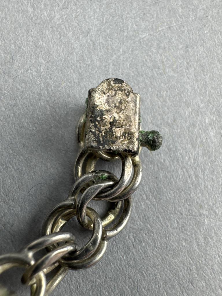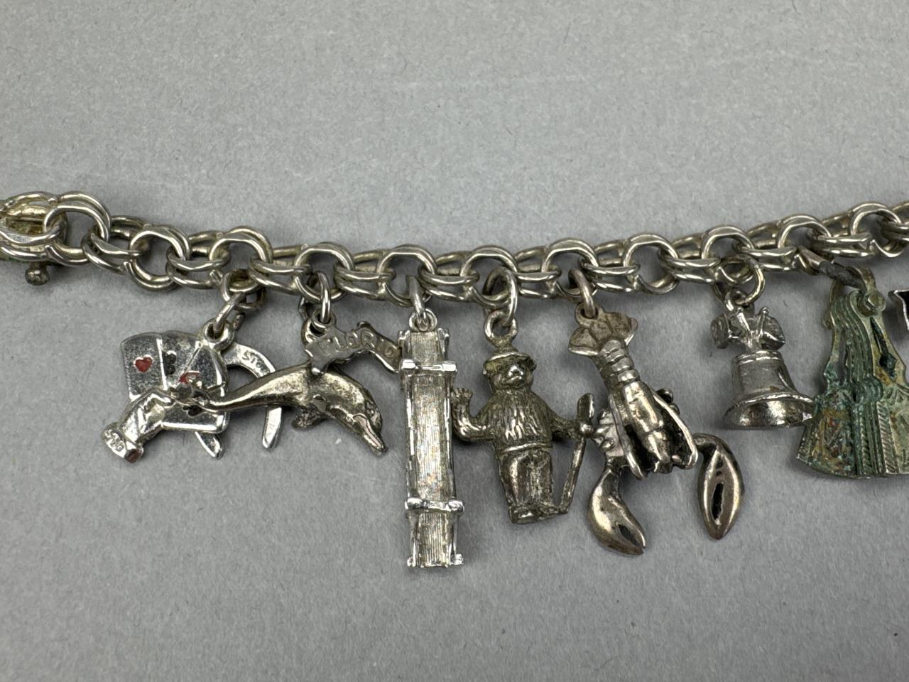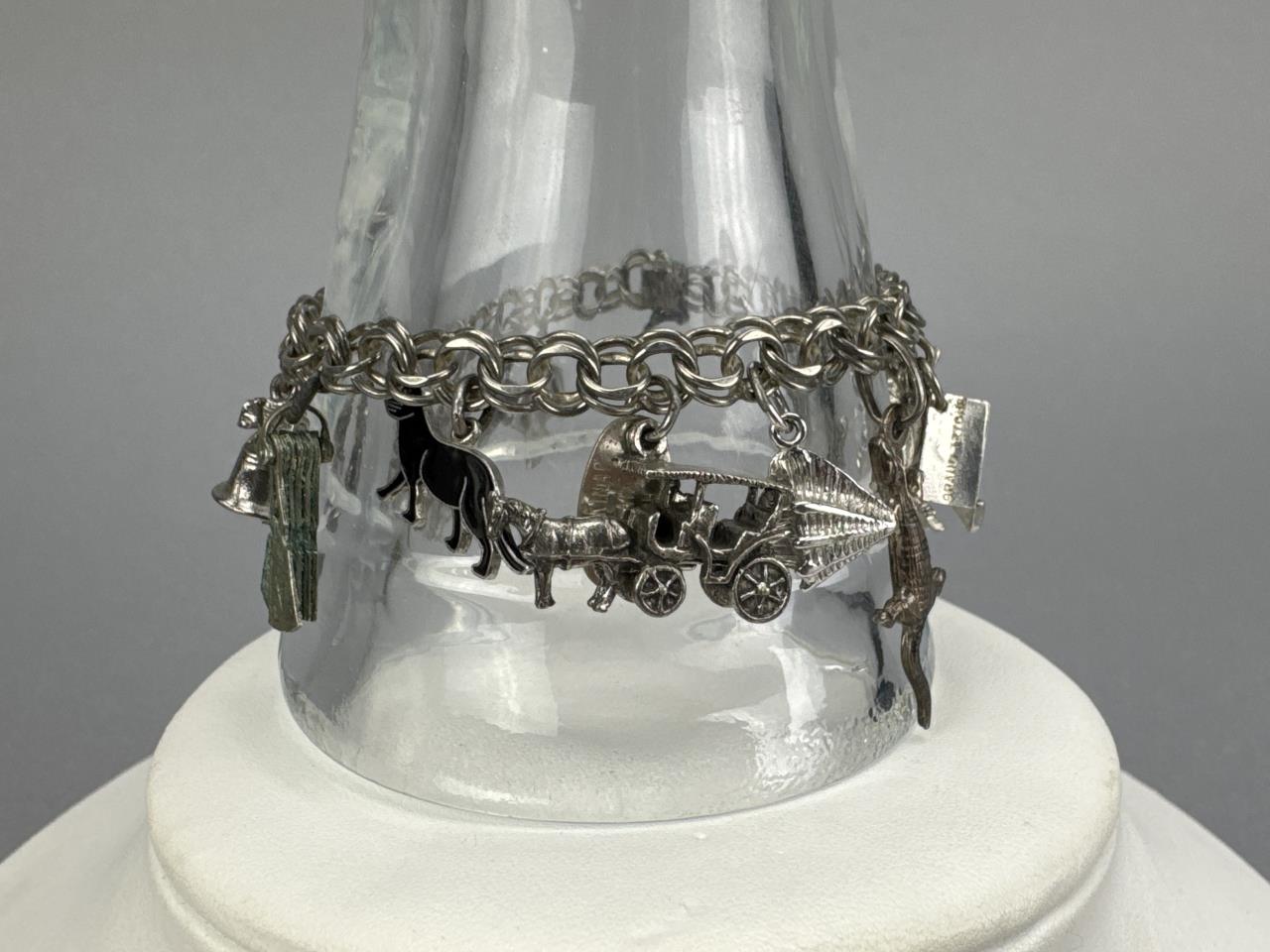 7 1/4 inch bracelet marked Elco STERLING with 14 charms including: Tinkerbell, witch on broom, Grand Tetons buffalo, alligator, conch shell, horse & carriage, black cat, Liberty Bell, lobster, Smokey the Bear, Golden Gate bridge, Florida dolphin, horseshoe gambling hand. Weighs approx. 40.8 grams.