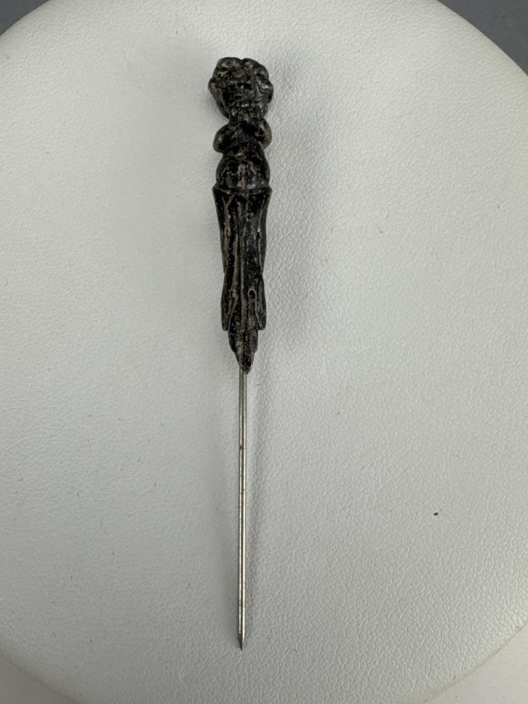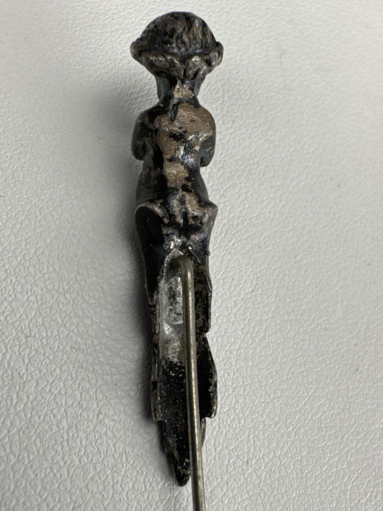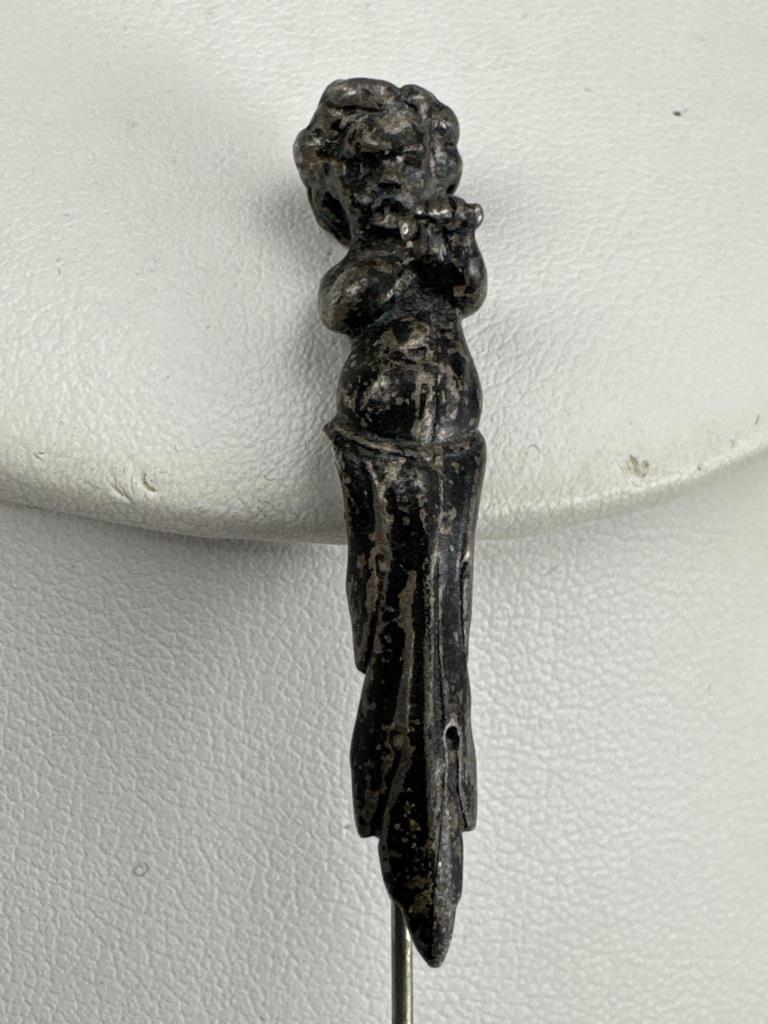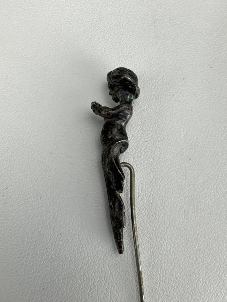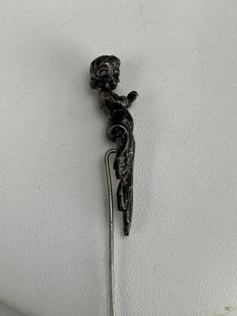 Solid sterling figural stickpin depicting a cherub holding a small scroll or rolled parchment. 19th century era. 2 3/4 inch and weighs approx. 6.4 grams.
