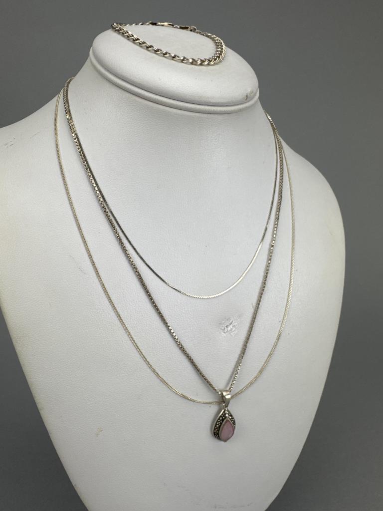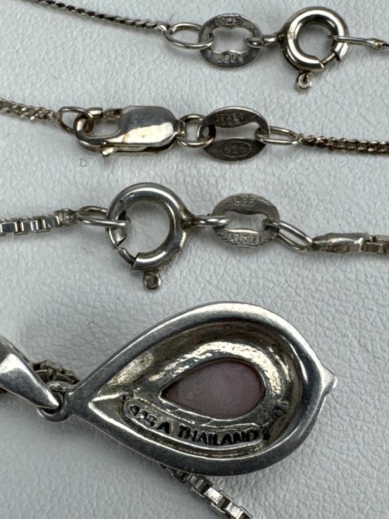 Bracelet is 7 inches and marked ITALY 925, one 16 inch, one 18 inch and one 20 inch necklace, Marcasite and pink cabochon pendant marked 925 A THAILAND.