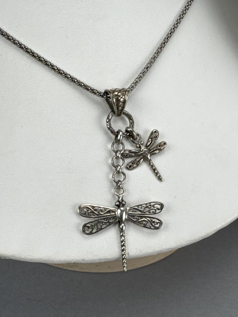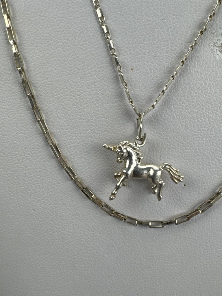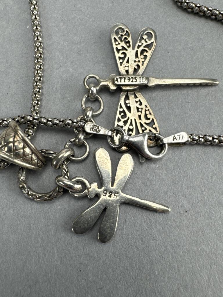 18 inch fancy link necklace with unicorn charm, 18 inch popcorn link necklace with double dragonfly charm, and a 20 inch chain link style necklace. 17.7grams total weight of all items.