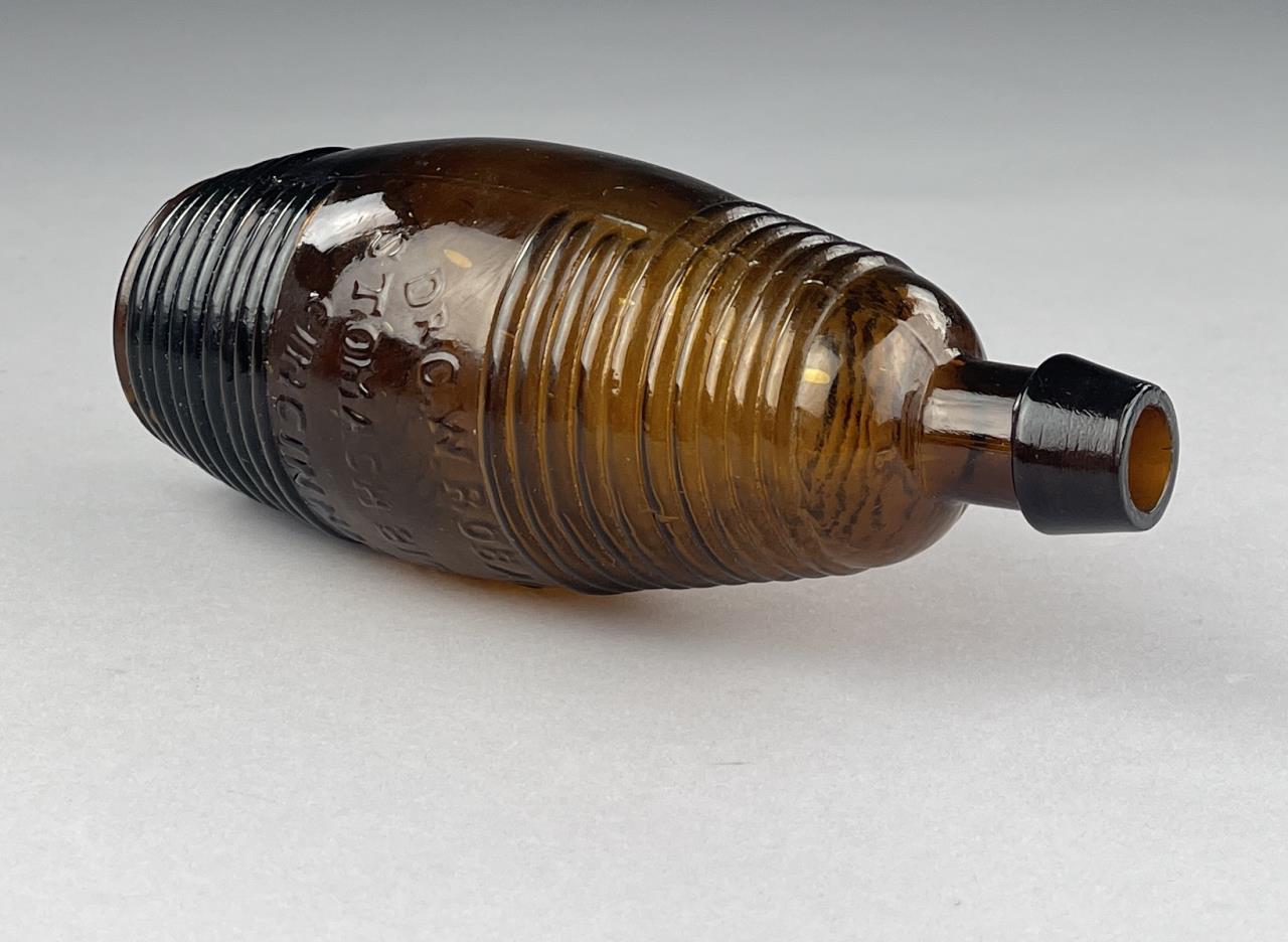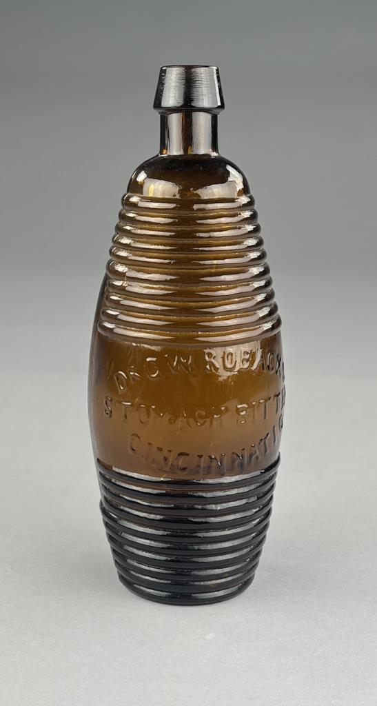 Dr. C.W. Robacks (Cincinnati, Ohio) stomach bitters bottle, figural ringed barrel shaped, amber glass with an applied lip, circa 1865-1870, 10″ (H).