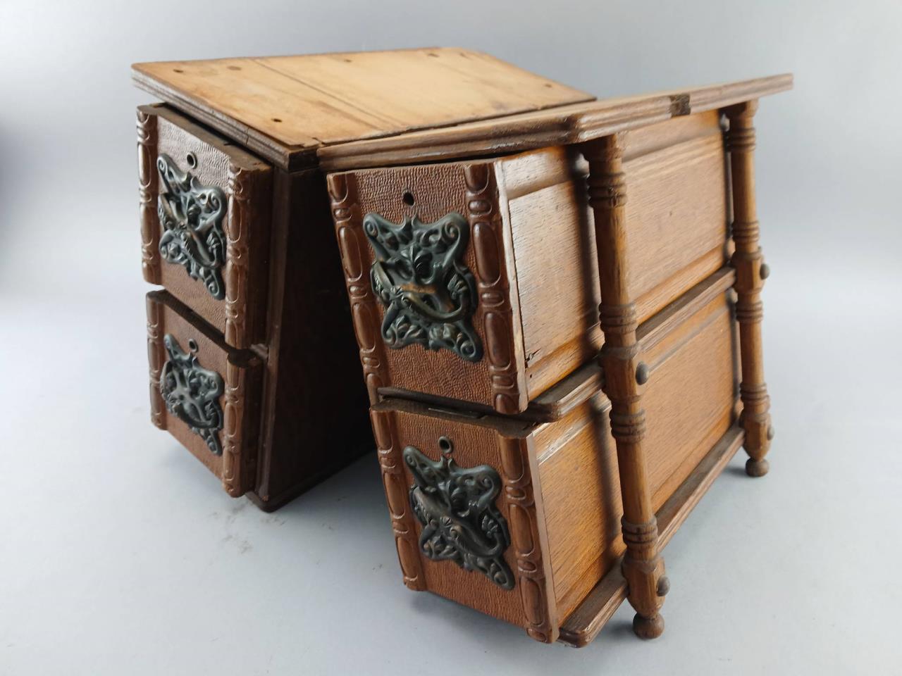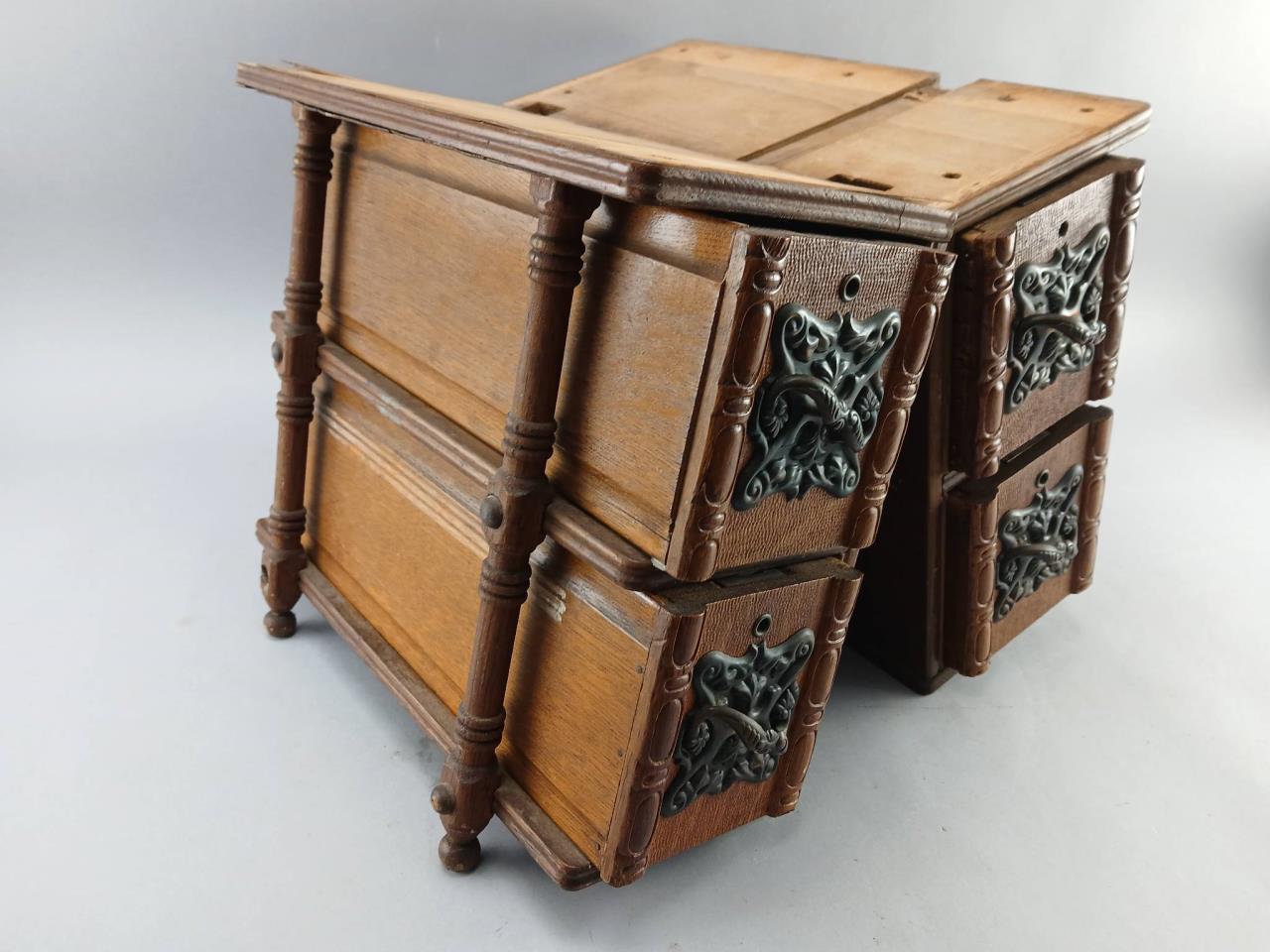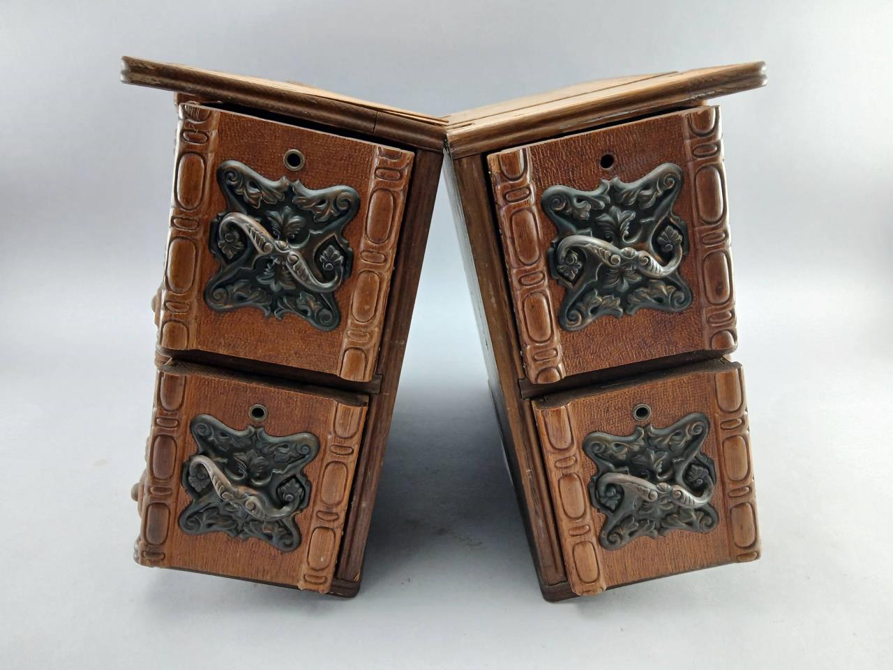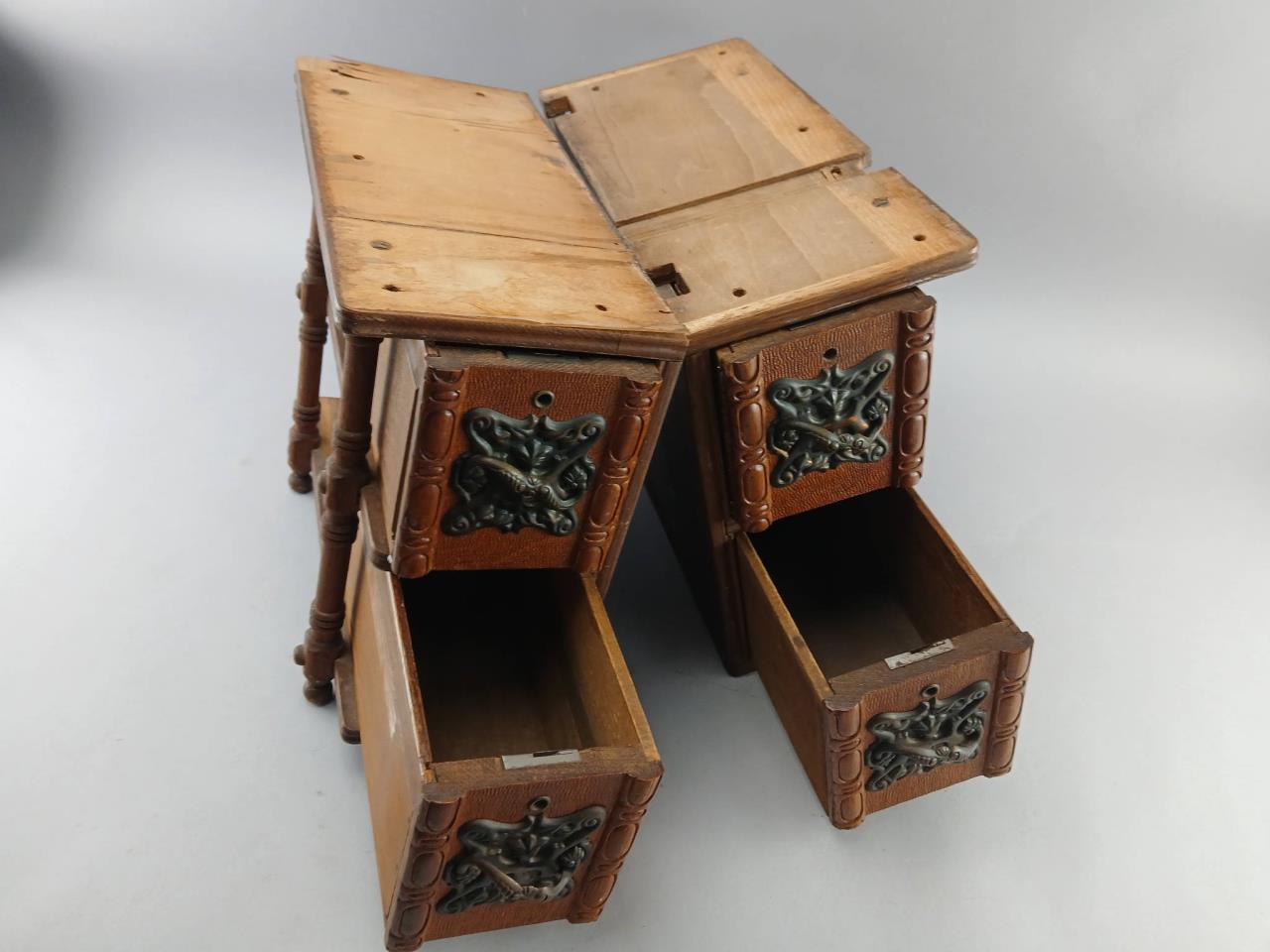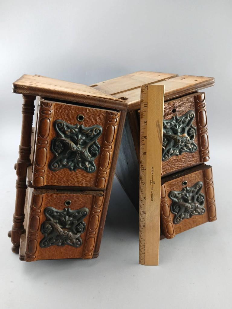 Four wooden sewing machine cabinet drawers featuring ornate metal accents and turned wood side supports. Designed to mount to a treadle sewing machine cabinet. Notable wear visible on surfaces.