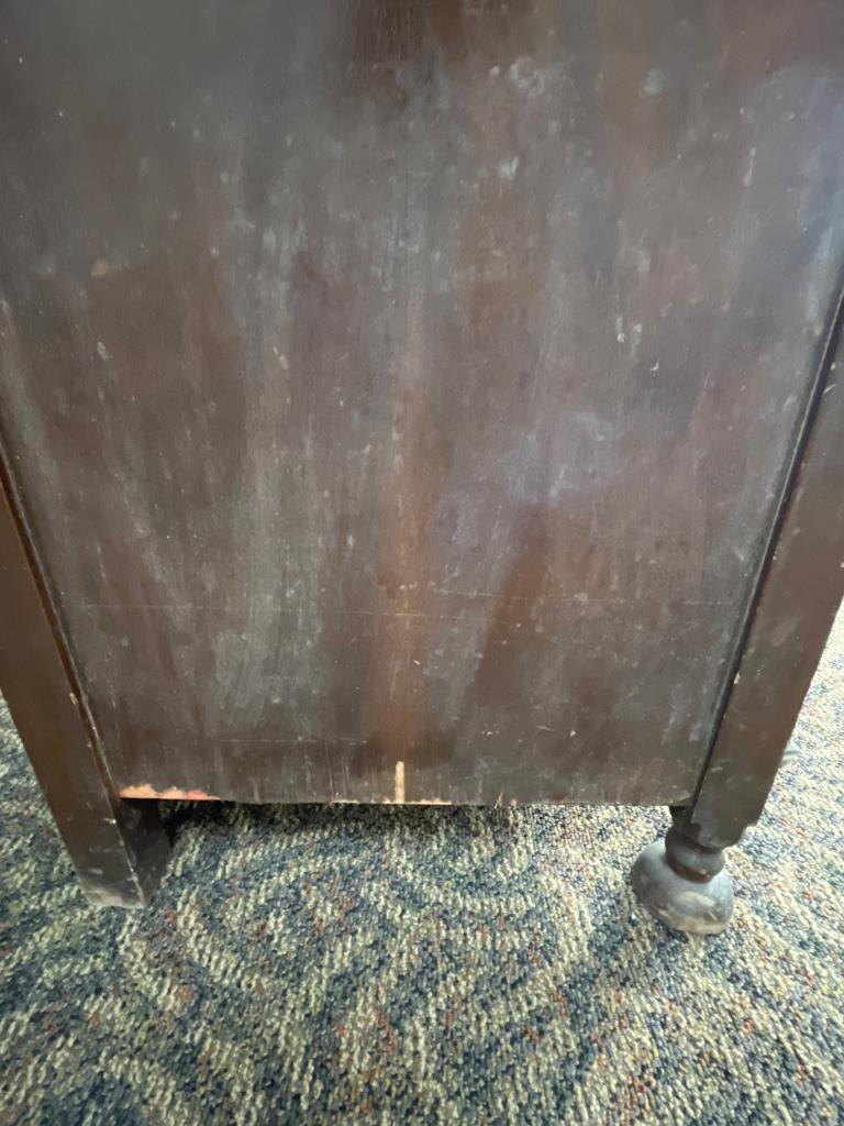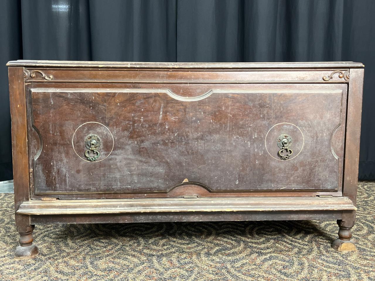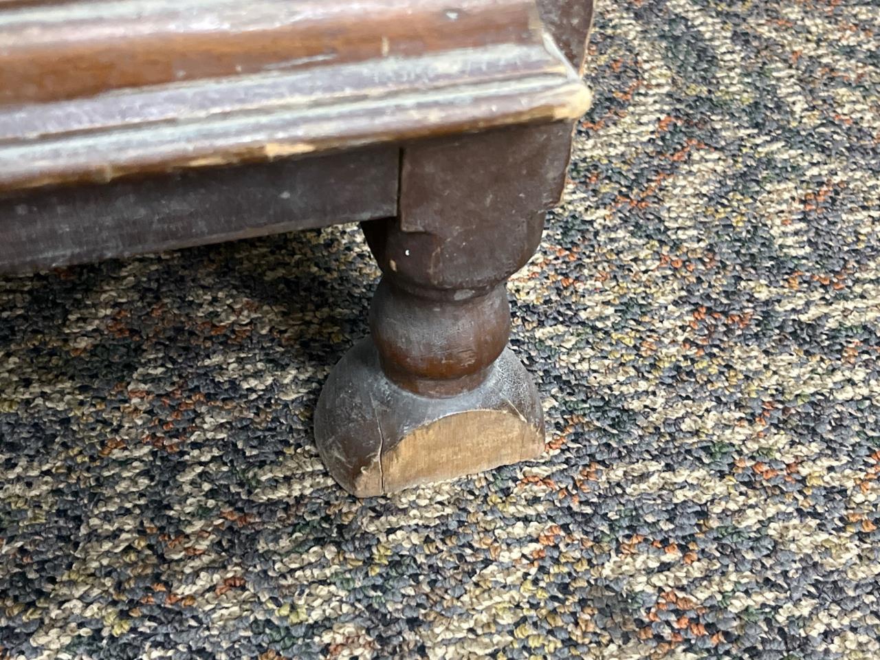 Rectangular wooden storage chest featuring a hinged lid, decorative metal pulls, turned legs, and carved details. Scratches, chips, and wear are visible on surfaces and edges. A leg shows damage near the base. Chest measures 18´´ x 40´´ x 22.5´´. Loc