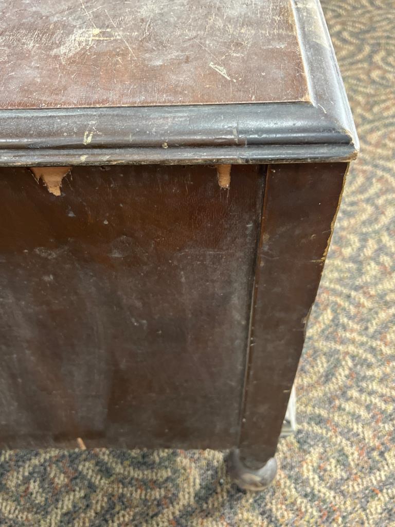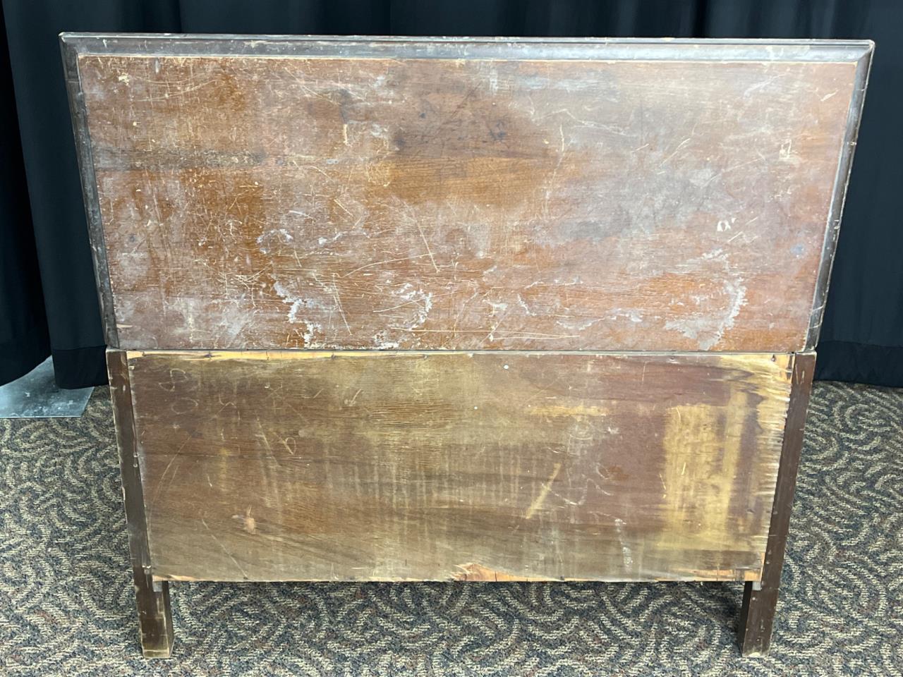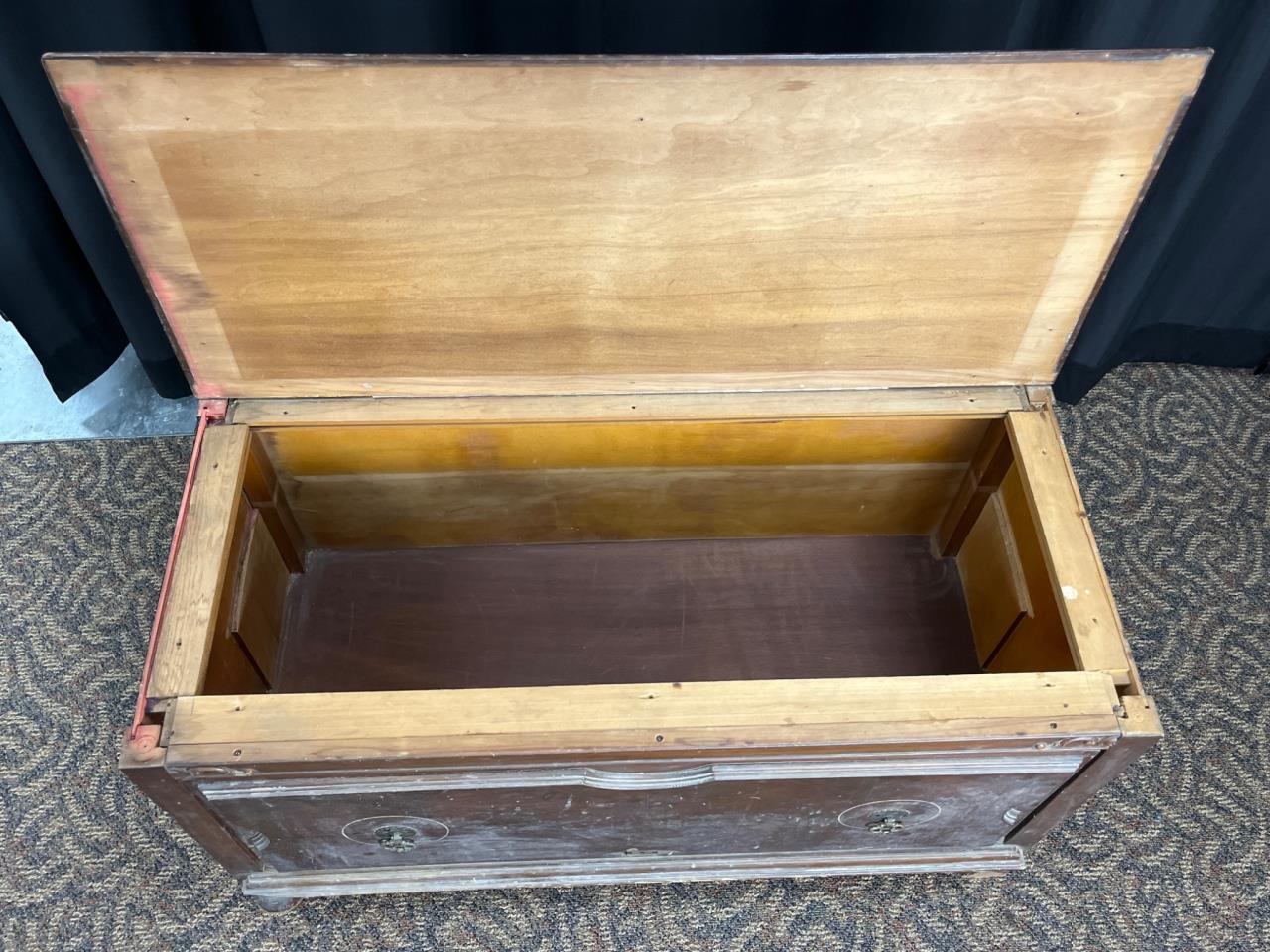 Rectangular wooden storage chest featuring a hinged lid, decorative metal pulls, turned legs, and carved details. Scratches, chips, and wear are visible on surfaces and edges. A leg shows damage near the base. Chest measures 18´´ x 40´´ x 22.5´´. Loc