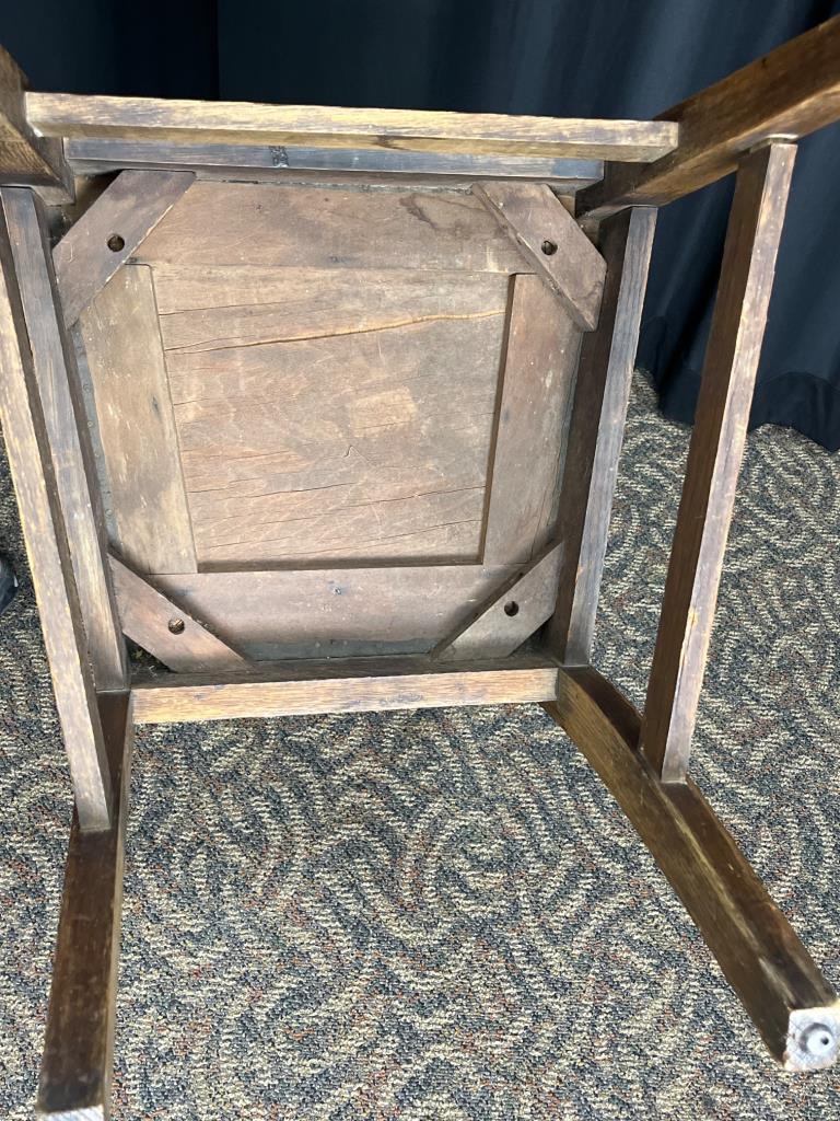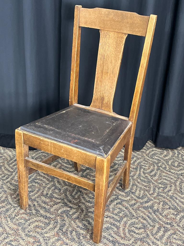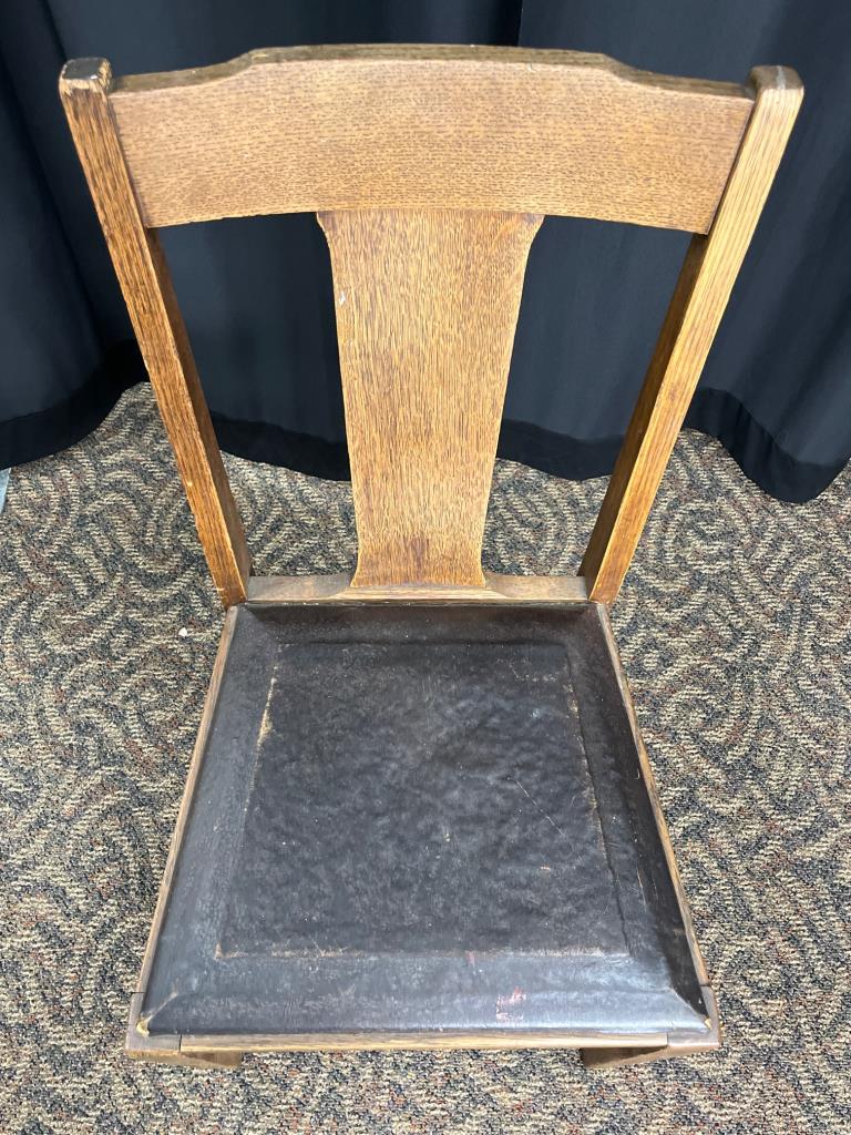 Wood chair featuring a T-shaped backrest and a square seat with a dark-toned finish. Shows visible surface wear and scuffs. Simple and sturdy construction ideal for various settings. Chair measures 17.5´´ x 16.5´´ x 36.5´´. Local pick up only.