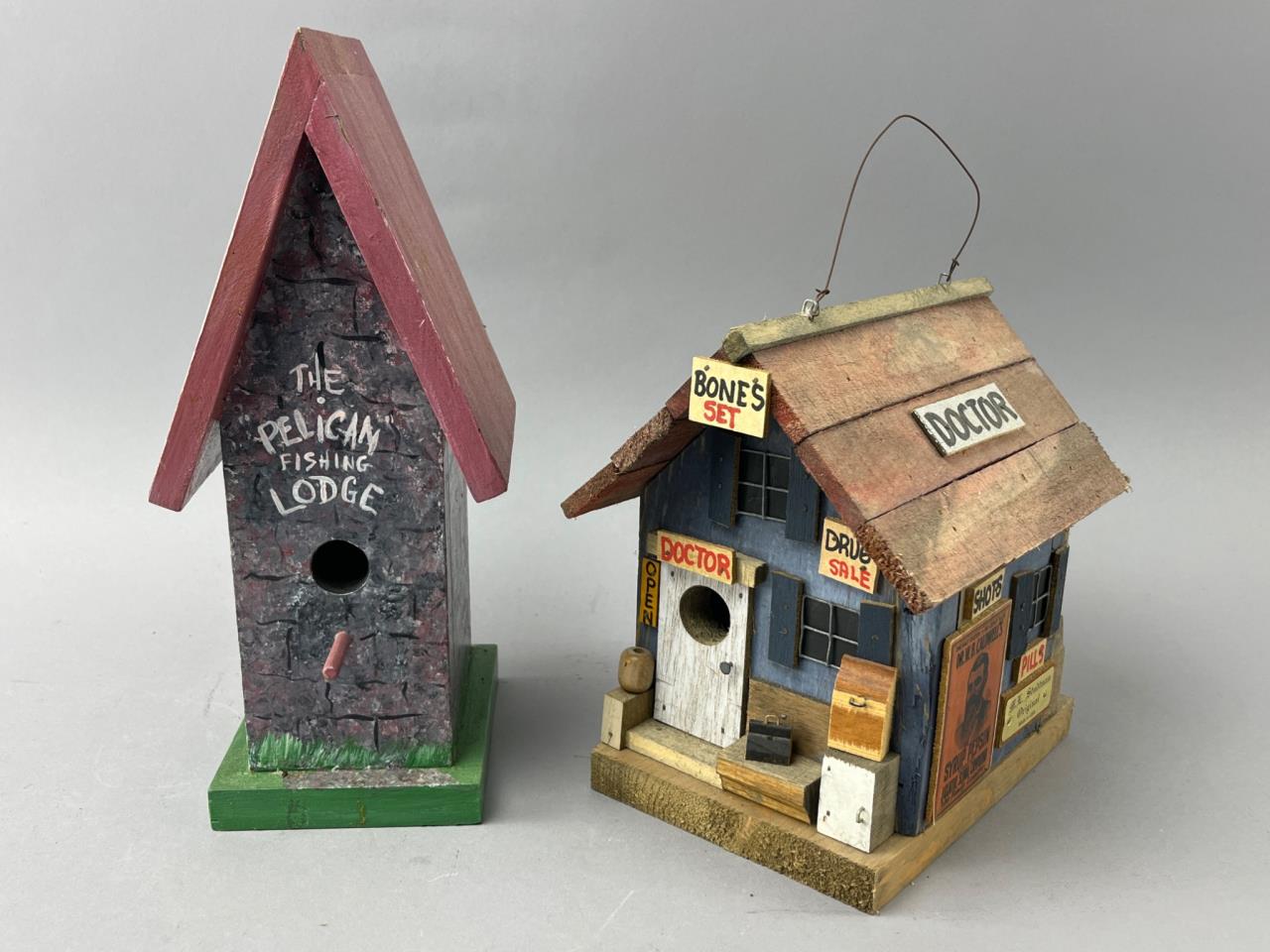 Two painted wood birdhouses: a lodge-style birdhouse labeled ‘The Fishing Lodge’ and a shop-style birdhouse with signs including ‘Doctor’ and ‘Drug Sale.’ Both feature painted details and unique designs. Hooks for hanging included.