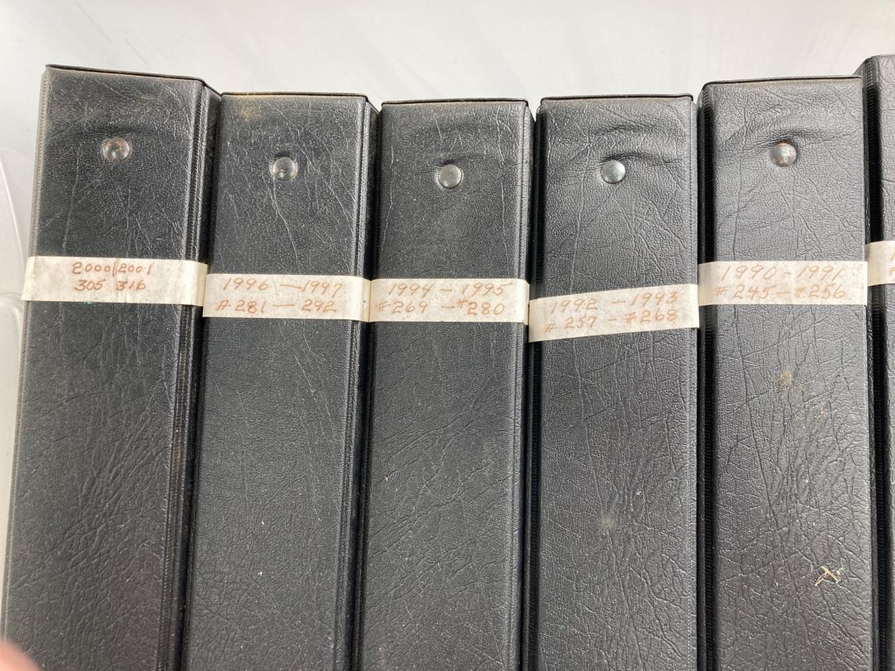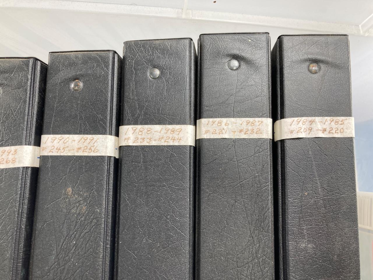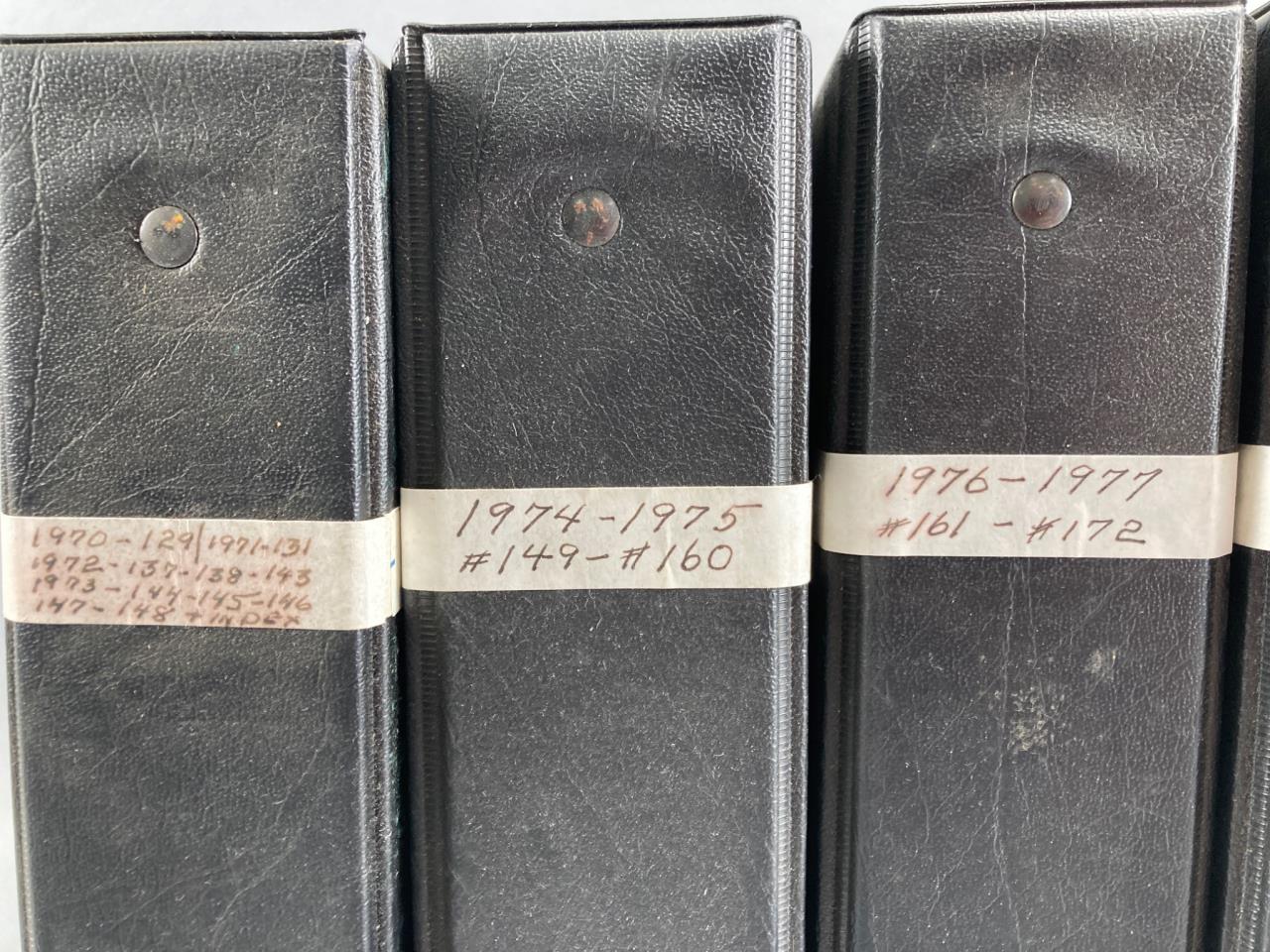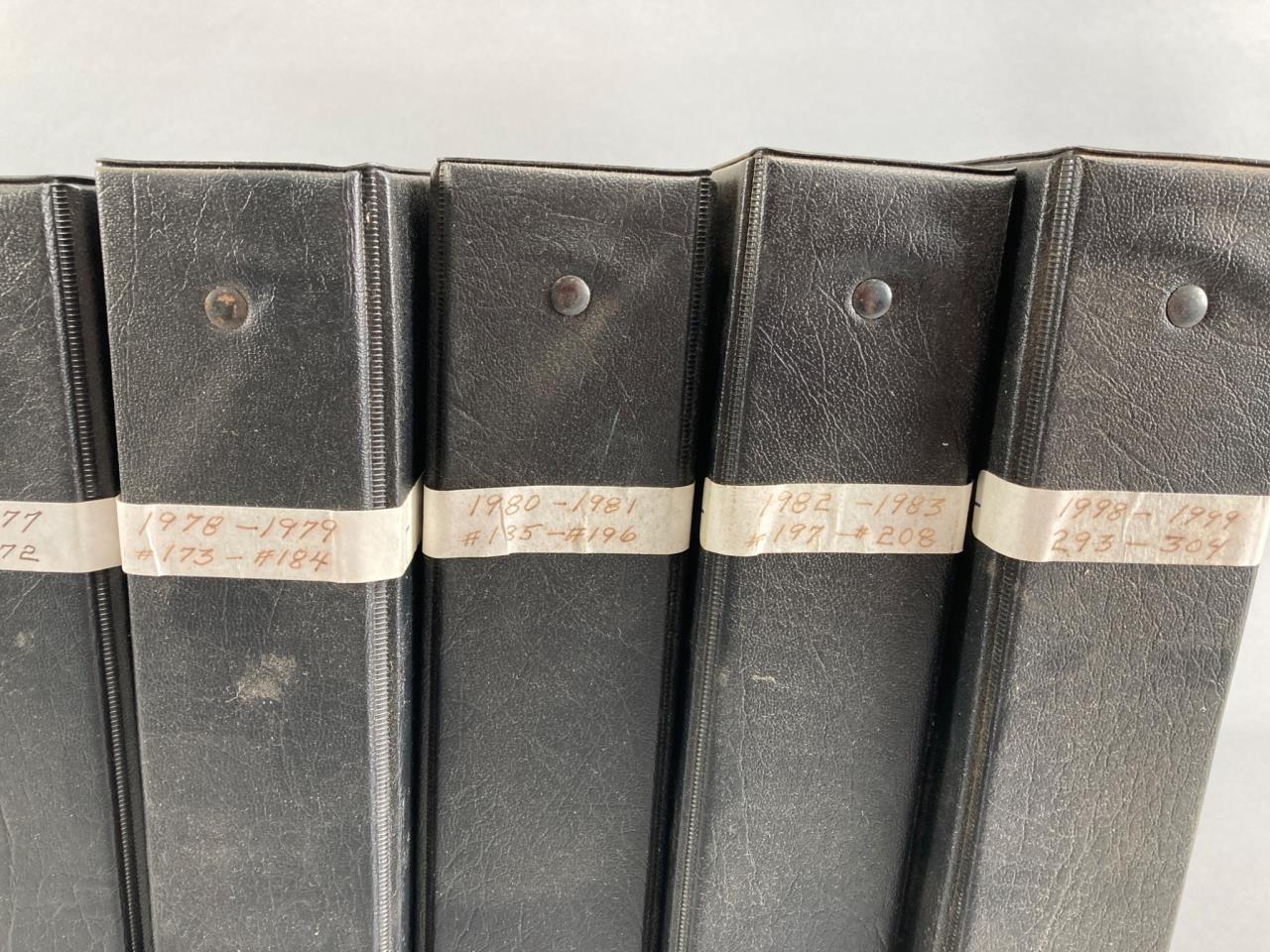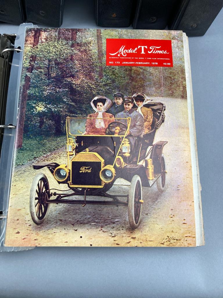 Model T Times magazines, spanning various years as noted on binder labels. Includes black binders with labeled spines. Publications are related to vintage Ford Model T cars. Binders and magazines show signs of normal wear.