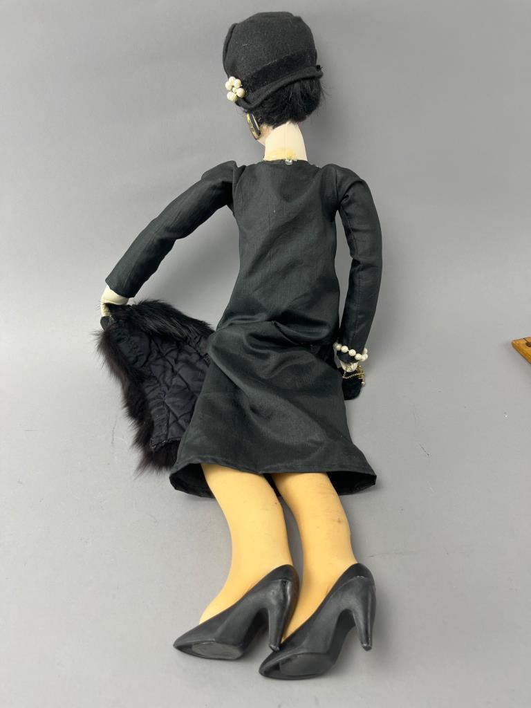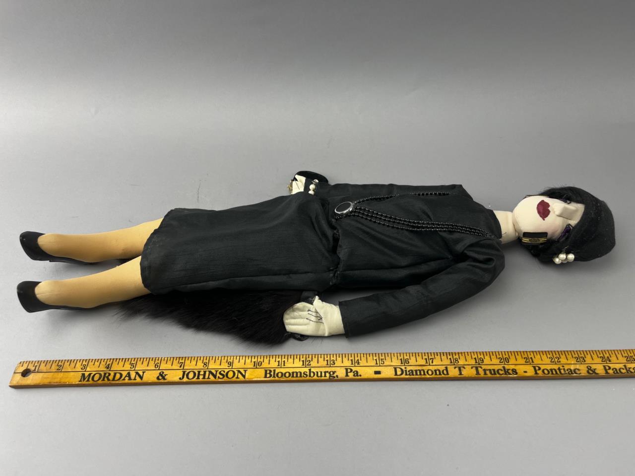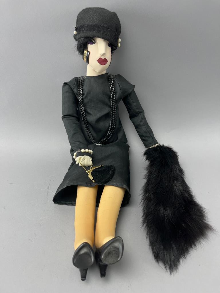 Handcrafted fabric doll featuring a black dress, matching hat, faux pearl accessories, and a fur-like stole. Includes additional details such as painted facial features and black high-heeled shoes.