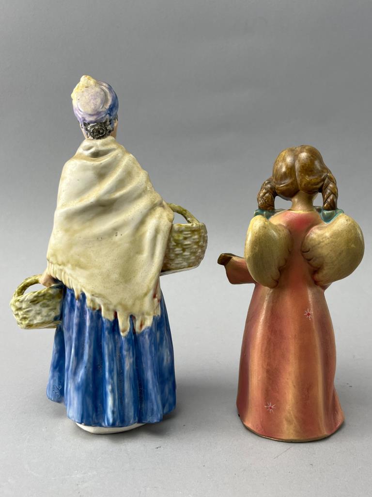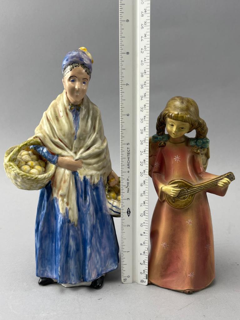 Ceramic figurines comprising an angel with a lute and a woman with baskets. Hand-painted details.