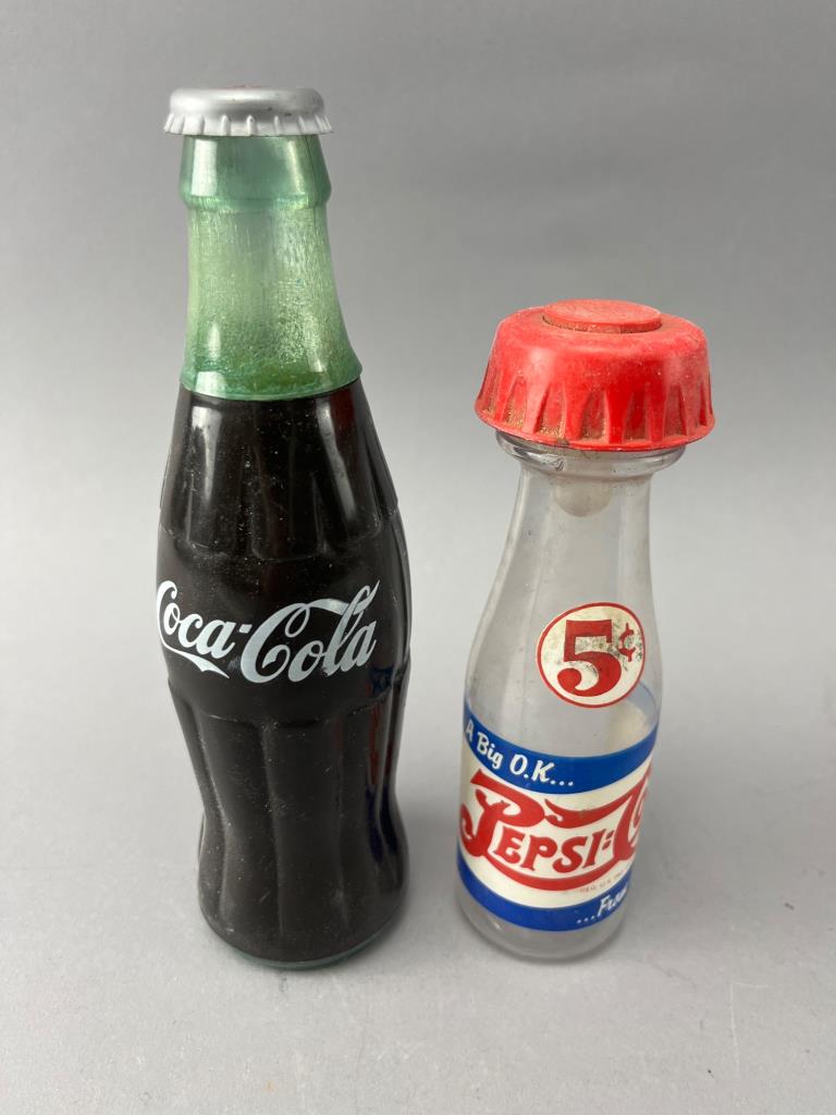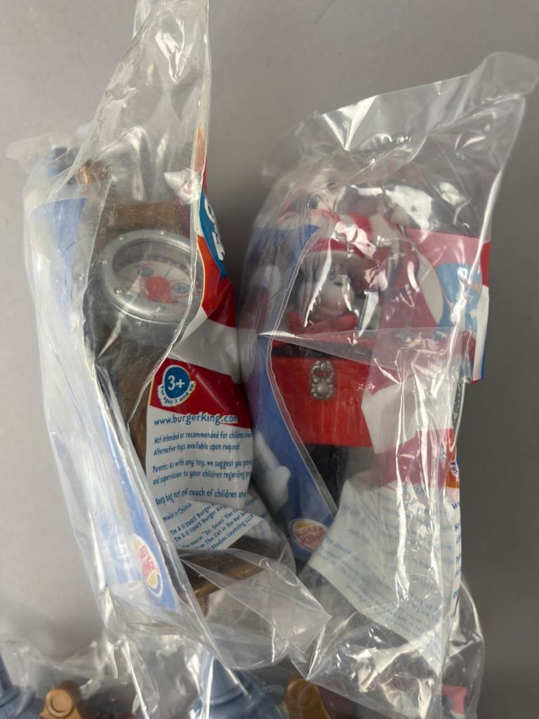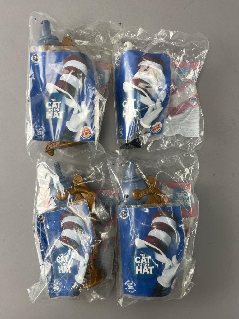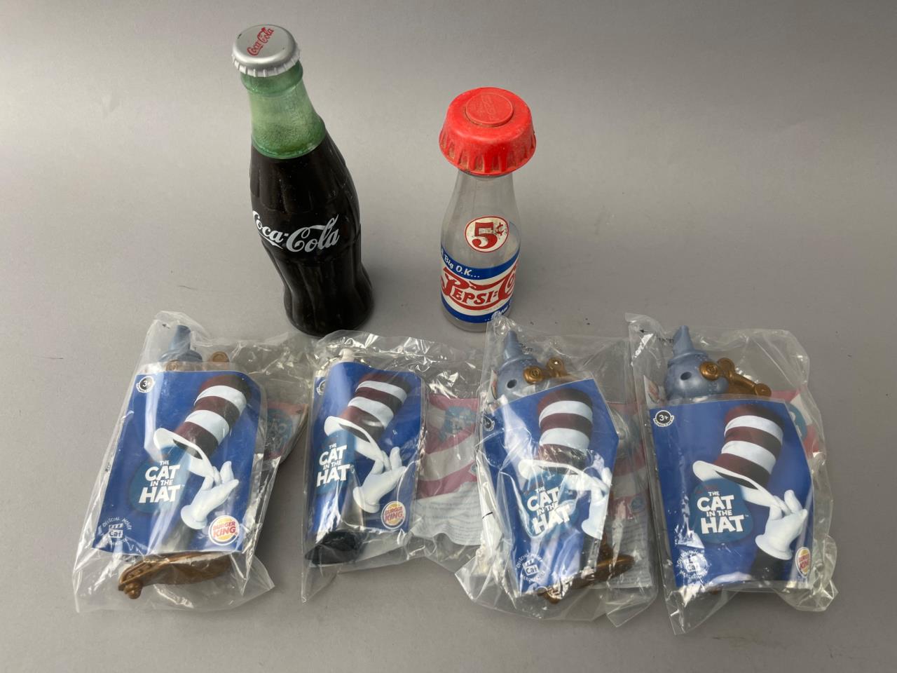 Includes a Coca-Cola bottle, a Pepsi Big O.K. bottle, and four sealed Burger King Cat in the Hat toys. Bottles are collectible replicas. Toys are in original packaging.