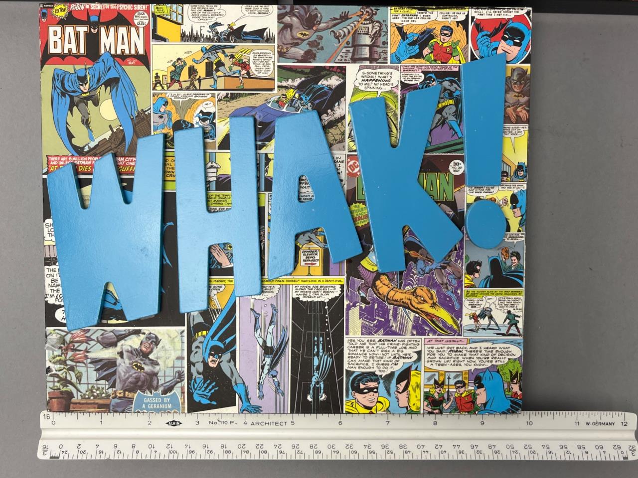 Three wood-framed wall plaques featuring Batman comic backgrounds with raised comic-style text reading ‘POW!’, ‘ZAP!’, and ‘WHAK!’. MDF construction with printed designs. Hanging hardware on the back.