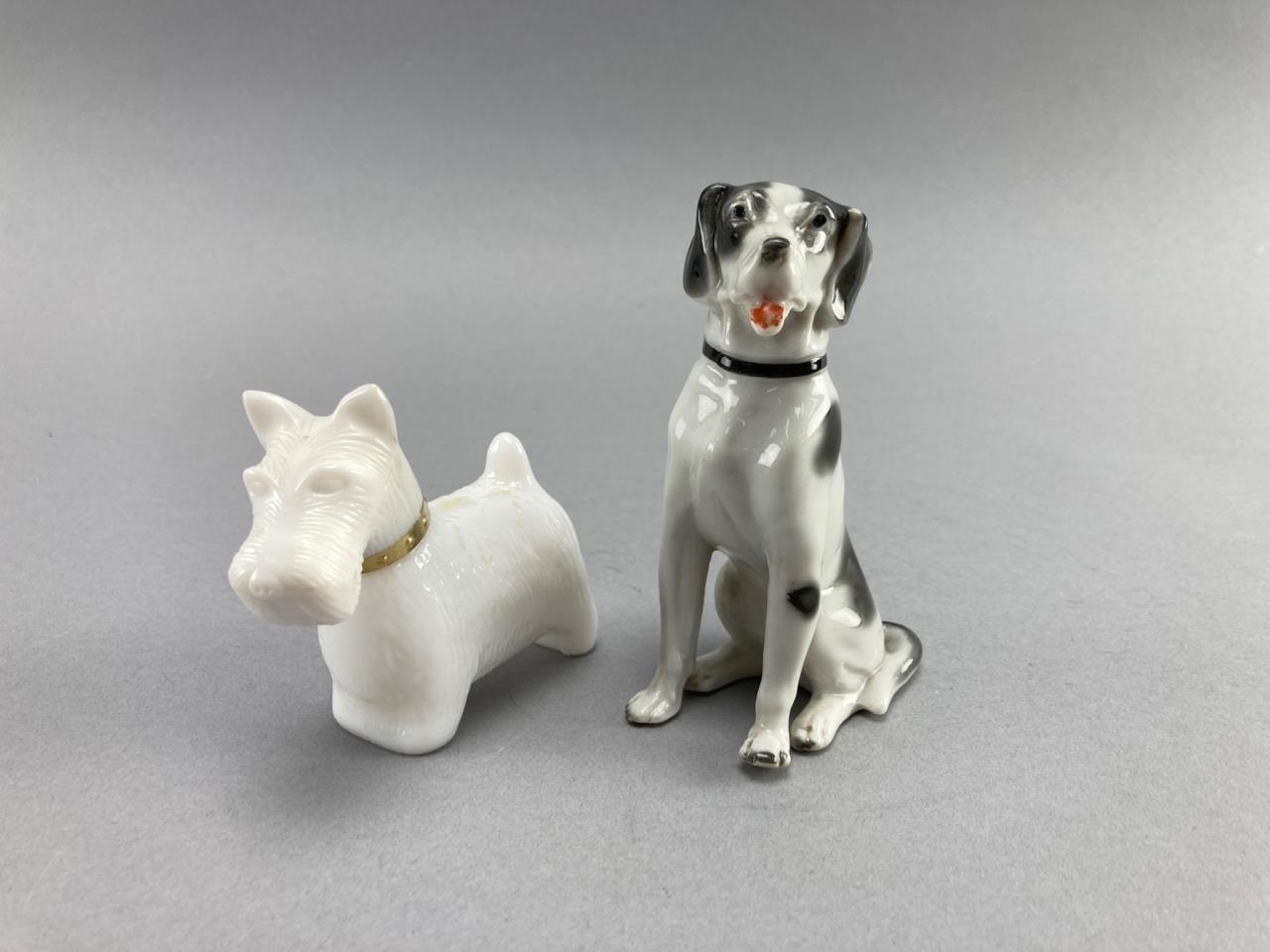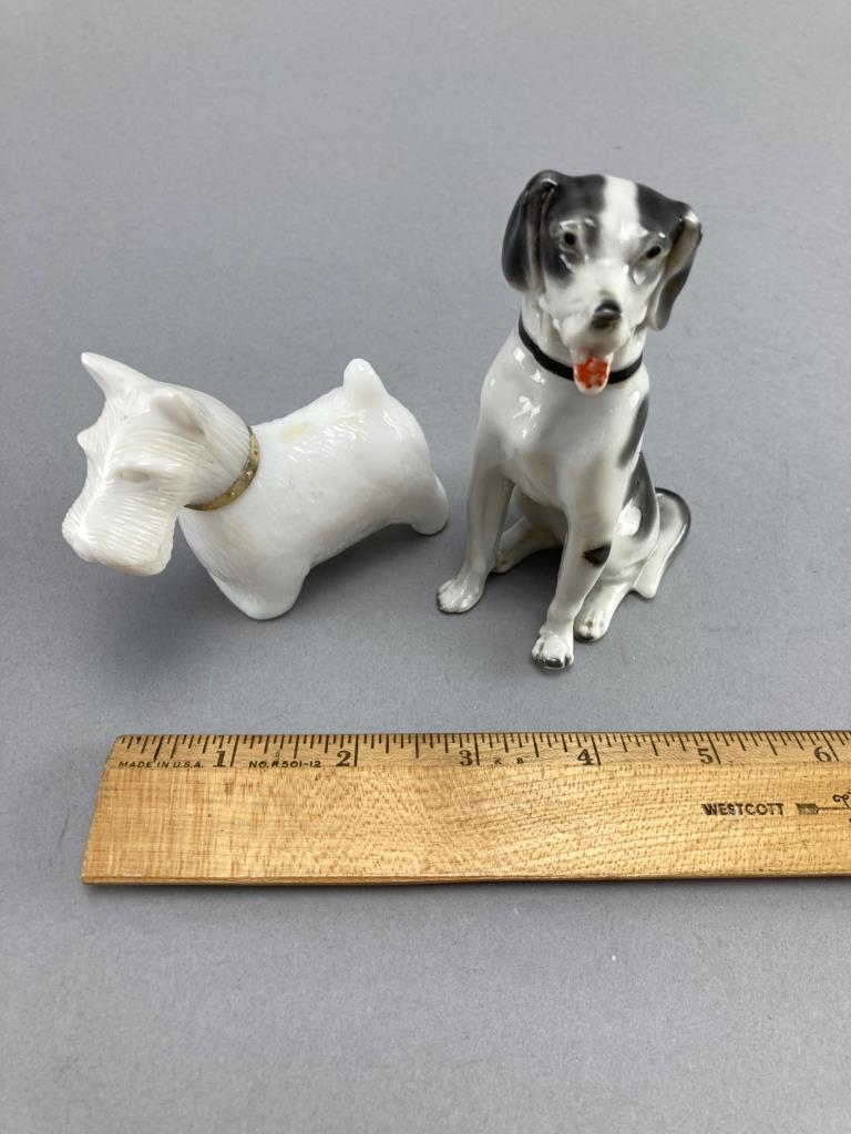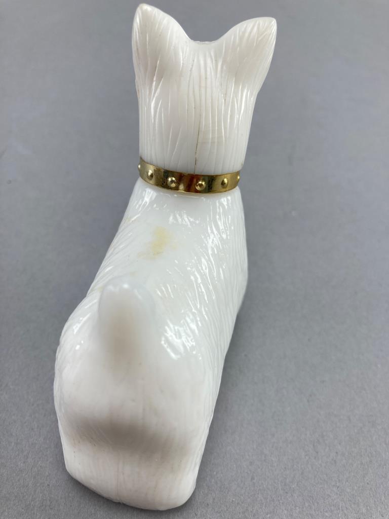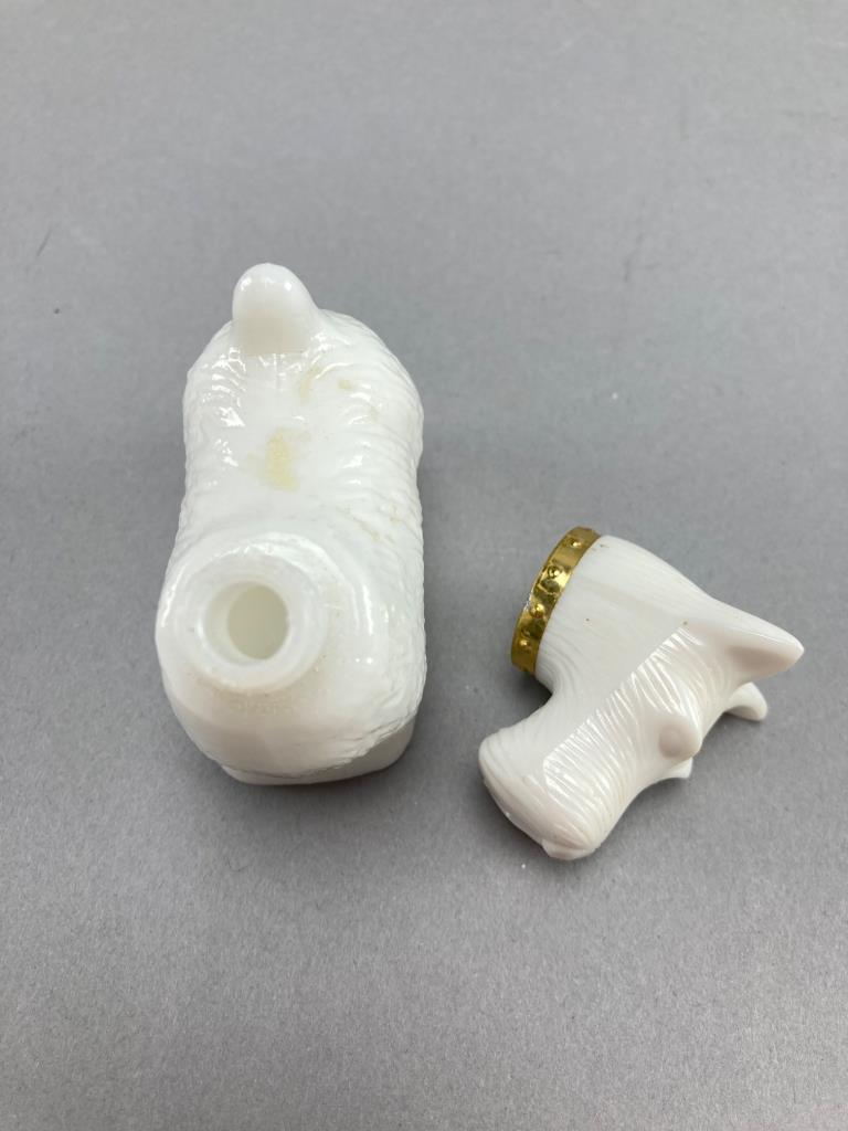 Includes an Avon milky white glass Scotty dog cologne bottle with a removable head and embossed base, and a second ceramic sitting dog figurine with painted black and white details.