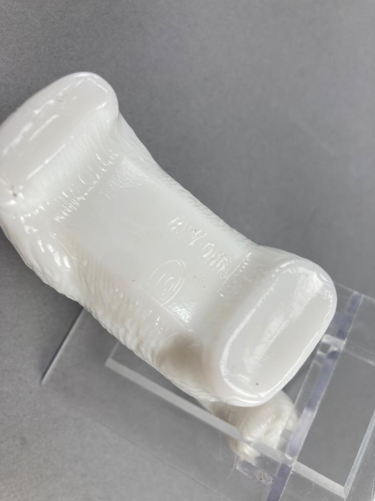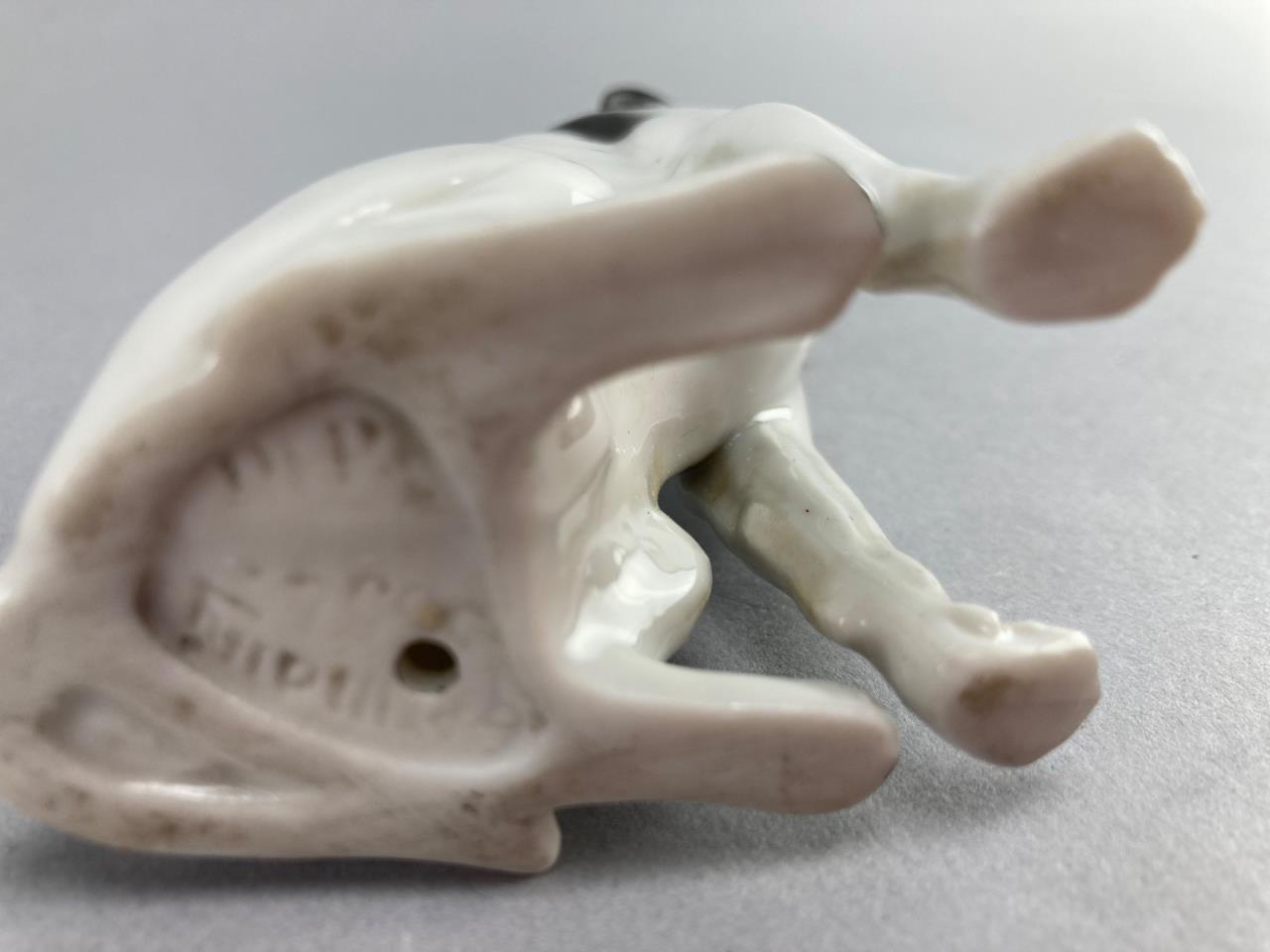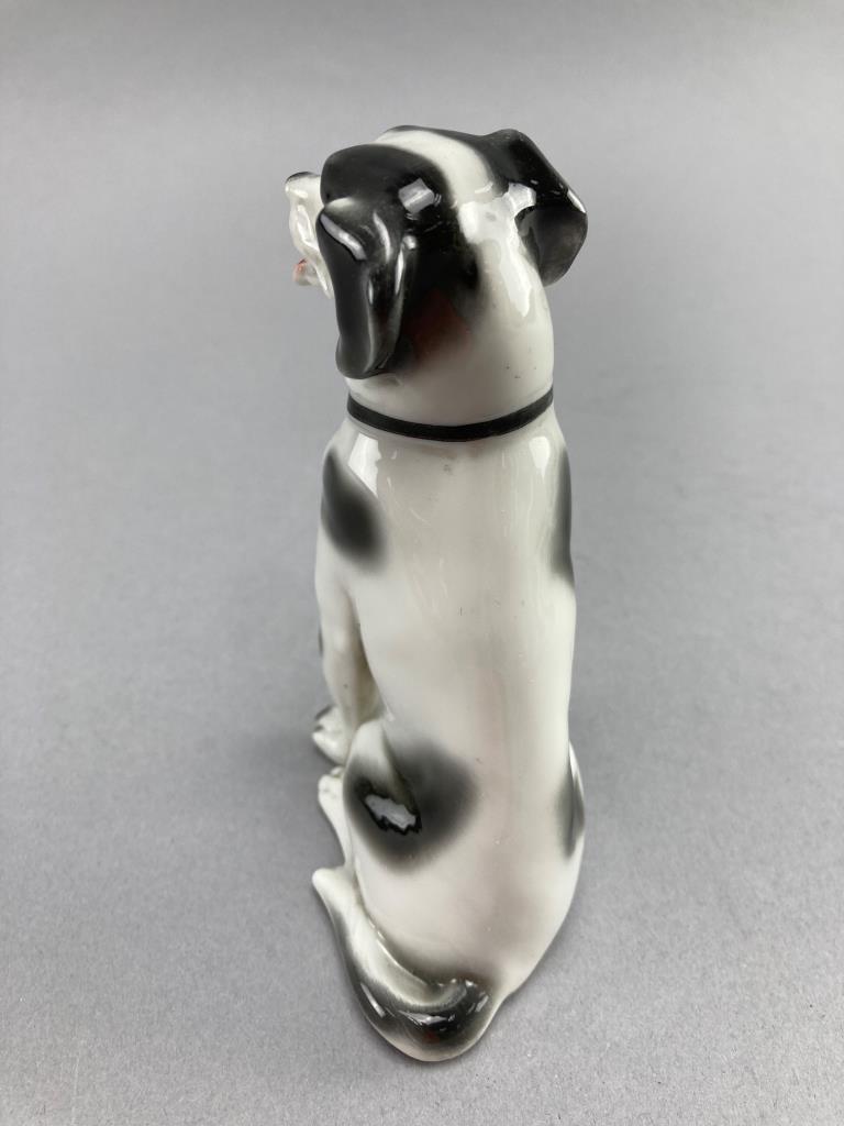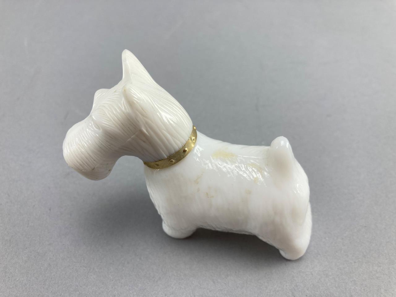 Includes an Avon milky white glass Scotty dog cologne bottle with a removable head and embossed base, and a second ceramic sitting dog figurine with painted black and white details.
