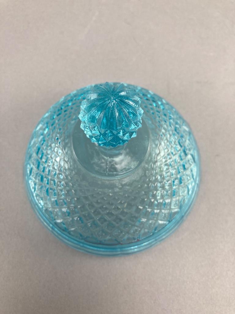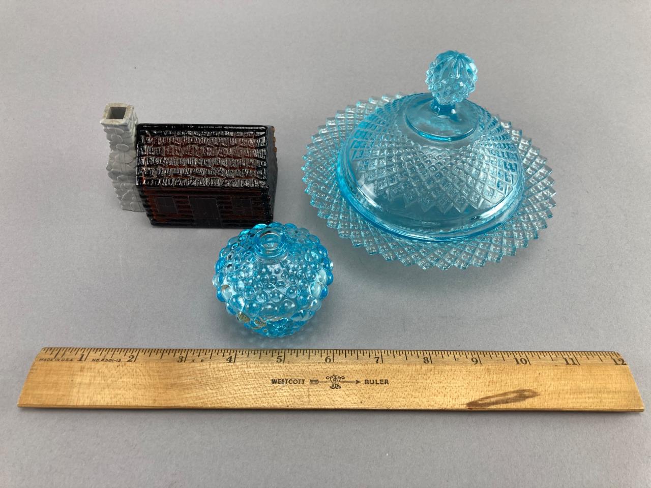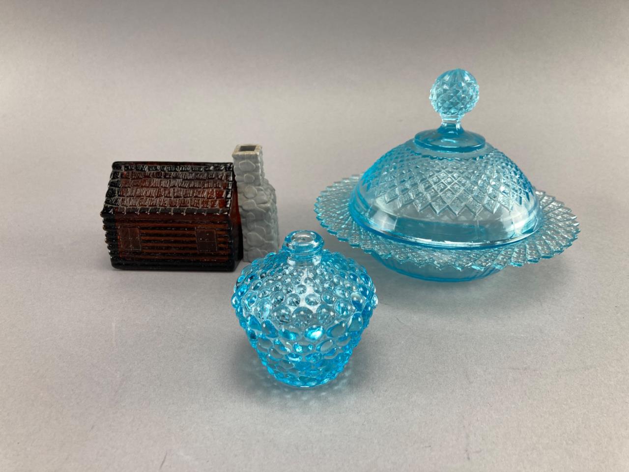 Includes a blue glass lidded dish with diamond pattern, a blue hobnail glass jar, and an Avon ‘Wild Country’ aftershave bottle shaped like a log cabin with removable chimney cap. The glass shows intricate detailing.