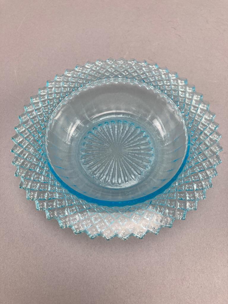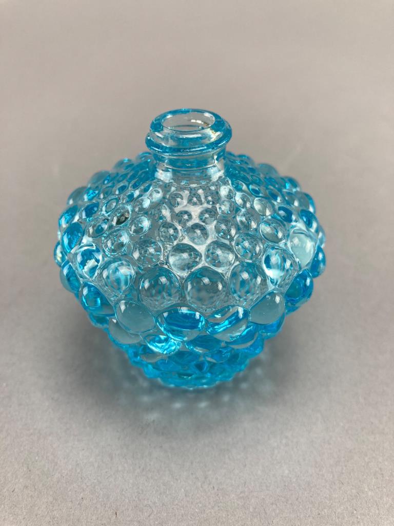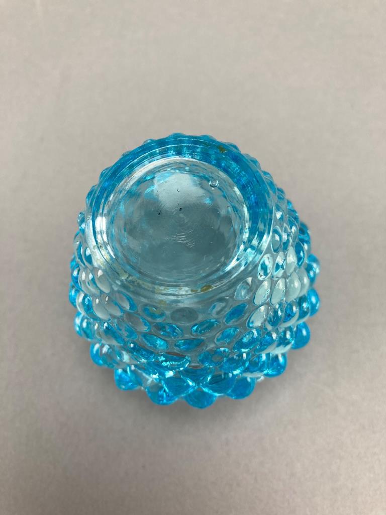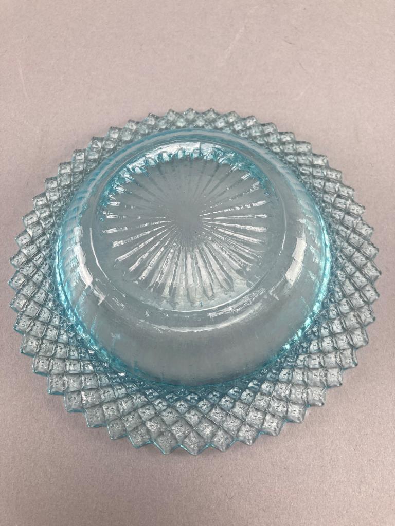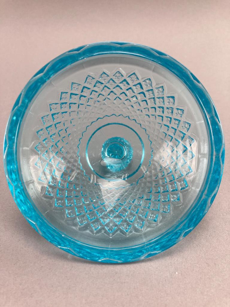 Includes a blue glass lidded dish with diamond pattern, a blue hobnail glass jar, and an Avon ‘Wild Country’ aftershave bottle shaped like a log cabin with removable chimney cap. The glass shows intricate detailing.