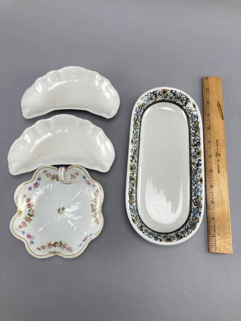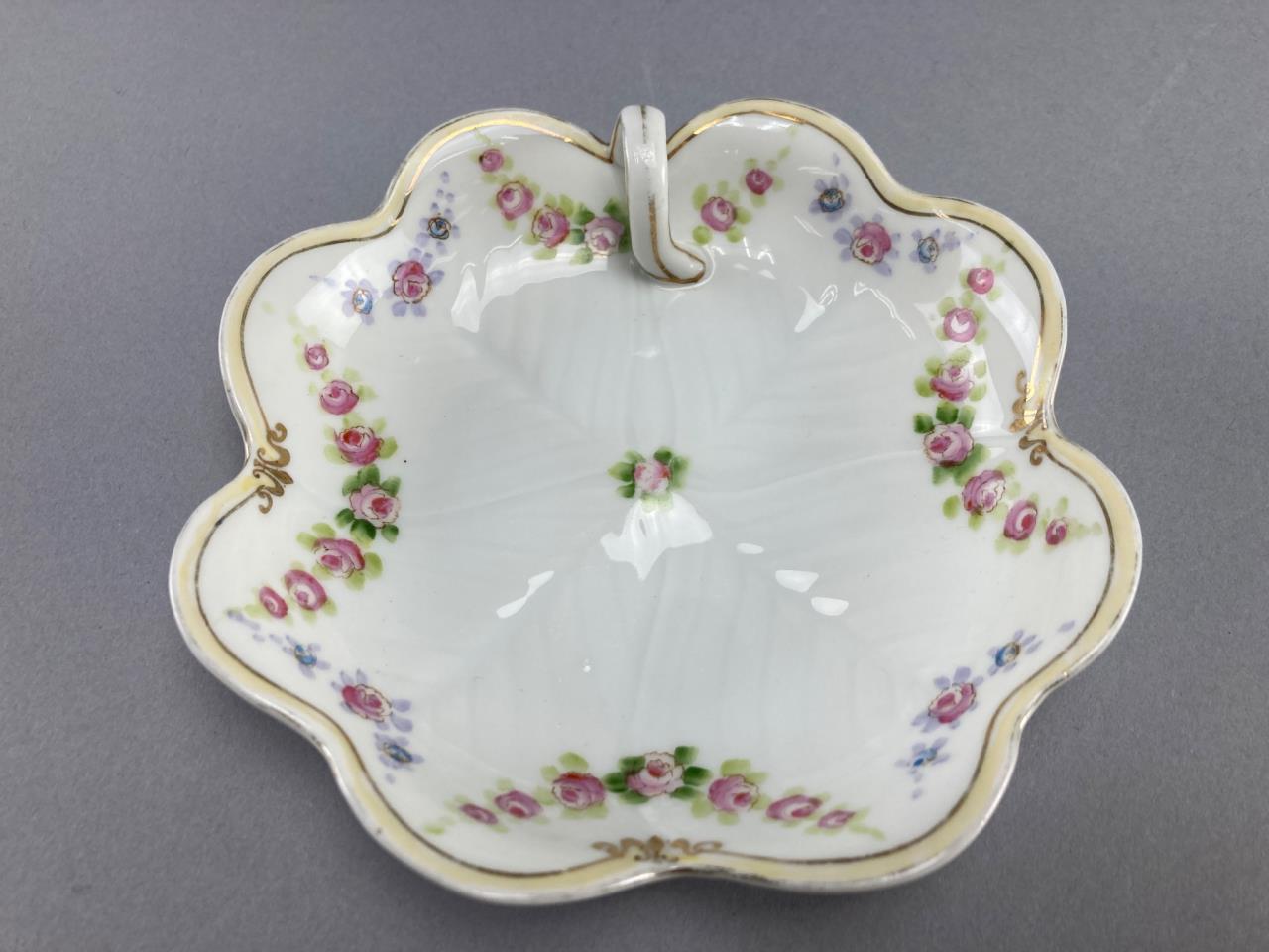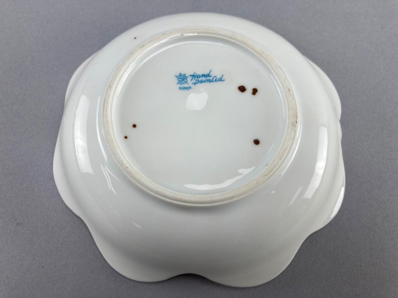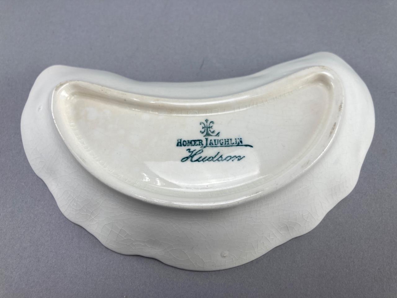 Four ceramic items including two Homer Laughlin ‘Hudson’ bone dishes, one Nippon hand-painted floral dish with a handle, and one Shenango China oval tray with floral border. Minor chip on one bone dish. Marks visible on back.