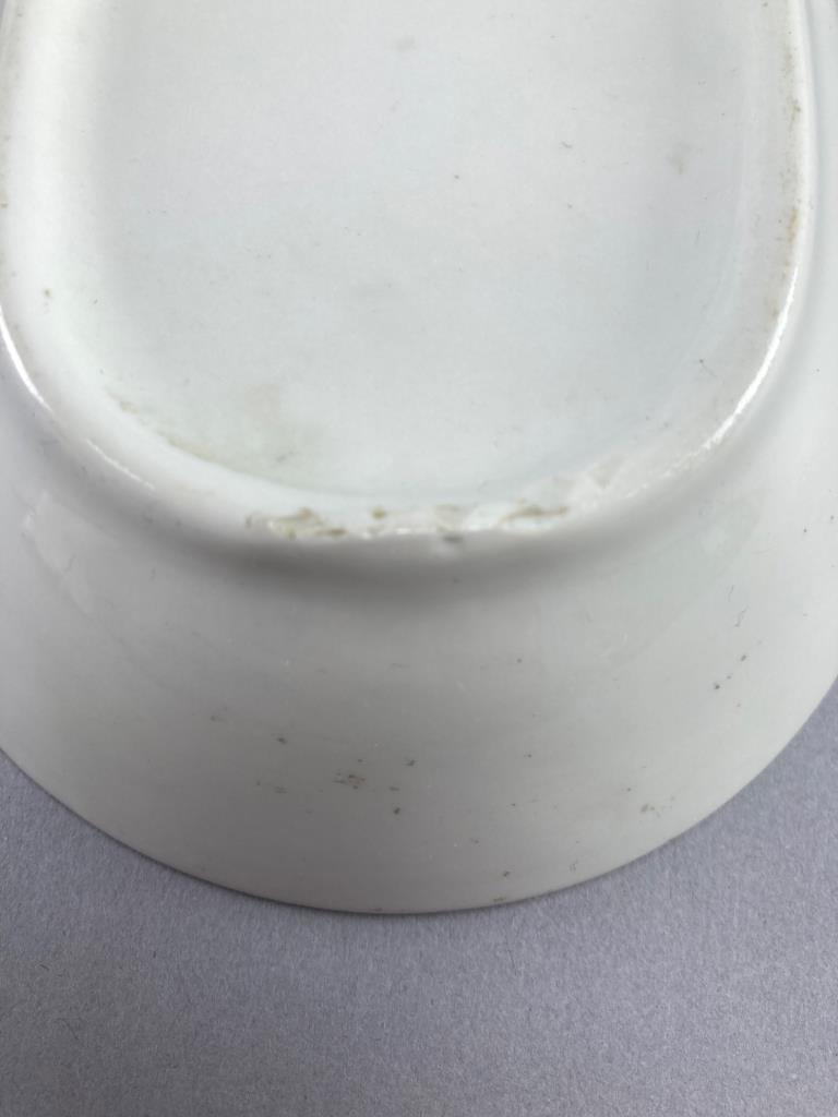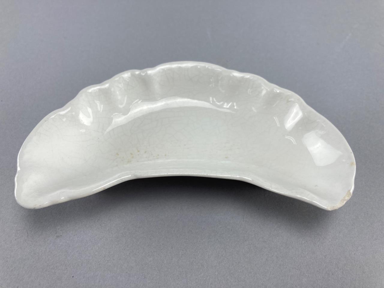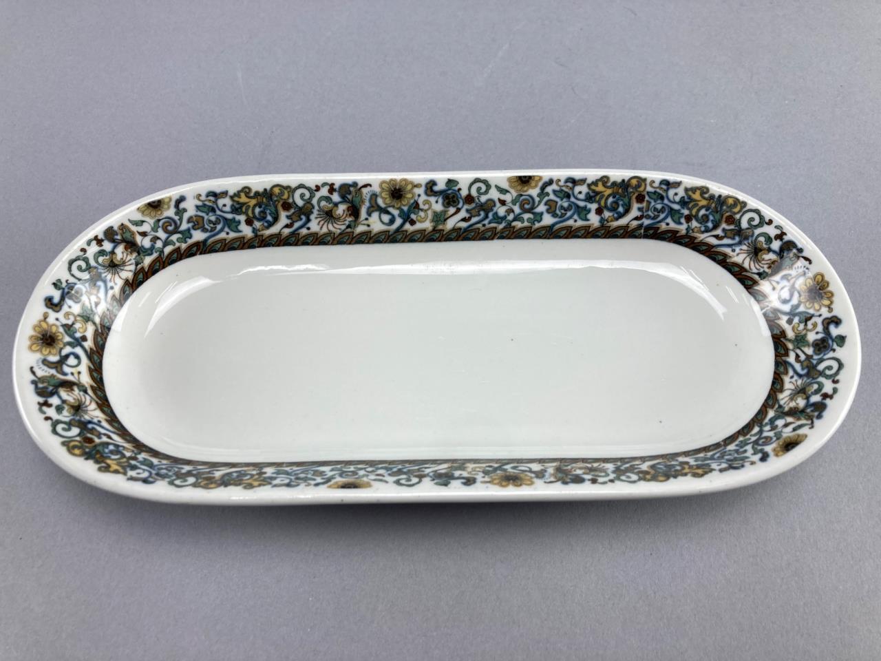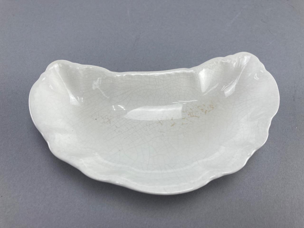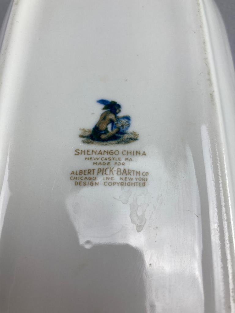 Four ceramic items including two Homer Laughlin ‘Hudson’ bone dishes, one Nippon hand-painted floral dish with a handle, and one Shenango China oval tray with floral border. Minor chip on one bone dish. Marks visible on back.