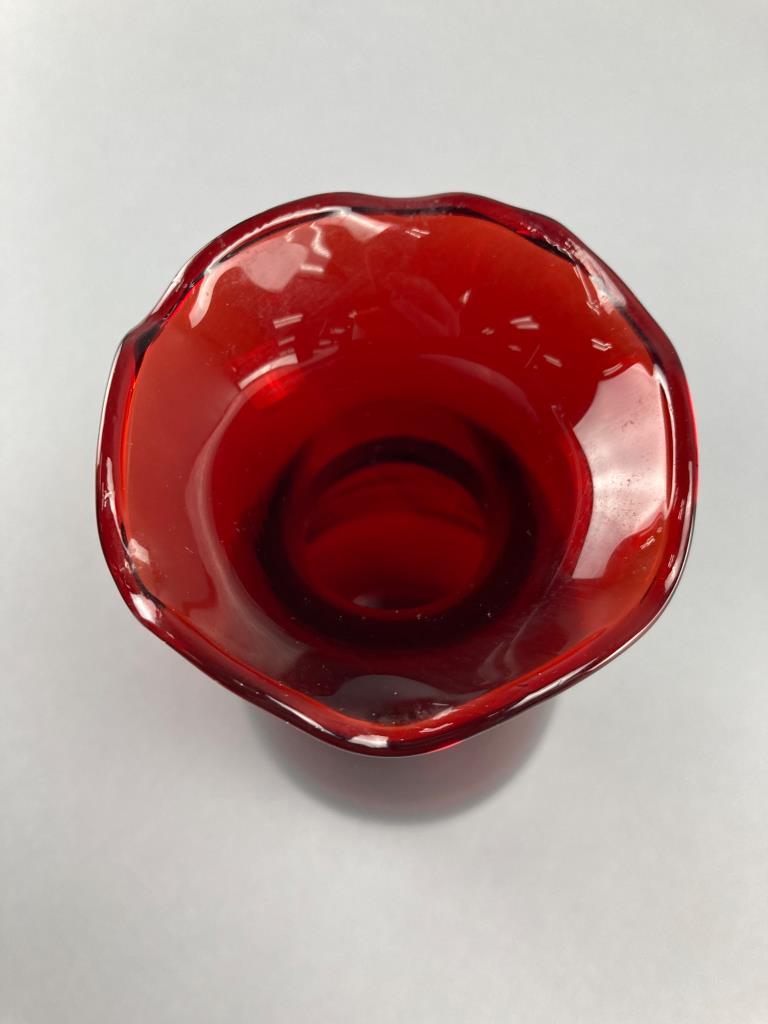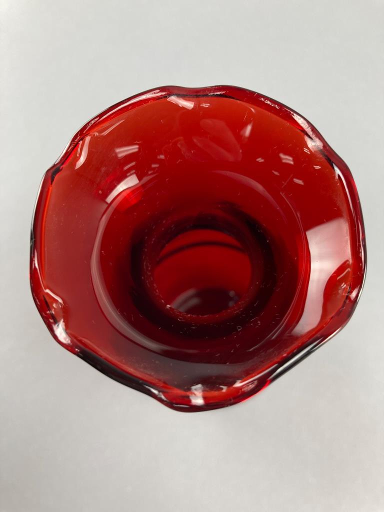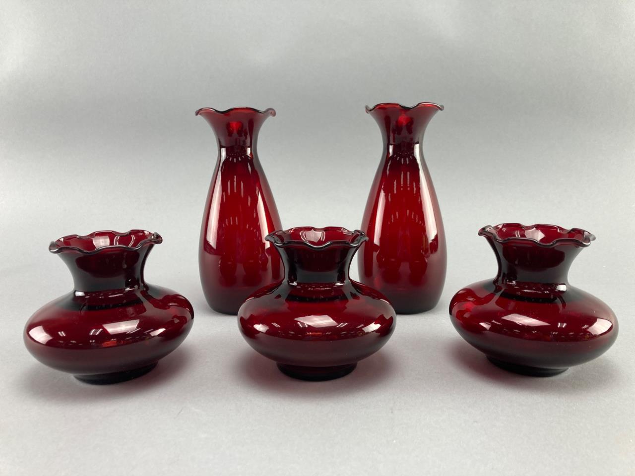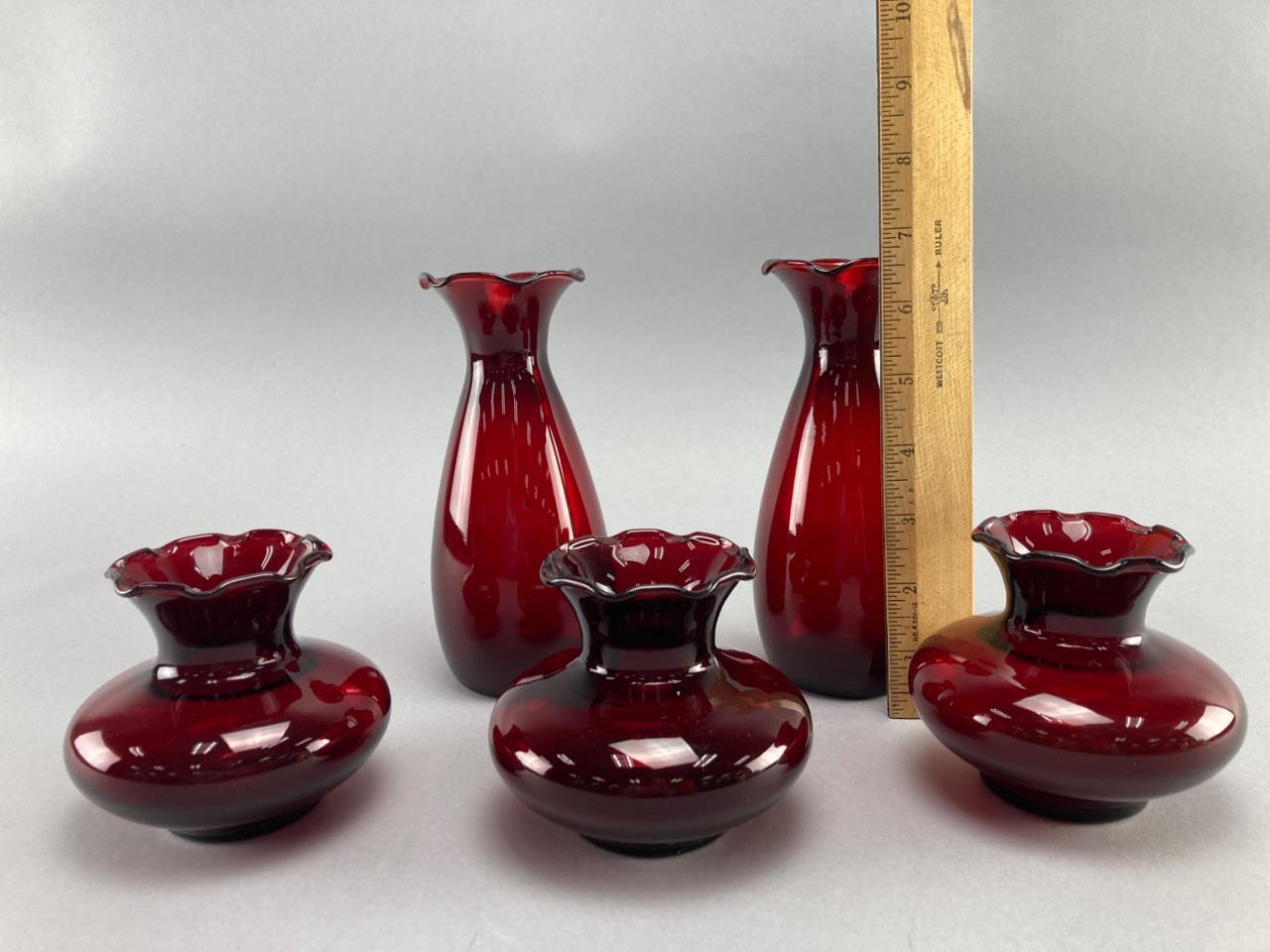 Five red glass vases with ruffled rims and varying shapes. Includes three short, rounded vases and two taller, slender vases.