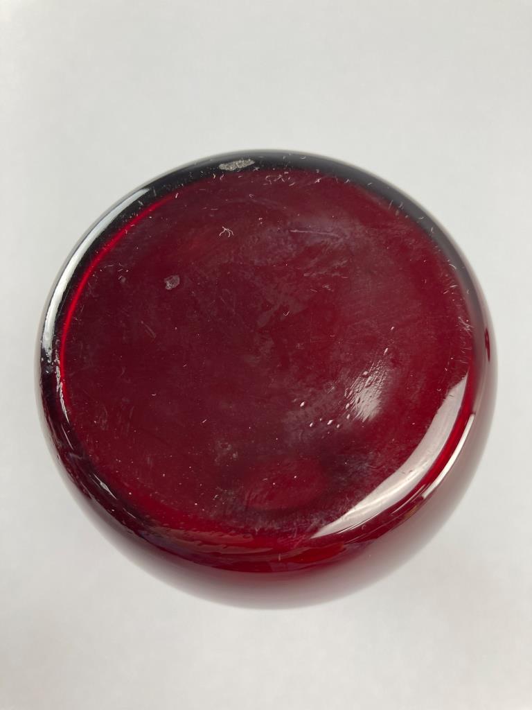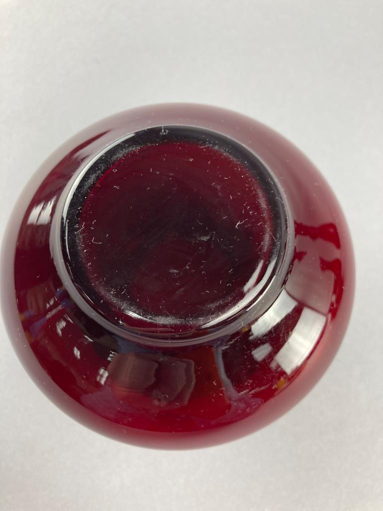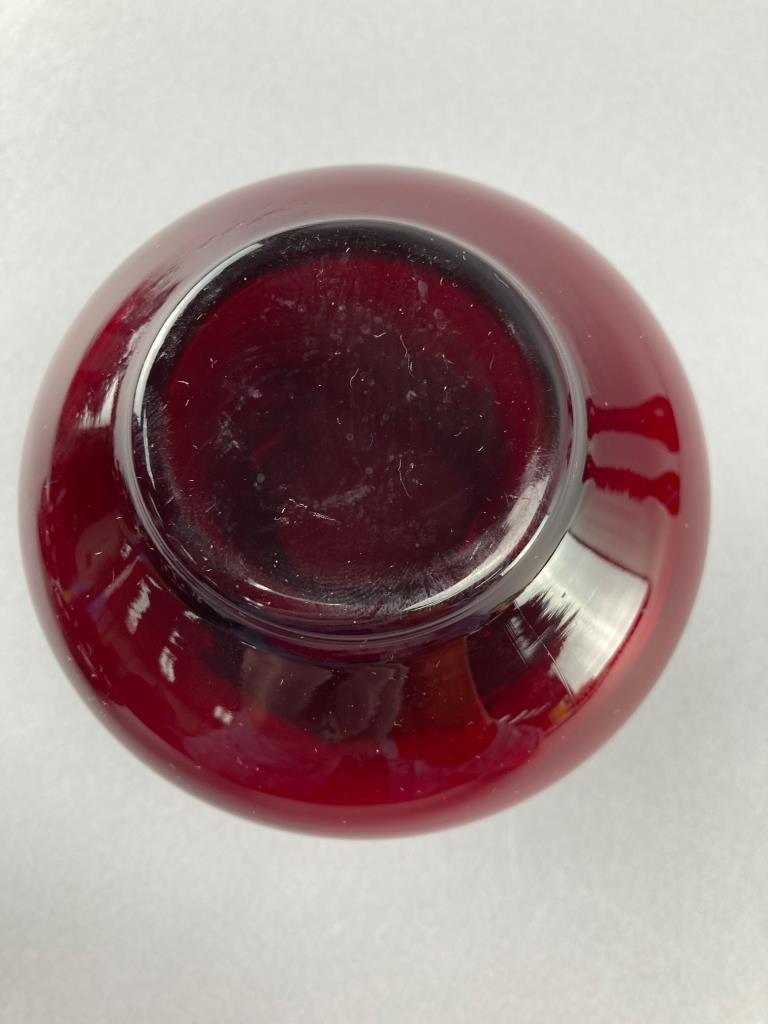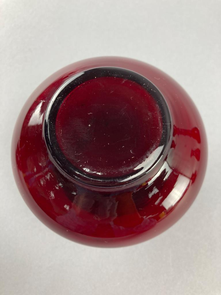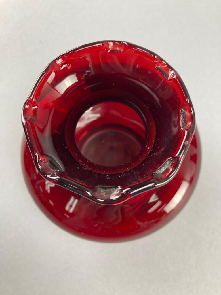 Five red glass vases with ruffled rims and varying shapes. Includes three short, rounded vases and two taller, slender vases.