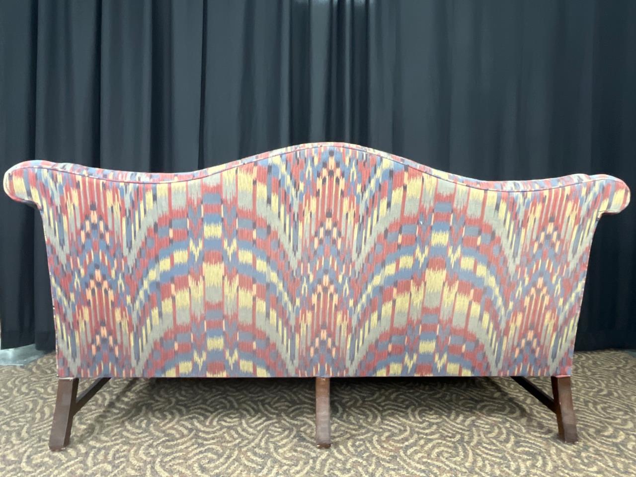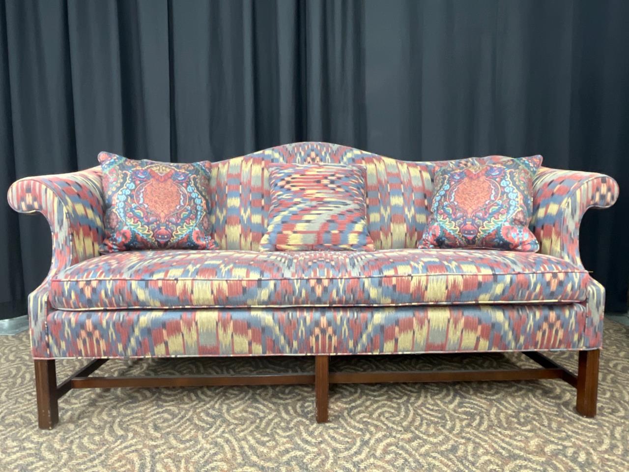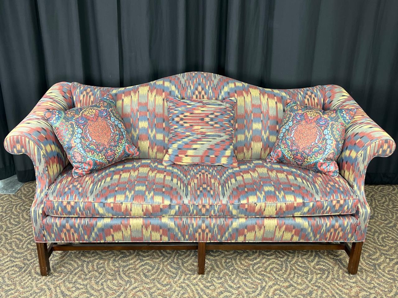 Curved-back sofa upholstered in multicolor patterned fabric with three included matching cushions. Supported by wood legs. Couch measures 74″ x 33″ x 36″.